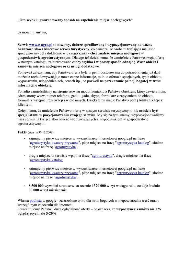 „Oto szybki i gwarantowany sposób na zapełnienie miejsc noclegowych” Szanowni Państwo, Serwis www.e-agro.pl to niszowy, dobrze sprofilowany i wypozycjonowany na ważne branżowo słowa kluczowe serwis turystyczny, co oznacza, że osoba tu trafiająca ma jasno sprecyzowany cel i dokładnie wie czego szuka - chce znaleźć miejsca noclegowe w gospodarstwie agroturystycznym. Dlatego też dzięki temu, że zamieścicie Państwo swoją ofertę w naszym katalogu, zainteresowane osoby szybko i w prosty sposób odnajdą Wasz obiekt i zamówią miejsca noclegowe oraz usługi dodatkowe. Ponieważ zależy nam, aby Państwa oferta była w pełni dostosowana do potrzeb klienta już dziś możecie rozbudowywać ją o nowe cenne informacje, m.in. o ofertach specjalnych, typie obiektu, wyposażeniu, udogodnieniach, cenach itp., co pozwoli na przekazanie pełnej, bogatej w treści informacji o obiekcie. Ponadto zamieściliśmy na stronie serwisu moduł kontaktu z Państwa obiektem, który zawiera m.in. adres strony www, numer telefonu, gadu - gadu, skype, formularz z zapytaniem do obiektu, formularz wstępnej rezerwacji i wiele innych. Dzięki temu macie Państwo pełną komunikację z klientem. Dzięki temu, że umieścicie Państwo ofertę w naszym serwisie turystycznym, nie musicie być specjalistami w pozycjonowaniu swojego serwisu. My się na tym znamy, wypozycjonowaliśmy nasz serwis na tysiące słów kluczowych związanych z wypoczynkiem w gospodarstwie agroturystycznym. Fakty (stan na 30.12.2008): • zajmujemy pierwsze miejsce w wyszukiwarce internetowej google.pl na frazę "agroturystyka kwatery prywatne", piąte miejsce na frazę "agroturystyka katalog", siódme miejsce na frazę "agroturystyka", • drugie miejsce w serwisie wp.pl na frazę "agroturystyka", drugie miejsce na frazę "agroturystyka katalog • zajmujemy pierwsze miejsce w wyszukiwarce internetowej google.pl na frazę "agroturystyka kwatery prywatne", piąte miejsce na frazę "agroturystyka katalog", siódme miejsce na frazę "agroturystyka", • 8 500 000 wywołań stron serwisu rocznie i 370 000 wizyt w ciągu roku, co daje średnio 30 000 wizyt miesięcznie. Własna podlista w google - zastrzeżone tylko dla stron bogatych w niepowtarzalną treść oraz o szczególnym znaczeniu dla internetu. Gwarantujemy Państwu dużą oglądalność oferty – co oznacza, że wypoczynek zamówi nie 2% oglądających, ale 5-20%. Jednocześnie pragniemy Państwa poinformować, że za utrzymanie oferty w serwisie obowiązuje opłata roczna w wysokości jedynie 122 zł brutto, co pozwoli na obszerniejszą rozbudowę serwisu i optymalizację funkcjonalności. Chcemy również podkreślić, że udzielamy Państwu rocznej bezwarunkowej gwarancji satysfakcji, co oznacza, że macie Państwo dokładnie 365 dni na przetestowanie naszej oferty. Jeżeli jednak w którymkolwiek momencie, w ciągu tych 365 dni dojdziecie do wniosku, że nie Jesteście usatysfakcjonowani i powiadomicie nas o tym, my zwrócimy pieniądze. Z pewnością, jeżeli ktoś szuka gospodarstwa agroturystycznego, trafia do naszego serwisu, co na pewno przynosi Państwu wymierne korzyści w postaci sprzedaży miejsc noclegowych i usług dodatkowych. Dodaj obiekt już teraz Z wyrazami szacunku Zenon Lubiński Specjalista ds. marketingu Zapoznaj się z regulaminem i polityką prywatności serwisu www.e-agro.pl.