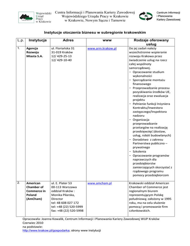 Centra Informacji i Planowania Kariery Zawodowej Wojewódzkiego Urzędu Pracy w Krakowie w Krakowie, Nowym Sączu i Tarnowie Instytucje otoczenia biznesu w subregionie krakowskim L.p. Instytucja Adres www Rodzaje oferowany usług 1. Agencja Rozwoju Miasta S.A. ul. Floriańska 31 31-019 Kraków 12/ 429-25-13 12/ 429-10-40 www.arm.krakow.pl Do jej zadań należy wszechstronne wspieranie rozwoju Krakowa przez świadczenie usług na rzecz całej wspólnoty samorządowej. - Opracowanie studium wykonalności - Sporządzanie montażu finansowego - Przeprowadzanie procesu pozyskiwania środków UE, realizacja oraz ewaluacja projektu - Pełnienie funkcji Inżyniera Kontraktu/Inwestora zastępczego/Inspektora nadzoru - Organizacja przeprowadzanie przetargów na realizację przedsięwzięć (dostaw, usług, robót budowlanych) - Doradztwo z zakresu Partnerstwa publiczno – prywatnego - Szkolenia - Opracowanie programów naprawczych dla przedsiębiorstw zamierzających skorzystać z rządowego programu pomocy przedsiębiorcom 2. American Chamber of Commerce in Poland (AmCham) ul. E. Plater 53 00-113 Warszawa oddział Kraków : Monika Pilarska, Director tel: 48 608 027 172 tel: +48 (22) 520-5999 fax: +48 (22) 520-5998 www.amcham.pl Krakowski oddział American Chamber of Commerce jest regionalnym biurem reprezentującym Polskę południową; założony w 1995 roku, ma na celu służenie pomocą i promowanie firm członkowskich. Opracowała: Joanna Kowalik, Centrum Informacji i Planowania Kariery Zawodowej WUP Kraków Czerwiec 2010 na podstawie: http://www.krakow.pl/gospodarka; strony www instytucji Centra Informacji i Planowania Kariery Zawodowej Wojewódzkiego Urzędu Pracy w Krakowie w Krakowie, Nowym Sączu i Tarnowie 3. BrytyjskoPolska Izba Handlowa 4. Business Centre Club Loża Małopolska BCC Fundacja Krakowski Instytut Nieruchomości 5. ul. św. Anny 9 31-008 Kraków 12/ 423-08-88 12/ 422-42-67 ul. Zwierzyniecka 29, 31-105 Kraków 12/ 431-05-38 12/ 421-72-14 12/ 431-05-38 ul. Rakowicka 27 31-510 Kraków, tel./fax: 12 294 49 50 6. Fundacja ul. Bracka 6/6 Partnerstwo 31-005 Kraków dla Środowiska 12/ 422-50-88 12/ 430-24-43 12/ 430-24-65 12/ 429-47-25 7. Fundacja Promocji Gospodarczej Regionu Krakowskiego ul. Mrozowa 20a 30-969 Kraków 12/ 642-17-04 12/ 642-16-70 12/ 642-17-03 12/ 644-53-06 www.bpcc.org.pl Wspiera rozwój stosunków gospodarczych między Polską i Wielką Brytanią. www.bcc.org.pl Spółka zarządzająca Specjalną Strefą Ekonomiczną Krakowskim Parkiem Technologicznym (SSE-KPT). www.kin.org.pl Podejmuje inicjatywy i wspiera przedsięwzięcia związane z rynkiem nieruchomości w dziedzinie prac naukowobadawczych, kształcenia kadr, działalności wydawniczej i promocji. www.epce.org.pl Wspiera inicjatywy służące rozwojowi społecznemu i gospodarczemu, oparte na dziedzictwie przyrodniczym i kulturowym, przy jednoczesnym zachowaniu i kształtowaniu jego walorów. Pomaga małym i średnim firmom wprowadzać ekologiczne zasady funkcjonowania. www.fpgrk.krakow.pl Wspiera rozwój regionu krakowskiego oraz wzmacnia i promuje jego potencjał ekonomiczny. Do jej zadań należy również współpraca z partnerami zagranicznymi w dziedzinie promocji gospodarczej regionu krakowskiego za granicą, a także pomoc w nawiązywaniu kontaktów gospodarczych Opracowała: Joanna Kowalik, Centrum Informacji i Planowania Kariery Zawodowej WUP Kraków Czerwiec 2010 na podstawie: http://www.krakow.pl/gospodarka; strony www instytucji Centra Informacji i Planowania Kariery Zawodowej Wojewódzkiego Urzędu Pracy w Krakowie w Krakowie, Nowym Sączu i Tarnowie 8. Fundusz Mikro Sp. z o.o. Przedstawiciels two Lokalne w Krakowie ul. Królewska 2 30-045 Kraków 12/ 633-12-12 12/ 423-34-27 9. Holenderskie Biuro Biznesu Netherlands Business Support Office (NBSO) Ul. Sławkowska 23/3a 31-016 Kraków tel: 12-432-37-10 fax: 12-432-37-12 [email protected] 10. Inicjatywa Mikro 11. Izba PrzemysłowoHandlowa al. Krasińskiego 11a IVp. 31-111 Kraków 12/ 427-03-46 12/ 427-03-93 12/ 422-42-57 ul. Floriańska 3 31-019 Kraków 12/ 422-89-07 12/ 422-13-74 12. Euro Info Centre PL413 ul. Floriańska 3 31-019 Kraków, 12/ 422-89-07 12/ 422-55-67 www.funduszmikro.com.pl Realizuje program wspierania rozwoju mikroprzedsiębiorczości w Polsce, przede wszystkim przez udostępnianie kapitału w formie pożyczek dla małych firm. www.hollandtrade.com Służy pomocą firmom holenderskim działającym na terenie południowej Polski i udziela polskim przedsiębiorcom informacji na temat holenderskiego rynku gospodarczego. www.inicjatywamikro.pl Udziela pożyczek na rozwój prywatnego sektora małych przedsiębiorstw. www.iph.krakow.pl Organizacja samorządu gospodarczego reprezentująca interesy gospodarcze zrzeszonych w niej podmiotów w zakresie ich działalności gospodarczej. Jednym z głównych zadań izby jest prowadzenie działalności doradczej dla firm polskich i zagranicznych. Oferuje następujące usługi: wzajemne pozyskiwanie inwestorów, wymiana informacji gospodarczej i handlowej, kojarzenie partnerów do współpracy gospodarczej. www.euroinfo.org.pl, www.iph.krakow.pl Projekt Euro Info Centre jest jednym z głównych narzędzi Komisji Europejskiej wykorzystywanym do realizowania polityki wspierania rozwoju małych i średnich przedsiębiorstw. Ośrodek Euro Info Centre w Krakowie (PL413) jest jednym z 12 w naszym kraju; działa przy Opracowała: Joanna Kowalik, Centrum Informacji i Planowania Kariery Zawodowej WUP Kraków Czerwiec 2010 na podstawie: http://www.krakow.pl/gospodarka; strony www instytucji Centra Informacji i Planowania Kariery Zawodowej Wojewódzkiego Urzędu Pracy w Krakowie w Krakowie, Nowym Sączu i Tarnowie Izbie Przemysłowo-Handlowej w Krakowie. Działalność Izby koncentruje się głównie na współdziałaniu z organami władzy rządowej, samorządowej i lokalnej w zakresie tworzenia warunków do rozwoju turystyki w Krakowie i regionie małopolskim oraz stwarzaniu warunków do rozwoju i pop