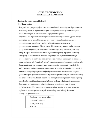 OPIS TECHNICZNY INSTALACJE SANITARNE 1.Instalacja wody zimnej i ciepłej 1.1. Dane ogólne Budynek zaopatrywany jest z wewnętrznej sieci wodociągowej przyłączem wodociągowym. Ciepła wody użytkowa z podgrzewaczy elektrycznych zlokalizowanych w sanitariatach na piętrach budynku Projektuje się wykonanie nowego odcinaka instalacji wodociągowej wody zimnej do nowo-projektowanego zlewozmywaka zlokalizowanego w pomieszczeniu socjalnym i toalety zlokalizowanej w dawnym pomieszczeniu natrysku. Ciepła woda dla zlewozmywaka z elektrycznego podgrzewacza przepływowego zlokalizowanego przy zlewozmywaku np. firmy Kospel. Nowe odcinki instalacji wodociągowej wpiąć do instalacji istniejącej w sanitariatach parteru. Projektuje się wykonanie instalacji wodociągowej z rur Pe-Xc (polietylen sieciowany), łączonych za pomocą złącz zaciskowych (pierścień pełny), z zastosowaniem kształtek mosiężnych. Rury montować za pomącą typowych systemów mocowań i zawiesi do sufitu parteru nad stropem podwieszonym. W miejscach podłączeń baterii i zaworów czerpalnych przewiduje się zastosowanie złączek metalowych gwintowanych- jako uszczelnienie łączników gwintowanych stosować taśmę lub pastę teflonową. Przed oddaniem do uzytkowania przeprowadzić próbę szczelności na ciśnienie robocze 1,5 raza większe od ciśnienia roboczego. Przewody prowadzone po wierchu ścian w przestrzeni nad stropem podwieszonym. Do zamocowania przewodów należy stosować uchwyty wykonane z tworzyw sztucznych lub z taśmy miedzianej. Rozstaw uchwytów przesuwnych: Średnica rury [mm] Max. odległość między uchwytami [m] 151,25 Na odgałęzieniach od przewodu rozdzielczego należy zamontować zawór odcinający kulowy. Armaturę zamocować na przewodzie w sposób zapewniający obustronne usztywnienie mocowanego elementu. W miejscach przejść rurociągów przez przegrody budowlane należy osadzić tuleje ochronne umożliwiające swobodne przemieszczanie przewodu w przegrodzie. W obszarze tulei nie może być wykonane żadne połączenie na przewodzie. • Odbiór instalacji i przekazanie do eksploatacji. Próby szczelności: Instalację wody ciepłej i zimnej należy poddać próbie szczelności na ciśnienie 0,9MPa. Instalacja przy ciśnieniu próbnym nie powinna wykazywać przecieków na przewodach, armaturze przelotowo - regulacyjnej i połączeniach. Instalację uważa się za szczelną, jeżeli manometr w ciągu 20 minut nie wykaże spadku ciśnienia. Po przeprowadzeniu próby ciśnieniowej instalacja musi być poddana płukaniu w celu usunięcia zanieczyszczeń montażowych. Płukanie przeprowadzać należy wodą przepuszczoną przez filtr zamontowany na doprowadzeniu wody. Płukanie przeprowadzić należy przy pełnym dyspozycyjnym ciśnieniu, przy całkowicie otwartych wszystkich zaworach czerpalnych i usuniętych korkach zaślepiających. Po płukaniu instalację należy ponownie napełnić woda filtrowaną, tak, aby nie pozostały nigdzie poduszki powietrza. 2.Kanalizacja sanitarna 2.1Dane ogólne Odprowadzenie ścieków sanitarnych z budynku do kanalizacji sanitarnej miejskiej. 2.2. Przewody materiał W związku z dostosowaniem budynku do potrzeb Biblioteki przewiduje się montaż nowych przyborów sanitarnych. Ścieki z nowoprojektowanego zlewozmywaka i wc odprowadzić do istniejącej instalacji kanalizacyjnej w budynku. Przewody kanalizacyjne prowadzić pod sufitem podwieszonym parteru. Instalacje zaprojektowano z rur PCV bezciśnieniowych do kanalizacji wewnętrznej, kielichowych, wciskowych na wargową uszczelkę gumową. Zmiany kierunku oraz wpięcia wykonać za pomocą gotowych kształtek. Do czyszczenia rur używać urządzeń hydraulicznych. Piony W obudowach pionów przewidzieć otwory umożliwiające dostęp do rewizji. Podejścia do przyborów sanitarnych wykonać z rur o średnicach zgodnych z wymaganiami tj. zlewozmywaków 0,05, misek ustępowych 0,11. Spadki podejść min. 2%. Przy zlewozmywaku zamontować zawór napowietrzający, Zawór należy montować minimum 10 cm powyżej najwyższego syfonu na danym podejściu. Przejścia przewodów przez przegrody budowlane wykonać w tulejach ochronnych z PCV. Przestrzeń między tuleją a przewodem wypełnić masą plastyczną. Instalację kanalizacji sanitarnej należy poddać próbie szczelności: podejścia i przewody spustowe w czasie swobodnego przepływu przez nie wody, przewody odpływowe – poziomy poprzez oględziny po napełnieniu instalacji wodą powyżej kolana łączącego pion z poziomem. Sposób podłączenia przyborów pokazano na rysunkach. Poziomy kanalizacyjne poddać próbie wodą na ciśnienie 0,02 Mpa. 3. Instalacja centralnego ogrzewania 3.1 Źródło ciepła Jako źródło ciepła przyjęto istniejącą kotłownie w budynku „B” 3.1 Opis instalacji Nie przewiduje się rozbudowy istniejącej instalacji centralnego ogrzewania. Planuje się przesunięcie dwóch istniejących grzejników. Grzejniki przesunąć wg rysunku 1s. Grzejniki na czas prac budowlanych zdemontować i po ich wykonaniu powtórnie zamontować. Napełnić instalację wodą, dokonać próby Przewody c.o. z rur miedzianych, łuki i odgałęzienia z typowych kształtek miedzianych wpięte do istniejącego pionu c.o. - po wykonaniu prób ciśnienia na zimno i usunięciu ewentualnych nieszczelności poddać instalacje próbie na gorąco ( na parametrach roboczych) - rurociągi izolować termicznie prefabrykowanymi otulinami z pianki poliuretanowej grubości 1,2 cm - na rurociągach przechodzących przez ściany zakładać tuleje ochronne z rur polipropylonowych 4. Wentylacja: W pomieszczeniach biblioteki przewiduje się zastosowanie wentylacji wywiewnej grawitacyjnej poprzez istniejące kanały wentylacyjne. Podejścia do pomieszczeń oddalonych od kanału wentylacyjnego wykonać przy pomocy rur spioro 160 zamontowanych nad stropem podwieszonym. 5. Instalacja hydrantowa. Ochronę zewnętrzną ppoż. zapewniają hydranty nadziemne DN80 na ze