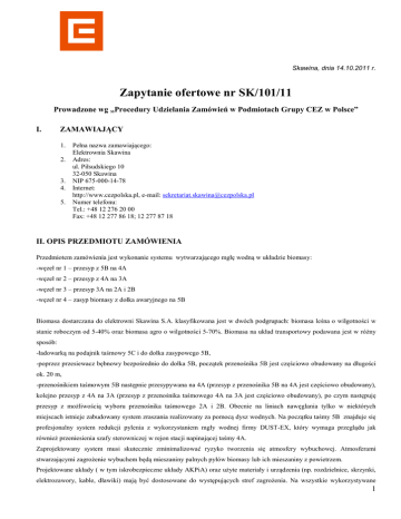 Skawina, dnia 14.10.2011 r. Zapytanie ofertowe nr SK/101/11 Prowadzone wg „Procedury Udzielania Zamówień w Podmiotach Grupy CEZ w Polsce” I. ZAMAWIAJĄCY 1. 2. 3. 4. 5. Pełna nazwa zamawiającego: Elektrownia Skawina Adres: ul. Piłsudskiego 10 32-050 Skawina NIP 675-000-14-78 Internet: http://www.cezpolska.pl, e-mail: [email protected] Numer telefonu: Tel.: +48 12 276 20 00 Fax: +48 12 277 86 18; 12 277 87 18 II. OPIS PRZEDMIOTU ZAMÓWIENIA Przedmiotem zamówienia jest wykonanie systemu wytwarzającego mgłę wodną w układzie biomasy: -węzeł nr 1 – przesyp z 5B na 4A -węzeł nr 2 – przesyp z 4A na 3A -węzeł nr 3 – przesyp 3A na 2A i 2B -węzeł nr 4 – zasyp biomasy z dołka awaryjnego na 5B Biomasa dostarczana do elektrowni Skawina S.A. klasyfikowana jest w dwóch podgrupach: biomasa leśna o wilgotności w stanie roboczym od 5-40% oraz biomasa agro o wilgotności 5-70%. Biomasa na układ transportowy podawana jest w różny sposób: -ładowarką na podajnik taśmowy 5C i do dołka zasypowego 5B, -poprzez przesiewacz bębnowy bezpośrednio do dołka 5B, początek przenośnika 5B jest częściowo obudowany na długości ok. 20 m, -przenośnikiem taśmowym 5B następnie przesypywana na 4A (przesyp z przenośnika 5B na 4A jest częściowo obudowany), kolejno przesyp z 4A na 3A (przesyp z przenośnika taśmowego 4A na 3A jest częściowo obudowany), po czym następuję przesyp z możliwością wyboru przenośnika taśmowego 2A i 2B. Obecnie na liniach nawęglania tylko w niektórych miejscach istnieje zabudowany system zraszania realizowany za pomocą dysz wodnych. Na początku taśmy 5B znajduje się profesjonalny system redukcji pylenia z wykorzystaniem mgły wodnej firmy DUST-EX, który wymaga przeglądu jak również przeniesienia szafy sterowniczej w rejon stacji napinającej taśmy 4A. Zaprojektowany system musi skutecznie zminimalizować ryzyko tworzenia się atmosfery wybuchowej. Atmosferami stwarzającymi zagrożenie wybuchem będą mieszaniny palnych pyłów biomasy lub ich mieszaniny z powietrzem. Projektowane układy ( w tym iskrobezpieczne układy AKPiA) oraz użyte materiały i urządzenia (np. rozdzielnice, skrzynki, elektrozawory, kable, dławiki) mają być dostosowane do występujących stref zagrożenia. Na wszystkie wykorzystywane 1 urządzenia i materiały Wykonawca zobowiązany jest dostarczyć odpowiednie certyfikaty bezpieczeństwa w tym zwłaszcza dotyczące dobranej aparatury i osprzęty w wykonaniu Ex. Opracowywana dokumentacja będzie wymagała wstępnego uzgodnienia ze Specjalistami Wydziału Majątku TM pracującymi w Elektrowni Skawina oraz przepisowego uzgodnienia z Rzeczoznawcami ds. BHP i Ppoż. Na instalacji zasilającej wody i powietrza, należy wykonać układ połączeń wyrównawczych i uziemień zgodnie z wymaganiami PN-E-05204 z 1994 roku. W skrzynkach na zasileniach poszczególnych linii należy wykonać układy ochrony przepięciowej oraz zastosować aparaturę umożliwiającą stworzenie (zgodnie z przepisami BHP) widocznej przerwy obwodów poprzez wyjęcie bezpiecznika - zastosowanie rozłączników typu R 301, R 303 lub równoważnych. Sygnały z przetworników AKPiA muszą być zrealizowane w standardzie 4 -20 mA. Może zaistnieć konieczność doprowadzenia mediów niezbędnych do prawidłowego działania systemu. W efekcie końcowym wymagane są pomiary połączeń ekwipotencjalnych, uziemiających oraz skuteczności ochrony przeciwporażeniowej całości wykonanej instalacji. Zakres rzeczowy: • Wykonanie dokumentacji technicznej wraz z doborem wyposażenia, • Dostawa kompletnego systemu DUSTEX lub równoważnego, • Prefabrykacja obudów i osłon przesypów, • Prefabrykacja obudów chroniących zabudowane szafy sterownicze, • Doprowadzenie mediów do węzłów, • Montaż instalacji redukcji pylenia ( we wszystkich branżach ), • Pomiary i sprawdzenia pomontażowe • Uruchomienie i przeszkolenie załogi, • Wykonanie pomiarów zapylenia w dwóch punktach referencyjnych przed i po zabudowie systemu, • W okresie gwarancji bezpłatne przeglądy instalacji co najmniej raz w miesiącu. Dodatkowe informacje zostały zawarte w Załączniku nr 2 do niniejszego zapytania – str.43 z Dokumentu Zabezpieczenia Przed Wybuchem ATEX oraz w Załączniku nr 3 do niniejszego zapytania – str. 49 i 50 z Dokumentu Zabezpieczenia Przed Wybuchem ATEX.. Uszczegółowienie zakresu przedmiotu prac może nastąpić podczas wizji lokalnej na wniosek Oferenta. Prosimy o wcześniejsze zgłoszenie chęci uczestnictwa w odbyciu wizji lokalnej na obiekcie. III. TERMIN WYKONANIA ZAMÓWIENIA Planowany termin realizacji zlecenia do 31.12.2011 roku. IV. SPOSÓB PRZYGOTOWANIA OFERTY 1. Każda z ofert powinna składać się z dwóch oddzielnych części: technicznej i handlowej, w oddzielnych zapieczętowanych ofertach z właściwym dopiskiem na kopertach: „Część techniczna oferty – nr postępowania”, 2 „Część handlowa oferty – nr postępowania”. Koperty z częściami techniczną i handlową powinny być właściwie opisane. 2. Część techniczna oferty powinna zawierać następujące informacje: a. Dokumenty wymienione w pkt. nr V niniejszego zapytania. 3. Część handlowa oferty powinna zawierać następujące informacje: a. Dokumenty wymienione w pkt. nr VI niniejszego zapytania. 4. Każdy oferent może złożyć tylko jedną ofertę. 5. Sposób przygotowania oferty: a. Oferta powinna być napisana czytelnie w języku polskim. b. Wszystkie strony oferty wraz z załącznikami powinny być podpisane przez osobę (osoby) uprawnioną do występowania w imieniu oferenta, c. Wszystkie strony oferty wraz z załącznikami powinny być spięte w sposób zapobiegający jej dekompletacji, d. Wszelkie poprawki lub zmiany w tekście oferty muszą być parafowane i datowane własnoręcznie przez osobę podpisującą ofertę lub przez osobę upoważnioną. 6. Opakowanie i oznakowanie ofert: Ofertę należy złożyć w zamkniętym o