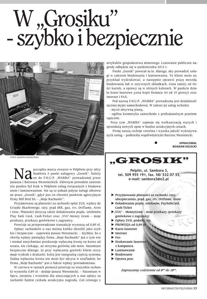W „Grosiku’’ - szybko i bezpiecznie artykułów gospodarstwa domowego. Losowanie publiczne nagrody odbędzie się w październiku 2012 r. Punkt „Grosik” powstał m.in. dlatego, aby prowadzić usługi w zakresie bindowania i laminowania. Tu klient może na przykład wydrukować, a następnie oprawić pracę metodą bindowania lub w sztywnych okładkach. Cena zależy od ilości kartek, a oprawy są w różnych kolorach. W punkcie działa ksero laserowe (cena kopii formatu A4 od 15 groszy) oraz Internet i FAX. Pod nazwą F.H.U.P. „WARBA’’ prowadzona jest działalność ręcznej myjni samochodowej. W zakres jej usług wchodzi: - mycie aktywną pianą, - ogólna kosmetyka samochodu z profesjonalnym praniem tapicerki. Poza tym „WARBA’’ zajmuje się wulkanizacją starych i sprzedażą nowych opon w bardzo atrakcyjnych cenach. Firmę naszą cechuje rzetelna i wysoka jakość wykonywanych usług – podkreśla współwłaściciel Bartosz Weroniecki. FOTO: SEwERYN BRZEZińSKi Na początku marca otwarto w Pelplinie przy ulicy Sambora 3 punkt usługowy „Grosik”. Należy on do F.H.U.P. „WARBA’’ prowadzonej przez Janusza i Bartosza Weronieckich. Głównym powodem zaistnienia punktu był brak w Pelplinie usług związanych z bindowaniem i laminowaniem. Nie są to jednak jedyne usługi oferowane przez „Grosik”, gdyż jest on również punktem agencyjnym firmy Bill Bird SA – „Moje Rachunki’’. Przyjmowane są płatności za rachunki opłat ZUS, wpłaty do Urzędu Skarbowego, raty, prąd tRR, gaz, rtv, Oriflame, Avon i inne. Płatności dotyczą także doładowania prądu, telefonów, Play Safe Card, Cash-Ticket oraz „VIA”-Money Gram – moje przekazy, przekazy gotówkowe z zagranicy. Prowizje za przeprowadzane transakcje wynoszą od 0,89 zł. Opłaty rachunków u nas można krótko określić jako szybkie i bezpieczne – zapewnia Janusz Weroniecki. – Szybkie, bo z chwilą wpłaty pieniędzy firma „Moje Rachunki” już o tym wie i niemal natychmiast przekazuje wpłaconą kwotę na konto adresata, nie czekając, aż otrzyma gotówkę ode mnie. Natomiast bezpieczne dlatego, że przy wpłacaniu gotówki klient otrzymuje wydruk z drukarki, która jest integralną częścią systemu. Żadna wpłacona kwota nie może być ukryta w szufladzie, bo firma „Moje Rachunki” jest o fakcie wpłaty powiadomiona. W czerwcu w ramach promocji prowizja za wszystkie rachunki wynosiła 0,89 zł – dodaje Janusz Weroniecki. – Natomiast w lipcu, sierpniu i wrześniu dla uiszczających u nas opłaty za rachunki będzie czekała atrakcyjna nagroda. Coś cennego z oPRacoWał Bogdan solecki „GROSIK” Pelplin, ul. Sambora 3, tel. 509 955 191, fax. 58/ 532 07 33, e-mail: [email protected] X Przyjmowanie płatności za rachunki /raty, ubezpieczenia, prąd, gaz, rtv, Oriflame, Avon/ X Doładowania prądu, telefonów, PaySafeCard, Cash-Ticket X„VIA” – MoneyGram – moje przekazy /przekazy gotówkowe z zagranicy/ X Opłaty ZUS, podatki, itp. X PROWIZJA od 0,89 zł X Ksero laserowe X Internet X Fax X Drukowanie laserowe z komputera X Laminowanie X Bindowanie X Oprawa prac Zapraszamy codziennie od 800 do 1800. INFORMATOR PELPLIŃSKI 13