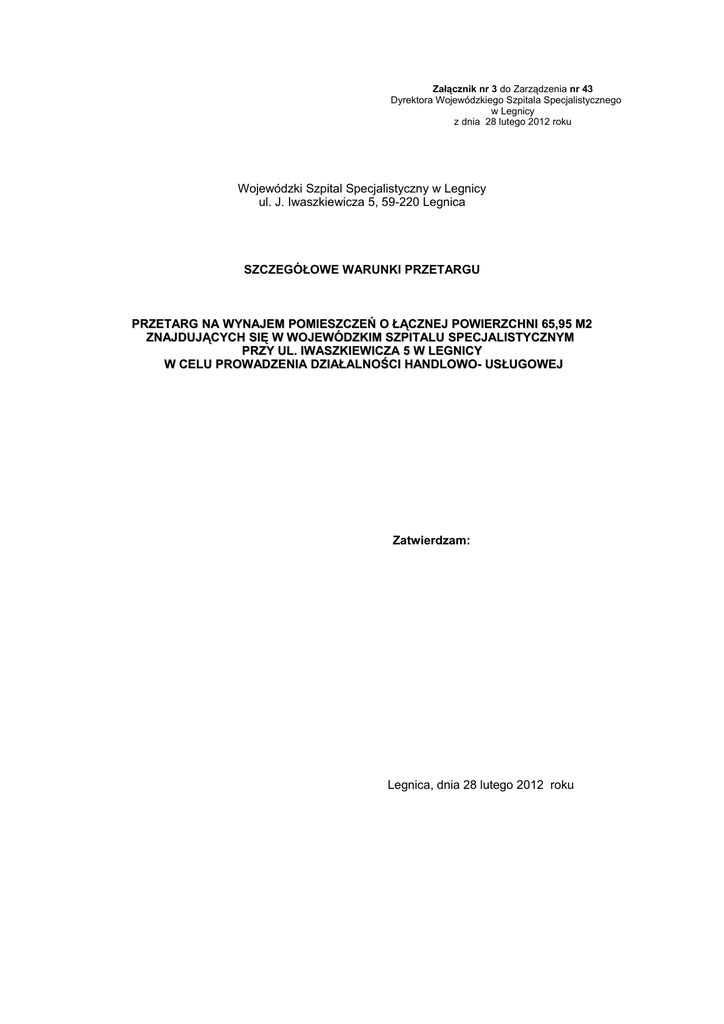 Załącznik nr 3 do Zarządzenia nr 43 Dyrektora Wojewódzkiego Szpitala Specjalistycznego w Legnicy z dnia 28 lutego 2012 roku Wojewódzki Szpital Specjalistyczny w Legnicy ul. J. Iwaszkiewicza 5, 59-220 Legnica SZCZEGÓŁOWE WARUNKI PRZETARGU PRZETARG NA WYNAJEM POMIESZCZEŃ O ŁĄCZNEJ POWIERZCHNI 65,95 M2 ZNAJDUJĄCYCH SIĘ W WOJEWÓDZKIM SZPITALU SPECJALISTYCZNYM PRZY UL. IWASZKIEWICZA 5 W LEGNICY W CELU PROWADZENIA DZIAŁALNOŚCI HANDLOWO- USŁUGOWEJ Zatwierdzam: Legnica, dnia 28 lutego 2012 roku Szczegółowe warunki przetargu zostały ustalone na podstawie Regulaminu przetargu na wynajem pomieszczeń o łącznej powierzchni 68,17 m 2 Wojewódzkiego Szpitala Specjalistycznego w celu prowadzenia działalności handlowo - usługowej zatwierdzonego Uchwałą nr 1732/IV/12 z dnia 17 stycznia 2012 roku, Zarządu Województwa Dolnośląskiego. W przetargu mogą brać udział osoby prawne, fizyczne oraz jednostki organizacyjne nie posiadające osobowości prawnej prowadząca działalność gospodarczą, które złożą ofertę spełniającą warunki zawarte w szczegółowych warunkach przetargu oraz wpłacą organizatorowi przetargu wadium w terminie i miejscu wyznaczonym w niniejszych szczegółowych warunkach przetargu oraz ogłoszeniu o przetargu. I. PRZEDMIOT PRZETARGU 1. Przedmiotem przetargu jest wynajem pomieszczeń o łącznej powierzchni 65,95 m2 w celu prowadzenia działalności handlowo – usługowej obejmującą m.in. sprzedaż artykułów spożywczych, przemysłowych, kosmetyków oraz powierzchni na zamieszczenie reklamy. 2. Pomieszczenie przeznaczone pod wynajem znajduje się w budynku 1A /poziom -1/ Wojewódzkiego Szpitala Specjalistycznego w Legnicy przy ul. Iwaszkiewicza 5 w Legnicy – plan sytuacyjny pomieszczeń oraz wykaz pomieszczeń stanowi załącznik nr 1 do SWP. 3. Organizator przetargu ustala cenę wywoławczą minimalną – 30,09 zł netto za 1 m2 wynajmowanej powierzchni oraz cenę wywoławczą minimalną za wynajem 1 m2 powierzchni celem umieszczenia reklamy - 41,00 zł netto za 1 m2. 4. Sprzęt użytkowany w wynajętym pomieszczeniu nie może zakłócać pracy urządzeń oraz sprzętu zainstalowanego w Szpitalu. 5. Wynajmujący nie dopuszcza składanie ofert częściowych. 6. Tablica reklamowa zostanie umieszczona w korytarzu budynku 1D lub 1E lub 1F /poziom -1/ Szpitala wg wskazania Oferenta. Maksymalny rozmiar reklamy - 1 m2 . II. PRZYGOTOWANIE OFERTY Oferent ma prawo złożyć tylko jedną ofertę. Ofertę należy sporządzić w języku polskim zgodnie ze szczegółowymi warunkami przetargu, w formie maszynopisu lub druku i uzupełnić wymaganymi załącznikami. Oferta musi być podpisana przy imiennych pieczątkach osób upoważnionych do reprezentowania oferenta wymienionych w rejestrze handlowym lub innym odpowiednim dokumencie, upoważniającym do reprezentowania. Kompletna oferta, łącznie z załącznikami, powinna mieć ponumerowane i parafowane strony. Wszystkie strony oferty muszą być spięte /zszyte/ we właściwej kolejności w sposób zapobiegający dekompletacji oferty. Wszelkie poprawki lub zmiany w tekście muszą być parafowane i datowane własnoręcznie przez osobę podpisującą ofertę. Oferty należy składać w nieprzejrzystych, zamkniętych kopertach lub opakowaniach. Koperta powinna być opatrzona napisem: WYNAJEM POMIESZCZEŃ O ŁĄCZNEJ POWIERZCHNI 65,95 M2 W CELU PROWADZENIA DZIAŁALNOŚCI HANDLOWO- USŁUGOWEJ - NIE OTWIERAĆ PRZED DNIEM 15 MARCA 2012 ROKU Oferenci ponoszą wszelkie koszty związane z przygotowaniem i złożeniem oferty. III. DOKUMENTY WYMAGANE OD OFERENTÓW: Oferta powinna zawierać: 1) proponowaną stawkę czynszu 1m2 powierzchni, 2) proponowaną stawkę czynszu za 1m2 reklamy, 3) dane dotyczące rodzaju prowadzonej działalności ( m.in. opis prowadzonej działalności, doświadczenie, zakres usług, ilość personelu, godziny w jakich będzie prowadzona działalność.) 4) aktualny odpis z właściwego rejestru lub zaświadczenie o wpisie do ewidencji działalności gospodarczej, wystawiony nie wcześniej niż 3 m-ce, przed terminem składania ofert. 5) oświadczenie oferenta lub zaświadczenie z właściwego organu podatkowego potwierdzającego, że nie zalega z opłacaniem podatków, lub że uzyskał zgodę na zwolnienie, odroczenie lub rozłożenie na raty zaległych płatności, 6) oświadczenie oferenta lub zaświadczenie z właściwego oddziału Zakładu Ubezpieczeń Społecznych potwierdzającego, że nie zalega z opłacaniem składek na ubezpieczenie społeczne, lub że uzyskał zgodę na zwolnienie, odroczenie lub rozłożenie na raty zaległych płatności, 7) oświadczenie oferenta, iż nie był skazany prawomocnym wyrokiem za popełnione przestępstwo przeciwko mieniu, obrotowi gospodarczemu, papierom wartościowym lub karno- skarbowe lub wyciąg z Krajowego Rejestru Karnego oraz oświadczenie, iż nie toczy się wobec niego postępowanie o w/w przestępstwa, 8) wypełniony i podpisany formularz ofertowy, 9) kopię dowodu wniesienia wadium. Uwagi 1. Dokumenty, o których mowa w pkt 4,5,6,7,9 mogą być przedstawione w formie oryginałów albo kserokopii poświadczonej za zgodność z oryginałem przez oferenta. 2. Aktualność zaświadczeń wymienionych w pkt 4,5,6 może wynosić maksymalnie 3 miesiące, natomiast w pkt 7 może wynosić maksymalnie 6 miesięcy 3. Oferty odrzucone, także w części niejawnej przetargu, nie będą rozpatrywane. IV. KRYTERIA OCENY miesięczna wartość czynszu z tytułu najmu powierzchni - 100 %, (bez czynszu za reklamę) Uwaga: W przypadku złożenia ofert z taką samą wartością, organizator przetargu może zarządzić składanie ofert dodatkowych. V. TERMIN OBOWIĄZYWANIA UMOWY 1. Umowa najmu zostanie zawarta na czas nieokreślony z możliwością jej rozwiązania z trzymiesięcznym okresem wypowiedzenia przez każdą ze stron lub na zasadzie porozumienia stron. 2. W przypadku naruszeń postanowień umowy lub zalegania z płatnością czynszu za dwa miesi