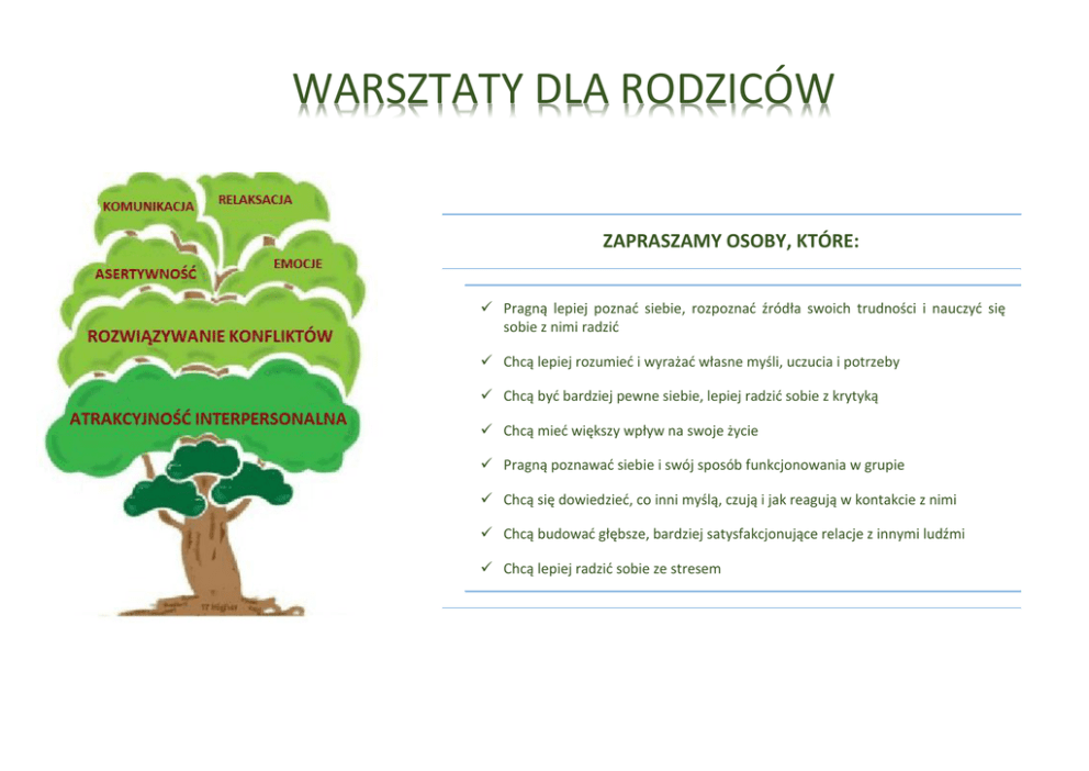 WARSZTATY DLA RODZICÓW ZAPRASZAMY OSOBY, KTÓRE:  Pragną lepiej poznać siebie, rozpoznać źródła swoich trudności i nauczyć się sobie z nimi radzić  Chcą lepiej rozumieć i wyrażać własne myśli, uczucia i potrzeby  Chcą być bardziej pewne siebie, lepiej radzić sobie z krytyką  Chcą mieć większy wpływ na swoje życie  Pragną poznawać siebie i swój sposób funkcjonowania w grupie  Chcą się dowiedzieć, co inni myślą, czują i jak reagują w kontakcie z nimi  Chcą budować głębsze, bardziej satysfakcjonujące relacje z innymi ludźmi  Chcą lepiej radzić sobie ze stresem