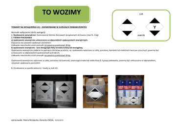 TO WOZIMY LUB TOWARY NA WYŁĄCZENIU LQ – ZAPAKOWANE W ILOŚCIACH OGRANICZONYCH Warunki wyłączenia (skrót wymgań): 1. Opakowanie wewnętrzne. Zastosowanie limitów ilościowych przypisanych do towaru (max 5L. 6 kg) znak LQ 2. FORMA PAKOWANIA. a) opakowania wewnętrzne umieszczone w odpowiednich opakowaniach zewnętrznych. Dopuszcza się używanie opakowań pośrednich. Całkowita masa brutto sztuki przesyłki nie powinna przekraczać 30 kg. b) opakowanie zewnętrzne - tace obciągnięte folią termokurczliwą lub rozciągliwą, Opakowania wewnętrzne podatne na pęknięcie lub łatwe przebicie, np. opakowania wykonane ze szkła, porcelany, kamionki lub niektórych tworzyw sztucznych, powinny być umieszczone w odpowiednich opakowaniach pośrednich. Całkowita masa brutto sztuki przesyłki nie powinna przekraczać 20 kg. Opakowania wewnętrzne wykonane ze szkła, porcelany lub kamionki, zawierające materiały ciekłe klasy 8, II grupy pakowania, powinny być umieszczone w odpowiednim, sztywnym opakowaniu pośrednim 3. Oznakowane w sposób widoczny i trwały w znak LQ: opracowała: Maria Nicopulos, Doradca DGSA, 18.03.2015 TEGO NIE WOZIMY TOWARY OZNAKOWANE NUMEREM UN ORAZ NALEPKĄ/NALEPKAMI OSTRZEGAWCZYMI: SZTUKI PRZESYŁKI TOWARÓW WYMAGAJĄCYCH PRZEWOZU ADR to M.IN. SKRZYNIA TEKTUROWA, WOREK, KANISTER, BĘBEN, DPPL opracowała: Maria Nicopulos, Doradca DGSA, 18.03.2015