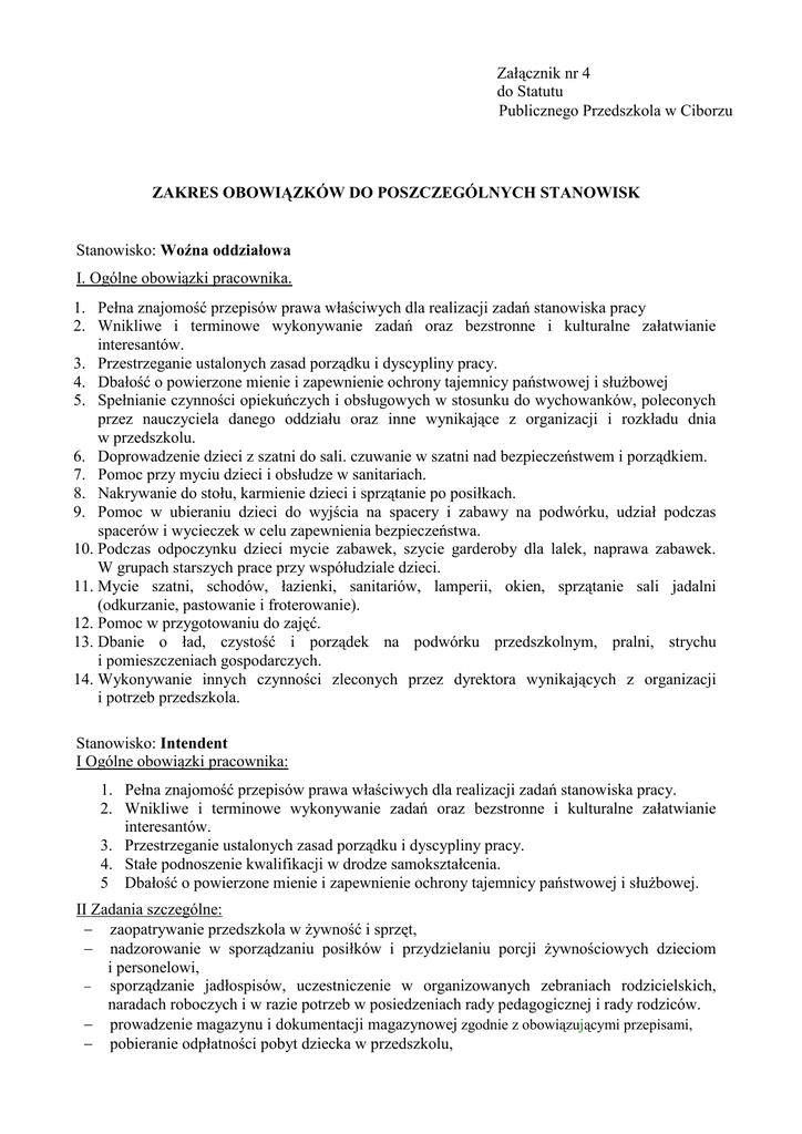 Załącznik nr 4 do Statutu Publicznego Przedszkola w Ciborzu ZAKRES OBOWIĄZKÓW DO POSZCZEGÓLNYCH STANOWISK Stanowisko: Woźna oddziałowa I. Ogólne obowiązki pracownika. 1. Pełna znajomość przepisów prawa właściwych dla realizacji zadań stanowiska pracy 2. Wnikliwe i terminowe wykonywanie zadań oraz bezstronne i kulturalne załatwianie interesantów. 3. Przestrzeganie ustalonych zasad porządku i dyscypliny pracy. 4. Dbałość o powierzone mienie i zapewnienie ochrony tajemnicy państwowej i słuŜbowej 5. Spełnianie czynności opiekuńczych i obsługowych w stosunku do wychowanków, poleconych przez nauczyciela danego oddziału oraz inne wynikające z organizacji i rozkładu dnia w przedszkolu. 6. Doprowadzenie dzieci z szatni do sali. czuwanie w szatni nad bezpieczeństwem i porządkiem. 7. Pomoc przy myciu dzieci i obsłudze w sanitariach. 8. Nakrywanie do stołu, karmienie dzieci i sprzątanie po posiłkach. 9. Pomoc w ubieraniu dzieci do wyjścia na spacery i zabawy na podwórku, udział podczas spacerów i wycieczek w celu zapewnienia bezpieczeństwa. 10. Podczas odpoczynku dzieci mycie zabawek, szycie garderoby dla lalek, naprawa zabawek. W grupach starszych prace przy współudziale dzieci. 11. Mycie szatni, schodów, łazienki, sanitariów, lamperii, okien, sprzątanie sali jadalni (odkurzanie, pastowanie i froterowanie). 12. Pomoc w przygotowaniu do zajęć. 13. Dbanie o ład, czystość i porządek na podwórku przedszkolnym, pralni, strychu i pomieszczeniach gospodarczych. 14. Wykonywanie innych czynności zleconych przez dyrektora wynikających z organizacji i potrzeb przedszkola. Stanowisko: Intendent I Ogólne obowiązki pracownika: 1. Pełna znajomość przepisów prawa właściwych dla realizacji zadań stanowiska pracy. 2. Wnikliwe i terminowe wykonywanie zadań oraz bezstronne i kulturalne załatwianie interesantów. 3. Przestrzeganie ustalonych zasad porządku i dyscypliny pracy. 4. Stałe podnoszenie kwalifikacji w drodze samokształcenia. 5 Dbałość o powierzone mienie i zapewnienie ochrony tajemnicy państwowej i słuŜbowej. II Zadania szczególne: − zaopatrywanie przedszkola w Ŝywność i sprzęt, − nadzorowanie w sporządzaniu posiłków i przydzielaniu porcji Ŝywnościowych dzieciom i personelowi, − sporządzanie jadłospisów, uczestniczenie w organizowanych zebraniach rodzicielskich, naradach roboczych i w razie potrzeb w posiedzeniach rady pedagogicznej i rady rodziców. − prowadzenie magazynu i dokumentacji magazynowej zgodnie z obowiązującymi przepisami, − pobieranie odpłatności pobyt dziecka w przedszkolu, − wykonywanie innych czynności poleconych przez dyrektora wynikających z organizacji pracy w przedszkolu. III Uprawnienia pracownika: 1. UŜywanie pieczęci o treści: INTENDENT 2. Załatwianie interesantów w sprawach ustalonych w niniejszym zakresie czynności. Stanowisko: Kucharka I Ogólne obowiązki pracownika. 1. Pełna znajomość przepisów prawa właściwych dla realizacji zadań stanowiska pracy. 2. Wnikliwe i terminowe wykonywanie zadań oaz bezstronne i kulturalne załatwianie interesantów. 3. Przestrzeganie ustalonych zasad porządku i dyscypliny pracy. 4. Dbałość o powierzone mienie. II Zadania szczegółowe: − przyrządzać punktualnie zdrowe i higieniczne posiłki, − przyjmować produkty z magazynu, kwitować ich odbiór w raportach Ŝywieniowych i dbać o racjonalne ich zuŜycie, prowadzić magazyn podręczny, − utrzymywać w stanie uŜywalności powierzony sprzęt kuchenny, brać udział w ustalaniu jadłospisów, − wykonywać inne czynności polecone przez dyrektora wynikające z organizacji pracy w przedszkolu.