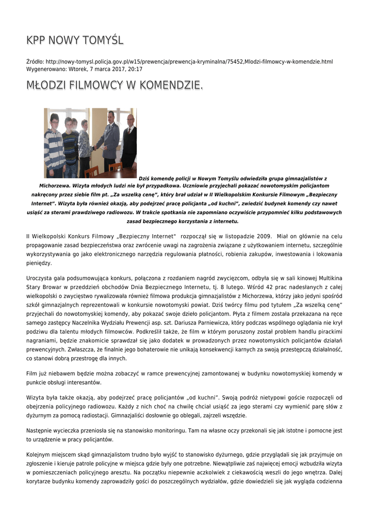 KPP NOWY TOMYŚL Źródło: http://nowy-tomysl.policja.gov.pl/w15/prewencja/prewencja-kryminalna/75452,Mlodzi-filmowcy-w-komendzie.html Wygenerowano: Wtorek, 7 marca 2017, 20:17 MŁODZI FILMOWCY W KOMENDZIE. Dziś komendę policji w Nowym Tomyślu odwiedziła grupa gimnazjalistów z Michorzewa. Wizyta młodych ludzi nie był przypadkowa. Uczniowie przyjechali pokazać nowotomyskim policjantom nakręcony przez siebie film pt. „Za wszelką cenę”, który brał udział w II Wielkopolskim Konkursie Filmowym „Bezpieczny Internet”. Wizyta była również okazją, aby podejrzeć pracę policjanta „od kuchni”, zwiedzić budynek komendy czy nawet usiąść za sterami prawdziwego radiowozu. W trakcie spotkania nie zapomniano oczywiście przypomnieć kilku podstawowych zasad bezpiecznego korzystania z internetu. II Wielkopolski Konkurs Filmowy „Bezpieczny Internet" rozpoczął się w listopadzie 2009. Miał on głównie na celu propagowanie zasad bezpieczeństwa oraz zwrócenie uwagi na zagrożenia związane z użytkowaniem internetu, szczególnie wykorzystywania go jako elektronicznego narzędzia regulowania płatności, robienia zakupów, inwestowania i lokowania pieniędzy. Uroczysta gala podsumowująca konkurs, połączona z rozdaniem nagród zwycięzcom, odbyła się w sali kinowej Multikina Stary Browar w przeddzień obchodów Dnia Bezpiecznego Internetu, tj. 8 lutego. Wśród 42 prac nadesłanych z całej wielkopolski o zwycięstwo rywalizowała również filmowa produkcja gimnazjalistów z Michorzewa, którzy jako jedyni spośród szkół gimnazjalnych reprezentowali w konkursie nowotomyski powiat. Dziś twórcy filmu pod tytułem „Za wszelką cenę” przyjechali do nowotomyskiej komendy, aby pokazać swoje dzieło policjantom. Płyta z filmem została przekazana na ręce samego zastępcy Naczelnika Wydziału Prewencji asp. szt. Dariusza Parniewicza, który podczas wspólnego oglądania nie krył podziwu dla talentu młodych filmowców. Podkreślił także, że film w którym poruszony został problem handlu pirackimi nagraniami, będzie znakomicie sprawdzał się jako dodatek w prowadzonych przez nowotomyskich policjantów działań prewencyjnych. Zwłaszcza, że finalnie jego bohaterowie nie unikają konsekwencji karnych za swoją przestępczą działalność, co stanowi dobrą przestrogę dla innych. Film już niebawem będzie można zobaczyć w ramce prewencyjnej zamontowanej w budynku nowotomyskiej komendy w punkcie obsługi interesantów. Wizyta była także okazją, aby podejrzeć pracę policjantów „od kuchni”. Swoją podróż nietypowi goście rozpoczęli od obejrzenia policyjnego radiowozu. Każdy z nich choć na chwilę chciał usiąść za jego sterami czy wymienić parę słów z dyżurnym za pomocą radiostacji. Gimnazjaliści dosłownie go oblegali, zajrzeli wszędzie. Następnie wycieczka przeniosła się na stanowisko monitoringu. Tam na własne oczy przekonali się jak istotne i pomocne jest to urządzenie w pracy policjantów. Kolejnym miejscem skąd gimnazjalistom trudno było wyjść to stanowisko dyżurnego, gdzie przyglądali się jak przyjmuje on zgłoszenie i kieruje patrole policyjne w miejsca gdzie były one potrzebne. Niewątpliwie zaś najwięcej emocji wzbudziła wizyta w pomieszczeniach policyjnego aresztu. Na początku niepewnie aczkolwiek z ciekawością weszli do jego wnętrza. Dalej korytarze budynku komendy zaprowadziły gości do poszczególnych wydziałów, gdzie dowiedzieli się jak wygląda codzienna służba pracujących tam funkcjonariuszy Na zakończenie w sali narad rzecznik prasowy sierż. Paweł Głódź przypomniał młodym ludziom jak surfować w Internecie, aby nie stać się ofiarą przestępstwa, czy jakie konsekwencje karne ponosi sprawca „cyberprzemocy”. szola/mlodzi filmowcy/1 Ocena: 0/5 (0) Tweetnij