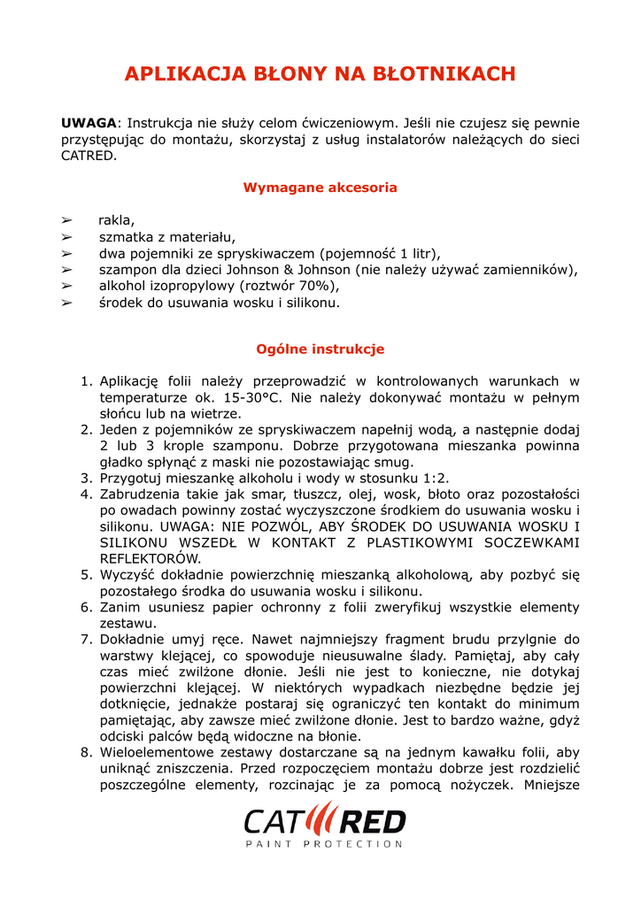 APLIKACJA BŁONY NA BŁOTNIKACH UWAGA: Instrukcja nie służy celom ćwiczeniowym. Jeśli nie czujesz się pewnie przystępując do montażu, skorzystaj z usług instalatorów należących do sieci CATRED. Wymagane akcesoria ➢ ➢ ➢ ➢ ➢ ➢ rakla, szmatka z materiału, dwa pojemniki ze spryskiwaczem (pojemność 1 litr), szampon dla dzieci Johnson & Johnson (nie należy używać zamienników), alkohol izopropylowy (roztwór 70%), środek do usuwania wosku i silikonu. Ogólne instrukcje 1. Aplikację folii należy przeprowadzić w kontrolowanych warunkach w temperaturze ok. 15-30°C. Nie należy dokonywać montażu w pełnym słońcu lub na wietrze. 2. Jeden z pojemników ze spryskiwaczem napełnij wodą, a następnie dodaj 2 lub 3 krople szamponu. Dobrze przygotowana mieszanka powinna gładko spłynąć z maski nie pozostawiając smug. 3. Przygotuj mieszankę alkoholu i wody w stosunku 1:2. 4. Zabrudzenia takie jak smar, tłuszcz, olej, wosk, błoto oraz pozostałości po owadach powinny zostać wyczyszczone środkiem do usuwania wosku i silikonu. UWAGA: NIE POZWÓL, ABY ŚRODEK DO USUWANIA WOSKU I SILIKONU WSZEDŁ W KONTAKT Z PLASTIKOWYMI SOCZEWKAMI REFLEKTORÓW. 5. Wyczyść dokładnie powierzchnię mieszanką alkoholową, aby pozbyć się pozostałego środka do usuwania wosku i silikonu. 6. Zanim usuniesz papier ochronny z folii zweryfikuj wszystkie elementy zestawu. 7. Dokładnie umyj ręce. Nawet najmniejszy fragment brudu przylgnie do warstwy klejącej, co spowoduje nieusuwalne ślady. Pamiętaj, aby cały czas mieć zwilżone dłonie. Jeśli nie jest to konieczne, nie dotykaj powierzchni klejącej. W niektórych wypadkach niezbędne będzie jej dotknięcie, jednakże postaraj się ograniczyć ten kontakt do minimum pamiętając, aby zawsze mieć zwilżone dłonie. Jest to bardzo ważne, gdyż odciski palców będą widoczne na błonie. 8. Wieloelementowe zestawy dostarczane są na jednym kawałku folii, aby uniknąć zniszczenia. Przed rozpoczęciem montażu dobrze jest rozdzielić poszczególne elementy, rozcinając je za pomocą nożyczek. Mniejsze elementy odłóż na bok w bezpieczne, suche miejsce do momentu, kiedy będą potrzebne. Montaż na błotnikach 1. Oklejając mniejsze fragmenty błotnika możesz używać wyłącznie roztworu wody z alkoholem. Najlepiej jest rozpocząć od przedniego brzegu, przykładając do niego narożnik błony, jednakże w zależności od techniki montażu, punkt początkowy może być inny. 2. Za pomocą rakli delikatnie przetrzyj punkt zrównania, aby umieścić zestaw we właściwym miejscu. Stopniowo wykonuj coraz bardziej zdecydowane ruchy aż do momentu, gdy błona przyklei się do powierzchni. 3. Kiedy materiał jest osadzony w początkowym punkcie, wyrównaj przeciwległą stronę. Jeśli jest to konieczne naciągnij błonę pamiętając, aby odstęp wynosił ok. 2 cm. 4. Za pomocą rakli przetrzyj pozostałą część błony wykonując zdecydowane kuliste ruchy w celu uniknięcia powstawania pęcherzyków. 5. W przypadku pojazdów, które mają silnie perforowane błotniki, owiń raklę papierowym ręcznikiem, a następnie pozbądź się ewentualnych nierówności. Wskazówki do montażu ➢ zwróć uwagę, aby wykonywać koliste ruchy, dzięki temu unikniesz uwięzienia powietrza pod błoną ➢ pęcherzyki zwykle tworzą się przy łukach oraz w zagłębieniach, w związku z tym zwróć na te fragmenty szczególną uwagę, ➢ niewskazane jest nadmierne naciąganie materiału, jednakże delikatne nacięgnięcie jest niezbędne, aby dopasować materiał, zwłaszcza na łukach. ➢ błona może być lekko podniesiona do góry, jeśli jest to konieczne dla jej wyrównania lub usunięcia pozostałego brudu, powietrza bądź nadmiernej ilości mieszanki, ➢ w przypadku wątpliwości, przed rozpoczęciem montażu zadzwoń pod numer CATRED: 508-077-727 celu uzyskania pomocy technicznej. Instrukcje dot. pielęgnacji Po zainstalowaniu błony możesz ją myć i woskować podobnie jak pozostałe części pojazdu. Możesz spotkać się z sytuacją, że wosk pozostanie na konturach maski oraz brzegach maski. Użyj miękkiej szczotki, aby delikatnie usunąć pozostały wosk. Delikatne zadrapania można zniwelować wcierając rozcieńczony alkohol izopropylowy, a następnie pozostawiając go, aby wyparował. Warstwa wosku powinna zostać nałożona na błonę zaraz po zainstalowaniu, aby zamknąć pory. Dzięki temu do folii nie będą przyklejać się owady oraz zanieczyszczenia drogowe. Używając wysokociśnieniowych spryskiwaczy nie umieszczaj końcówki węża bezpośrednio przy skraju błony, aby zapobiec jej odklejeniu. Podnoszenie narożników błony może spowodować trwałe jej uszkodzenie. Po zakończeniu aplikacji folii, należy ją nawoskować. Dzięki temu błona będzie chroniona przed absorpcją zanieczyszczeń (poleca się stosowanie produktu XPEL PPF Sealant). Zaleca się woskowanie folii raz w miesiącu.