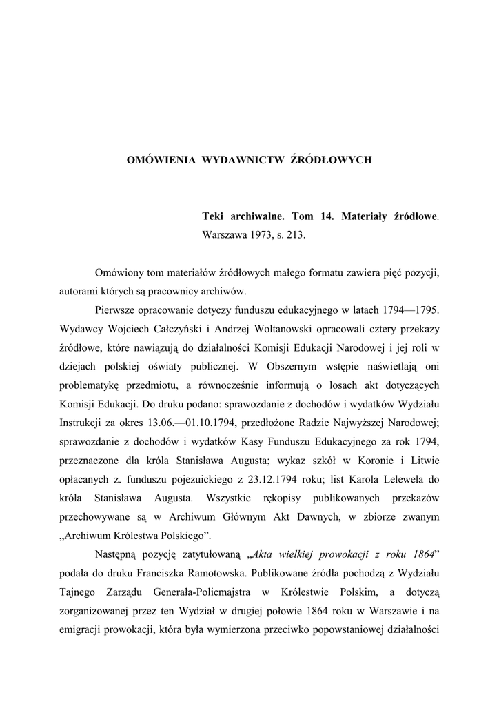 OMÓWIENIA WYDAWNICTW ŹRÓDŁOWYCH Teki archiwalne. Tom 14. Materiały źródłowe. Warszawa 1973, s. 213. Omówiony tom materiałów źródłowych małego formatu zawiera pięć pozycji, autorami których są pracownicy archiwów. Pierwsze opracowanie dotyczy funduszu edukacyjnego w latach 1794—1795. Wydawcy Wojciech Całczyński i Andrzej Woltanowski opracowali cztery przekazy źródłowe, które nawiązują do działalności Komisji Edukacji Narodowej i jej roli w dziejach polskiej oświaty publicznej. W Obszernym wstępie naświetlają oni problematykę przedmiotu, a równocześnie informują o losach akt dotyczących Komisji Edukacji. Do druku podano: sprawozdanie z dochodów i wydatków Wydziału Instrukcji za okres 13.06.—01.10.1794, przedłożone Radzie Najwyższej Narodowej; sprawozdanie z dochodów i wydatków Kasy Funduszu Edukacyjnego za rok 1794, przeznaczone dla króla Stanisława Augusta; wykaz szkół w Koronie i Litwie opłacanych z. funduszu pojezuickiego z 23.12.1794 roku; list Karola Lelewela do króla Stanisława Augusta. Wszystkie rękopisy publikowanych przekazów przechowywane są w Archiwum Głównym Akt Dawnych, w zbiorze zwanym „Archiwum Królestwa Polskiego”. Następną pozycję zatytułowaną „Akta wielkiej prowokacji z roku 1864” podała do druku Franciszka Ramotowska. Publikowane źródła pochodzą z Wydziału Tajnego Zarządu Generała-Policmajstra w Królestwie Polskim, a dotyczą zorganizowanej przez ten Wydział w drugiej połowie 1864 roku w Warszawie i na emigracji prowokacji, która była wymierzona przeciwko popowstaniowej działalności rewolucyjnej Polaków. Chodziło głównie o doprowadzenie do ostatecznej likwidacji Organizacji Narodowej, uchwycenie pozostających na wolności członków. oraz wykrycie składów broni i funduszów rewolucyjnych. Dla osiągnięcia tych celów Wydział Tajny rozwijał szeroką akcję szpiegowską, do której wciągnięci zostali dwaj młodzi powstańcy. Wśród przekazów znalazły się pisma, raporty agentów z doniesieniem o działalności rewolucyjnej oraz informacje o sprawach Organizacji Narodowej w powiatach warszawskim i włocławskim. Źródła pochodzą z Archiwum Głównego Akt Dawnych i zostały opublikowane w języku oryginału (polski i rosyjski). Okresu międzywojennego dotyczą raporty, referaty i sprawozdania o położeniu polskich robotników rolnych w Niemczech (1920—1939), opracowane przez Edwarda Kołodzieja. Wydawca naświetlił tło polityczne oraz sytuację gospodarczą tych lat. Poprzez archiwalia pokazana została historia polskiego wychodźstwa do Rzeszy. Wśród tekstów źródłowych wymienić można: raport konsula RP we Wrocławiu o położeniu polskich robotników sezonowych na Śląsku, notatkę ambasady RP w Berlinie o statystyce zatrudnionych w Niemczech zagranicznych robotników, raport Agencji Konsularnej w Szczecinie o agitacji komunistycznej wśród emigracji w Niemczech, notę Poselstwa RP w Berlinie do niemieckiego Urzędu Spraw Zagranicznych w sprawie bicia polskich robotników rolnych, referat tajny Konsulatu w Berlinie na terenową konferencję w sprawie emigracji sezonowej oraz notę dotyczącą utrudniania dzieciom polskich robotników rolnych nauki i pracy w rzemiośle. Do tej pozycji dołączono aneks obejmujący regesty ważniejszych przekazów źródłowych z Archiwum Akt Nowych dotyczących omawianego tematu. Również do lat sprzed II wojny światowej nawiązuje Tadeusz Wawrzyński w opracowanych archiwaliach informujących o położeniu ludności polskiej na Śląsku Opolskim 1930—1936. Jak stwierdza się we wstępie, dotychczasowy stan badań omawianego zagadnienia nadal wymaga głębokich poszukiwań źródłowych. Zachodzi konieczność pokazania archiwaliów mniej znanych, a wiele wnoszących do bliższego poznania tematu. Wydawca opracował materiały pochodzące z Centralnego Archiwum Wojskowego. Do obiegu naukowego oddane zostały: obszerny raport konsula generalnego RP w Bytomiu do Ministerstwa Spraw Zagranicznych z 6 grudnia 1930 roku w sprawie położenia mniejszości polskiej na Śląsku Opolskim, raport wojewody śląskiego adresowany do ministra spraw zagranicznych z 24 kwietnia 1933 roku w sprawie stanu organizacyjnego polskiego ruchu narodowego na Śląsku Opolskim oraz raport szefa Ekspozytury nr 4 Oddziału II Sztabu Głównego do Generalnego Inspektoratu Sił Zbrojnych i szefa Oddziału II Sztabu Głównego z 23 marca 1936 roku w sprawie sytuacji ludności polskiej na Śląsku Dolnym i Opolskim. W ostatniej pozycji Danuta Kubiak podała do druku zarządzenia władz hitlerowskich w sprawie wysiedleń ludności polskiej i żydowskiej z tak zwanego Kraju Warty. Wybrane źródła dotyczą okresu od listopada 1939 roku do grudnia 1944 roku. Niepublikowane dotychczas przekazy to m.in.: zarządzenie tajne wyższego dowódcy SS i policji w Poznaniu o wysiedleniu Żydów i Polaków z Kraju Warty, fragment zarządzenia w sprawie spisu majątku pozostawionego przez wysiedlonych, polecenie w sprawce meldowania transportów z wysiedlonymi, okólnik dotyczący wysiedlania Polaków w związku z osiedlaniem Niemców bałtyckich, zarządzenie kierownika Tajnej Policji Państwowej Obwodu Rejencyjnego w Poznaniu w sprawie postępowania z wysiedlonymi Polakami powracającymi bez zezwolenia z Generalnego Gubernatorstwa oraz wytyczne kierownika Centrali Przesiedleńczej — Ekspozytury w Łodzi o sposobie przeprowadzania wysiedleń robotników rolnych do Francji. Wszystkie te materiały archiwalne podane zostały w języku oryginału (niemieckim). Zamieszczone w omawianym tomie przekazy źródłowe opatrzone zostały odpowiednimi przepisami archiwalnymi i objaśniającymi. PPR I 1947 — XII 1948 Dokumenty. Warszawa 1973, s. 258. Wydawnictwo Wyższej Szkoły Nauk Społecznych przy KC PZPR (Zakład Historii Polskiego Ruchu Robotniczego) obejmuje najważniejsze rezolucje, odezwy, instrukcje i okólniki Komitetu Centralnego Polskiej Partii Robotniczej