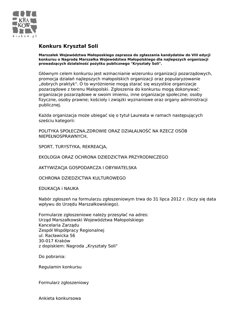 Konkurs Kryształ Soli Marszałek Województwa Małoposkiego zaprasza do zgłaszania kandydatów do VIII edycji konkursu o Nagrodę Marszałka Województwa Małopolskiego dla najlepszych organizacji prowadzących działalność pożytku publicznego "Kryształy Soli". Głównym celem konkursu jest wzmacnianie wizerunku organizacji pozarządowych, promocja działań najlepszych małopolskich organizacji oraz popularyzowanie „dobrych praktyk". O to wyróżnienie mogą starać się wszystkie organizacje pozarządowe z terenu Małopolski. Zgłoszenia do konkursu mogą dokonywać: organizacje pozarządowe w swoim imieniu, inne organizacje społeczne; osoby fizyczne, osoby prawne; kościoły i związki wyznaniowe oraz organy administracji publicznej. Każda organizacja może ubiegać się o tytuł Laureata w ramach następujących sześciu kategorii: POLITYKA SPOŁECZNA,ZDROWIE ORAZ DZIAŁALNOŚĆ NA RZECZ OSÓB NIEPEŁNOSPRAWNYCH, SPORT, TURYSTYKA, REKREACJA, EKOLOGIA ORAZ OCHRONA DZIEDZICTWA PRZYRODNICZEGO AKTYWIZACJA GOSPODARCZA I OBYWATELSKA OCHRONA DZIEDZICTWA KULTUROWEGO EDUKACJA i NAUKA Nabór zgłoszeń na formularzu zgłoszeniowym trwa do 31 lipca 2012 r. (liczy się data wpływu do Urzędu Marszałkowskiego). Formularze zgłoszeniowe należy przesyłać na adres: Urząd Marszałkowski Województwa Małopolskiego Kancelaria Zarządu Zespół Współpracy Regionalnej ul. Racławicka 56 30-017 Kraków z dopiskiem: Nagroda „Kryształy Soli" Do pobrania: Regulamin konkursu Formularz zgłoszeniowy Ankieta konkursowa Dodatkowych informacji udziela: Pani Katarzyna Gajus-Wyrwicz – pracownik Zespół Współpracy Regionalnej w Kancelarii Zarządu UMWM tel. 12 61 60 543 email: [email protected] http://www.malopolskie.pl Powered by TCPDF (www.tcpdf.org)