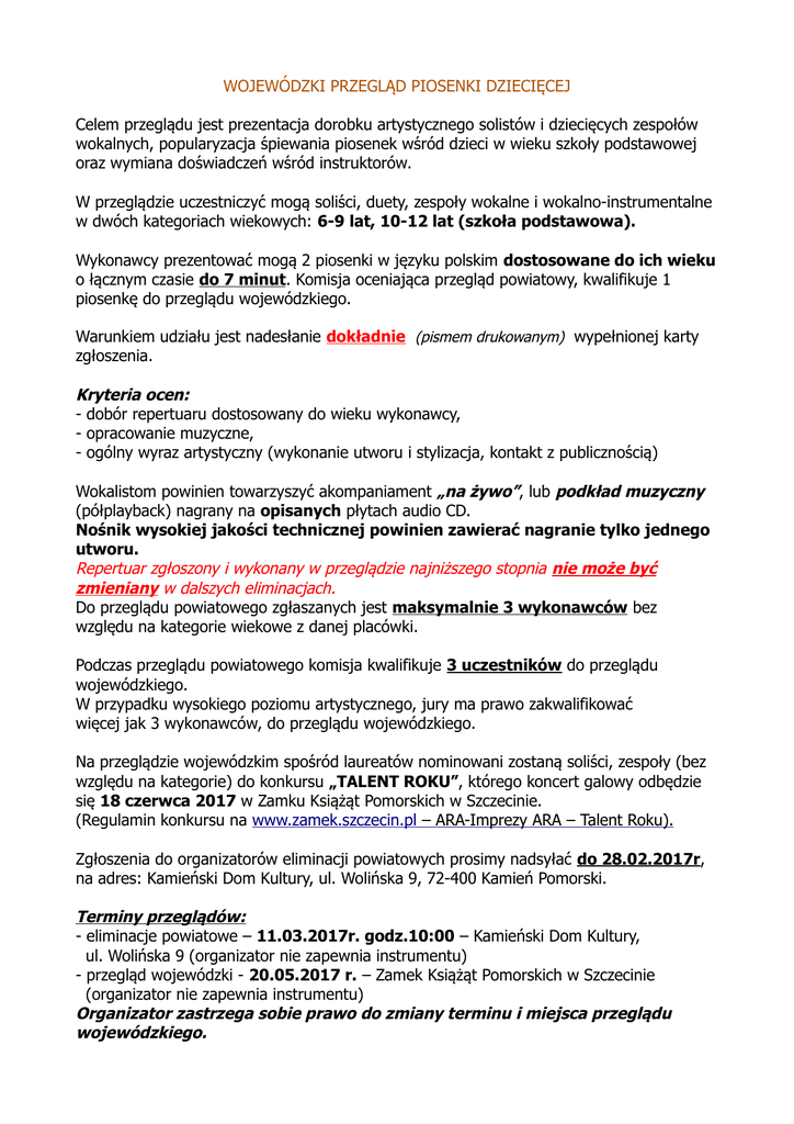 WOJEWÓDZKI PRZEGLĄD PIOSENKI DZIECIĘCEJ Celem przeglądu jest prezentacja dorobku artystycznego solistów i dziecięcych zespołów wokalnych, popularyzacja śpiewania piosenek wśród dzieci w wieku szkoły podstawowej oraz wymiana doświadczeń wśród instruktorów. W przeglądzie uczestniczyć mogą soliści, duety, zespoły wokalne i wokalno-instrumentalne w dwóch kategoriach wiekowych: 6-9 lat, 10-12 lat (szkoła podstawowa). Wykonawcy prezentować mogą 2 piosenki w języku polskim dostosowane do ich wieku o łącznym czasie do 7 minut. Komisja oceniająca przegląd powiatowy, kwalifikuje 1 piosenkę do przeglądu wojewódzkiego. Warunkiem udziału jest nadesłanie dokładnie (pismem drukowanym) wypełnionej karty zgłoszenia. Kryteria ocen: - dobór repertuaru dostosowany do wieku wykonawcy, - opracowanie muzyczne, - ogólny wyraz artystyczny (wykonanie utworu i stylizacja, kontakt z publicznością) Wokalistom powinien towarzyszyć akompaniament „na żywo”, lub podkład muzyczny (półplayback) nagrany na opisanych płytach audio CD. Nośnik wysokiej jakości technicznej powinien zawierać nagranie tylko jednego utworu. Repertuar zgłoszony i wykonany w przeglądzie najniższego stopnia nie może być zmieniany w dalszych eliminacjach. Do przeglądu powiatowego zgłaszanych jest maksymalnie 3 wykonawców bez względu na kategorie wiekowe z danej placówki. Podczas przeglądu powiatowego komisja kwalifikuje 3 uczestników do przeglądu wojewódzkiego. W przypadku wysokiego poziomu artystycznego, jury ma prawo zakwalifikować więcej jak 3 wykonawców, do przeglądu wojewódzkiego. Na przeglądzie wojewódzkim spośród laureatów nominowani zostaną soliści, zespoły (bez względu na kategorie) do konkursu „TALENT ROKU”, którego koncert galowy odbędzie się 18 czerwca 2017 w Zamku Książąt Pomorskich w Szczecinie. (Regulamin konkursu na www.zamek.szczecin.pl – ARA-Imprezy ARA – Talent Roku). Zgłoszenia do organizatorów eliminacji powiatowych prosimy nadsyłać do 28.02.2017r, na adres: Kamieński Dom Kultury, ul. Wolińska 9, 72-400 Kamień Pomorski. Terminy przeglądów: - eliminacje powiatowe – 11.03.2017r. godz.10:00 – Kamieński Dom Kultury, ul. Wolińska 9 (organizator nie zapewnia instrumentu) - przegląd wojewódzki - 20.05.2017 r. – Zamek Książąt Pomorskich w Szczecinie (organizator nie zapewnia instrumentu) Organizator zastrzega sobie prawo do zmiany terminu i miejsca przeglądu wojewódzkiego. (pieczątka instytucji delegującej) KAR TA Z G Ł O S Z E N IA dotyczy przeglądów: muzycznych, tanecznych, teatralnych Przegląd ARA: POWIATOWY - WOJEWÓDZKI 1. Nazwa przeglądu …......................................................................................................................................... 2. Nazwa i rodzaj zespołu,chóru .......................................................................................................................... lub imię i nazwisko solisty ….............................................................................................................................. 3. Kategoria wiekowa : .......................................... (podać kat. zgodnie z regulaminem właściwego przeglądu) 4. Placówka patronująca (adres, tel.kontaktowy) ................................................................................................... ….......................................................................................................................................................................... 5. Adres domowy, telefon: ................................................................................................................................... .............................................................................................................................................................................. E-mail:……………………………………………………......... 6. Nazwisko i imię instruktora (adres, tel. kontaktowy) …..................................................................................... .............................................................................................................................................................................. 7. Krótka charakterystyka zespołu lub solisty (np. rodzaj uprawianej muzyki, tańca, osiągnięcia, itp.) ….......................................................................................................................................................................... .............................................................................................................................................................................. ….......................................................................................................................................................................... 8. Ilość osób w zespole : …...................................... (proszę załączyć listę wykonawców) 9. Repertuar (tytuł, autor, czas trwania).....................................................................…............... ....................................................................................................................................................... ....................................................................................................................................................... ....................................................................................................................................................... ....................................................................................................................................................... czas............ czas............ czas............ czas............ czas............ 10. Wymagania techniczne(nagłośnienie itp.).............................................................................. 11.C