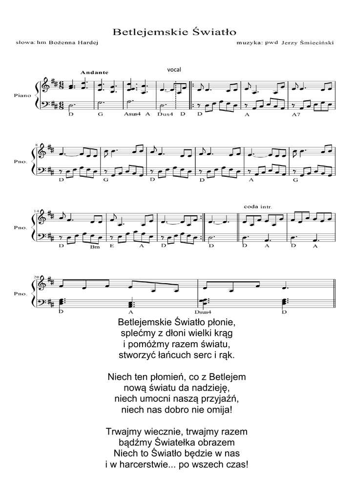 vocal Betlejemskie Światło płonie, splećmy z dłoni wielki krąg i pomóżmy razem światu, stworzyć łańcuch serc i rąk. Niech ten płomień, co z Betlejem nową światu da nadzieję, niech umocni naszą przyjaźń, niech nas dobro nie omija! Trwajmy wiecznie, trwajmy razem bądźmy Światełka obrazem Niech to Światło będzie w nas i w harcerstwie... po wszech czas!