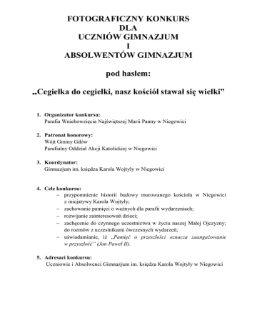 FOTOGRAFICZNY KONKURS DLA UCZNIÓW GIMNAZJUM I ABSOLWENTÓW GIMNAZJUM pod hasłem: „Cegiełka do cegiełki, nasz kościół stawał się wielki” 1. Organizator konkursu: Parafia Wniebowzięcia Najświętszej Marii Panny w Niegowici 2. Patronat honorowy: Wójt Gminy Gdów Parafialny Oddział Akcji Katolickiej w Niegowici 3. Koordynator: Gimnazjum im. księdza Karola Wojtyły w Niegowici 4. Cele konkursu: przypomnienie historii budowy murowanego kościoła w Niegowici z inicjatywy Karola Wojtyły; zachowanie pamięci o ważnych dla parafii wydarzeniach; rozwijanie zainteresowań dzieci; zachęcenie do czynnego uczestnictwa w życiu naszej Małej Ojczyzny; do rozmów z uczestnikami ówczesnych wydarzeń; uświadamianie, iż „Pamięć o przeszłości oznacza zaangażowanie w przyszłość” (Jan Paweł II). 5. Adresaci konkursu: Uczniowie i Absolwenci Gimnazjum im. księdza Karola Wojtyły w Niegowici 6. Forma i zasady uczestnictwa: Jeden uczestnik może zgłosić maksymalnie 3 prace. Zdjęcia powinny być wykonane samodzielnie przez uczestnika konkursu Prace wykonane zespołowo nie będą brać udziału w konkursie. Odbitki wykonane na papierze fotograficznym należy wykonać w formacie max A3 ale nie mniejszym niż 18x24 cm. Fotografie na odwrocie powinny być opatrzone godłem (pseudonimem). Do zdjęć należy dołączyć zaklejoną kopertę, w której umieścić należy następujące dane: o - imię i nazwisko, wiek autora; o - nazwa i adres szkoły oraz telefon; o - adres e:mail o - imię i nazwisko opiekuna; o .- tytuł pracy (prac). Na kopercie powinno się znajdować to samo godło, co na przesłanych pracach. Do prac należy dołączyć wersję elektroniczną zdjęć na CD, które również należy podpisać godłem, Nagrodzone prace wezmą udział w wystawie z okazji Jubileuszu 50-lecia Konsekracji Kościoła w Niegowici. Kategorie: młodzież gimnazjalne, absolwenci. Koordynator konkursu fotograficznego: mgr inż. Bogusław Trzaska Każdy uczestnik konkursu otrzyma pamiątkowy dyplom NA ZWYCIĘZCÓW CZEKAJĄ ATRAKCYJNE NAGRODY! 7. Termin składania prac: 30 czerwca 2016 r. 8. Miejsce składania prac i kontakt: Gimnazjum im. księdza Karola Wojtyły w Niegowici (sekretariat) tel. (12) 251-95-15 9. Wyniki i wręczenie nagród: laureaci i ich opiekunowie o wynikach konkursu zostaną zawiadomieni telefonicznie; wręczenie nagród - 25 września 2016 roku. 10. Postanowienia końcowe: organizatorzy zastrzegają sobie prawo publikowania i reprodukowania prac konkursowych bez wypłacania honorariów autorskich; przesłane prace przechodzą na własność organizatora z zachowaniem praw autorskich (odbiór prac możliwy osobiście lub przez osobę upoważnioną); udział w konkursie jest jednoznaczny z wyrażeniem zgody na publikację wizerunku oraz prac; nadesłanie prac jest jednoczesne z akceptacją niniejszego regulaminu. ŻYCZYMY SUKCESÓW!