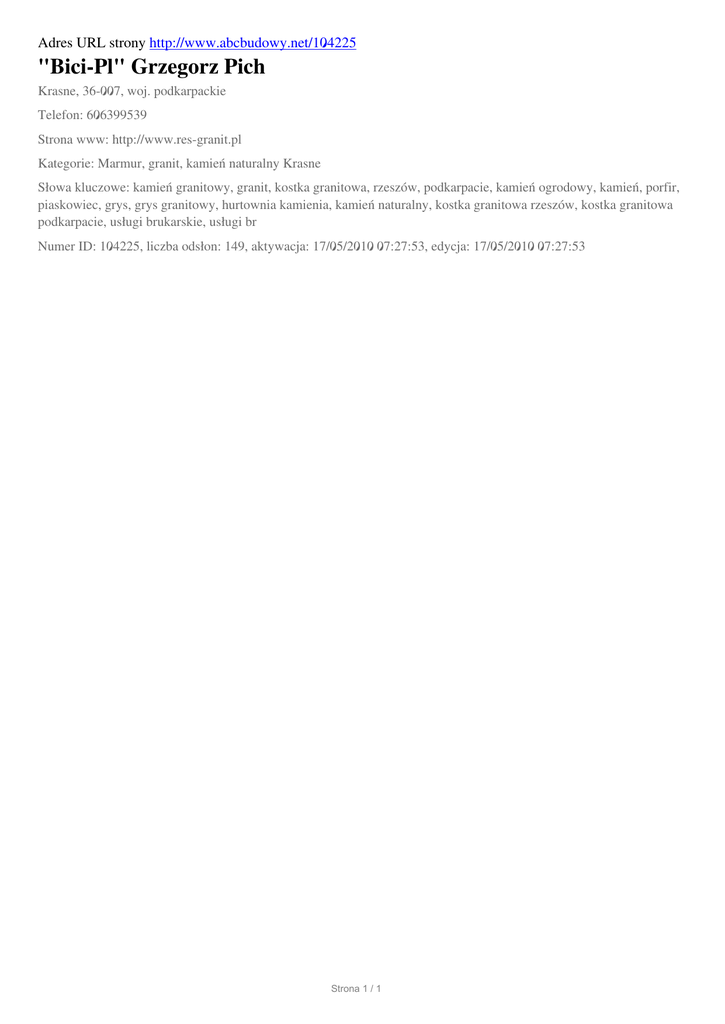 Adres URL strony http://www.abcbudowy.net/104225 "Bici-Pl" Grzegorz Pich Krasne, 36-007, woj. podkarpackie Telefon: 606399539 Strona www: http://www.res-granit.pl Kategorie: Marmur, granit, kamień naturalny Krasne Słowa kluczowe: kamień granitowy, granit, kostka granitowa, rzeszów, podkarpacie, kamień ogrodowy, kamień, porfir, piaskowiec, grys, grys granitowy, hurtownia kamienia, kamień naturalny, kostka granitowa rzeszów, kostka granitowa podkarpacie, usługi brukarskie, usługi br Numer ID: 104225, liczba odsłon: 149, aktywacja: 17/05/2010 07:27:53, edycja: 17/05/2010 07:27:53 Strona 1 / 1