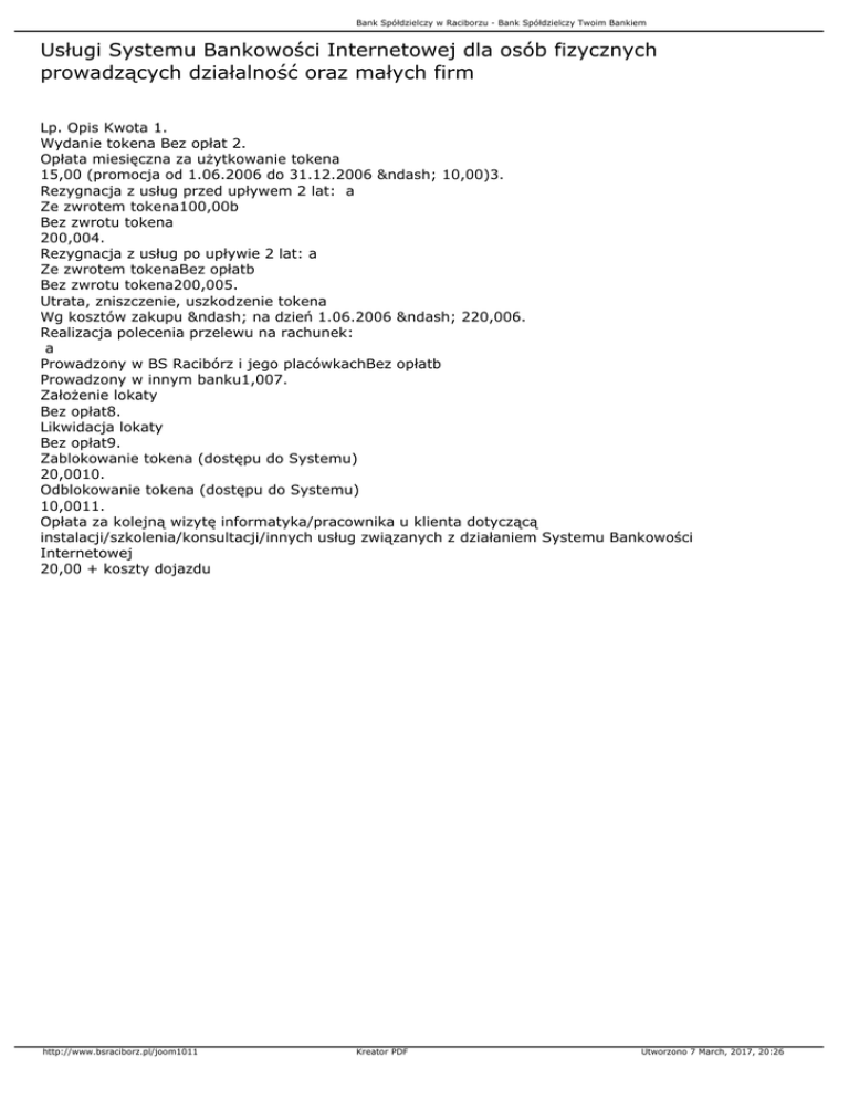 Bank Spółdzielczy w Raciborzu - Bank Spółdzielczy Twoim Bankiem Usługi Systemu Bankowości Internetowej dla osób fizycznych prowadzących działalność oraz małych firm Lp. Opis Kwota 1. Wydanie tokena Bez opłat 2. Opłata miesięczna za użytkowanie tokena 15,00 (promocja od 1.06.2006 do 31.12.2006 – 10,00)3. Rezygnacja z usług przed upływem 2 lat: a Ze zwrotem tokena100,00b Bez zwrotu tokena 200,004. Rezygnacja z usług po upływie 2 lat: a Ze zwrotem tokenaBez opłatb Bez zwrotu tokena200,005. Utrata, zniszczenie, uszkodzenie tokena Wg kosztów zakupu – na dzień 1.06.2006 – 220,006. Realizacja polecenia przelewu na rachunek: a Prowadzony w BS Racibórz i jego placówkachBez opłatb Prowadzony w innym banku1,007. Założenie lokaty Bez opłat8. Likwidacja lokaty Bez opłat9. Zablokowanie tokena (dostępu do Systemu) 20,0010. Odblokowanie tokena (dostępu do Systemu) 10,0011. Opłata za kolejną wizytę informatyka/pracownika u klienta dotyczącą instalacji/szkolenia/konsultacji/innych usług związanych z działaniem Systemu Bankowości Internetowej 20,00 + koszty dojazdu http://www.bsraciborz.pl/joom1011 Kreator PDF Utworzono 7 March, 2017, 20:26