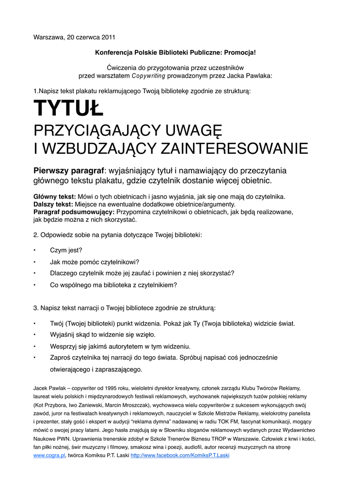 Warszawa, 20 czerwca 2011 Konferencja Polskie Biblioteki Publiczne: Promocja! Ćwiczenia do przygotowania przez uczestników przed warsztatem Copywriting prowadzonym przez Jacka Pawlaka: 1.Napisz tekst plakatu reklamującego Twoją bibliotekę zgodnie ze strukturą: TYTUŁ PRZYCIĄGAJĄCY UWAGĘ I WZBUDZAJĄCY ZAINTERESOWANIE Pierwszy paragraf: wyjaśniający tytuł i namawiający do przeczytania głównego tekstu plakatu, gdzie czytelnik dostanie więcej obietnic. Główny tekst: Mówi o tych obietnicach i jasno wyjaśnia, jak się one mają do czytelnika. Dalszy tekst: Miejsce na ewentualne dodatkowe obietnice/argumenty. Paragraf podsumowujący: Przypomina czytelnikowi o obietnicach, jak będą realizowane, jak będzie można z nich skorzystać. 2. Odpowiedz sobie na pytania dotyczące Twojej biblioteki: • Czym jest? • Jak może pomóc czytelnikowi? • Dlaczego czytelnik może jej zaufać i powinien z niej skorzystać? • Co wspólnego ma biblioteka z czytelnikiem? 3. Napisz tekst narracji o Twojej bibliotece zgodnie ze strukturą: • Twój (Twojej biblioteki) punkt widzenia. Pokaż jak Ty (Twoja biblioteka) widzicie świat. • Wyjaśnij skąd to widzenie się wzięło. • Wesprzyj się jakimś autorytetem w tym widzeniu. • Zaproś czytelnika tej narracji do tego świata. Spróbuj napisać coś jednocześnie otwierającego i zapraszającego. Jacek Pawlak – copywriter od 1995 roku, wieloletni dyrektor kreatywny, członek zarządu Klubu Twórców Reklamy, laureat wielu polskich i międzynarodowych festiwali reklamowych, wychowanek największych tuzów polskiej reklamy (Kot Przybora, Iwo Zaniewski, Marcin Mroszczak), wychowawca wielu copywriterów z sukcesem wykonujących swój zawód, juror na festiwalach kreatywnych i reklamowych, nauczyciel w Szkole Mistrzów Reklamy, wielokrotny panelista i prezenter, stały gość i ekspert w audycji “reklama dymna” nadawanej w radiu TOK FM, fascynat komunikacji, mogący mówić o swojej pracy latami. Jego hasła znajdują się w Słowniku sloganów reklamowych wydanych przez Wydawnictwo Naukowe PWN. Uprawnienia trenerskie zdobył w Szkole Trenerów Biznesu TROP w Warszawie. Człowiek z krwi i kości, fan piłki nożnej, świr muzyczny i filmowy, smakosz wina i poezji, audiofil, autor recenzji muzycznych na stronę www.cogra.pl, twórca Komiksu P.T. Laski http://www.facebook.com/KomiksP.T.Laski