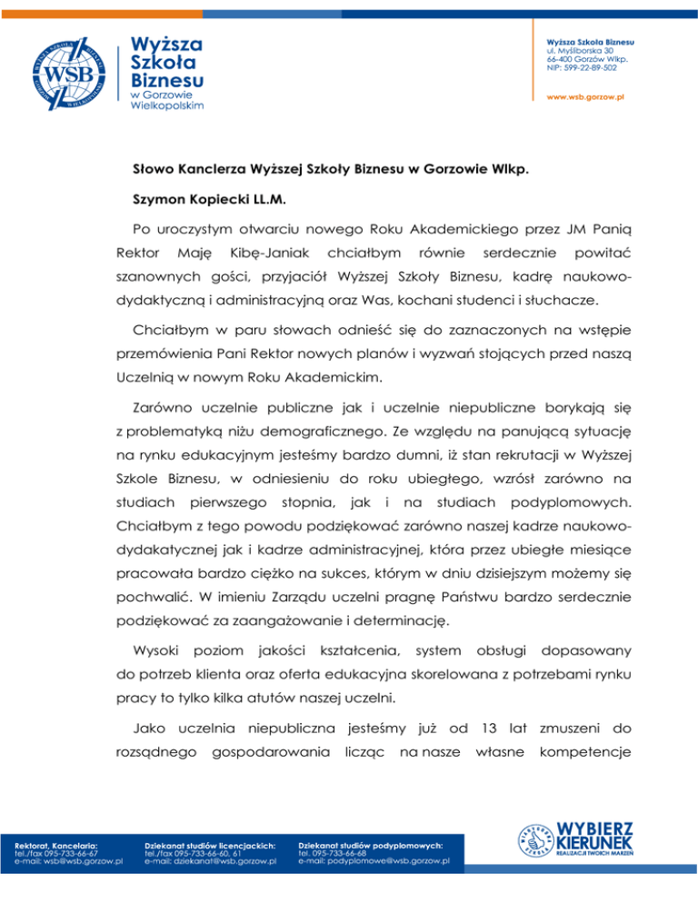Słowo Kanclerza Wyższej Szkoły Biznesu w Gorzowie Wlkp. Szymon Kopiecki LL.M. Po uroczystym otwarciu nowego Roku Akademickiego przez JM Panią Rektor Maję Kibę-Janiak chciałbym równie serdecznie powitać szanownych gości, przyjaciół Wyższej Szkoły Biznesu, kadrę naukowodydaktyczną i administracyjną oraz Was, kochani studenci i słuchacze. Chciałbym w paru słowach odnieść się do zaznaczonych na wstępie przemówienia Pani Rektor nowych planów i wyzwań stojących przed naszą Uczelnią w nowym Roku Akademickim. Zarówno uczelnie publiczne jak i uczelnie niepubliczne borykają się z problematyką niżu demograficznego. Ze względu na panującą sytuację na rynku edukacyjnym jesteśmy bardzo dumni, iż stan rekrutacji w Wyższej Szkole Biznesu, w odniesieniu do roku ubiegłego, wzrósł zarówno na studiach pierwszego stopnia, jak i na studiach podyplomowych. Chciałbym z tego powodu podziękować zarówno naszej kadrze naukowodydakatycznej jak i kadrze administracyjnej, która przez ubiegłe miesiące pracowała bardzo ciężko na sukces, którym w dniu dzisiejszym możemy się pochwalić. W imieniu Zarządu uczelni pragnę Państwu bardzo serdecznie podziękować za zaangażowanie i determinację. Wysoki poziom jakości kształcenia, system obsługi dopasowany do potrzeb klienta oraz oferta edukacyjna skorelowana z potrzebami rynku pracy to tylko kilka atutów naszej uczelni. Jako uczelnia niepubliczna jesteśmy już od 13 lat zmuszeni do rozsądnego gospodarowania licząc na nasze własne kompetencje i umiejętności. Ciągłe doskonalenie naszej oferty edukacyjnej, dostosowywanie jej do realiów rynku pracy oraz szczególny nacisk na praktyczne umiejętności dają naszym absolwentom studiów pierwszego stopnia oraz studiów podyplomowych gwarancję sukcesu w życiu zawodowym. Także w tym roku okres wakacji wiązał się dla nas nie tyle z odpoczynkiem, co z pracą nad dalszym doskonaleniem naszej oferty. Chciałbym skierować Państwa uwagę na kilka istotnych, planowanych przez nas działań w nowym Roku Akademickim. Rada Biznesu. Do końca bieżącego roku kalendarzowego Zarząd uczelni planuje powołanie Rady Biznesu Wyższej Szkoły Biznesu w Gorzowie Wielkopolskim. Zgodnie z postanowieniami regulaminu Rada Biznesu będzie stanowić ciało doradcze i opiniodawcze działające przy naszej Uczelni. Do członkowstwa w tym organie będą zaproszeni: a) przedstawiciele szkół wyższych, b) przedstawiciele lokalnej przedsiębiorczości, c) przedstawiciele instytucji publicznych. Do zadań Rady Biznesu będzie należało przede wszystkim: a) wymiana informacji dotyczących oczekiwań pracodawców wobec absolwentów, b) doradztwo w zakresie tworzenia strategii rozwoju Wyższej Szkoły Biznesu, c) formułowanie propozycji dostosowania oferty edukacyjnej do aktualnych potrzeb rynku pracy i gospodarki opartej na wiedzy, d) umożliwianie studentom odbywania staży i praktyk zawodowych. Szanowni Państwo powołanie Rady Biznesu jak i pogłębianie dotychczasowej ścisłej współpracy ze środowiskiem okołobiznesowym, Lubuską Organizacją Pracodawców, Zachodnią Izbą Przemysłowo Handlową, Wojewódzkim Urzędem Pracy, Kuratorium Oświaty czy Urzędem Miasta w Gorzowie Wielkopolskim, stanowią istotny element w naszym dążeniu do tworzenia unikatowej oferty edukacyjnej. Obok działań długofalowych i istotnych ze względów strategicznego rozwoju uczelni w nowym roku akademickim kierujemy do naszych studentów szereg elementów stanowiących wartość dodaną. Dwa najistotniejsze to: 1) Indywidualna ścieżka rozwoju studenta – Biuro Karier naszej Uczelni wraz z nowym rokiem akademickim oferuje indywidualne poradnictwo zawodowe, które skierowane jest do studentów pierwszego roku celem budowania własnej ścieżki kariery. 2) Portfolio Absolwenta – będące elementem w procesie kształcenia, który odróżni naszych absolwentów od absolwentów innych uczelni. Portoflio studenta będzie stanowiło zbiór dokumentów, zaświadczeń i potwierdzeń udziału studentów ćwiczeniach, praktykach i stażach. w dodatkowych zajęciach, Szanowni Państwo! Dynamiczny rozwój uczelni powoduje, iż w tak krótkim czasie nie jestem w stanie przedstawić Państwu wszystkich planów na przyszłość, w które wpisują się między innymi: - Studia podyplomowe MBA (Master of Business Administartion) wraz z Uczelnią partnerską z Saragossy; - Urozmaicenie oferty naszej szkoły językowej Lingua Academia; - Nowy kierunek / Studia II stopnia; - Planowane projekty badawcze, konferencje; - Oferta komercyjna skierowana do biznesu i jednostek samorządu terytorialnego w zakresie szkoleń, studiów podyplomowych oraz wsparcia przy aplikowaniu i wdrażaniu projektów unijnych. To tylko kilka z naszych planów na przyszłość. Drodzy studenci i słuchacze studiów podyplomowych – życzę Wam, aby dzisiejszy dzień utkwił w Waszej pamięci jako istotny krok w Waszej drodze poprzez naukę i praktykę do kompetencji i sukcesu. Dziękuję za uwagę. Szymon Kopiecki LL.M. Kanclerz Wyższej Szkoły Biznesu W Gorzowie Wlkp.