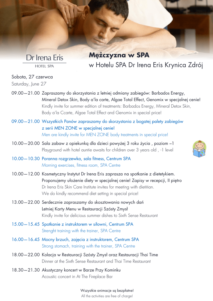 Mężczyzna w SPA w Hotelu SPA Dr Irena Eris Krynica Zdrój Sobota, 27 czerwca Saturday, June 27 09.00—21.00 Zapraszamy do skorzystania z letniej odmiany zabiegów: Barbados Energy, Mineral Detox Skin, Body a’la carte, Algae Total Effect, Genomix w specjalnej cenie! Kindly invite for summer edition of treatments: Barbados Energy, Mineral Detox Skin, Body a’la Ccarte, Algae Total Effect and Genomix in special price! 09.00—21.00 Wszystkich Panów zapraszamy do skorzystania z bogatej palety zabiegów z serii MEN ZONE w specjalnej cenie! Men are kindly invite for MEN ZONE body treatments in special price! 10.00—20.00 Sala zabaw z opiekunką dla dzieci powyżej 3 roku życia , poziom –1 Playground with hotel auntie awaits for children over 3 years old , -1 level 10.00—10.30 Poranna rozgrzewka, sala fitness, Centrum SPA Morning exercises, fitness room, SPA Centre 10.00—12.00 Kosmetyczny Instytut Dr Irena Eris zaprasza na spotkanie z dietetykiem. Proponujemy ułożenie diety w specjalnej cenie! Zapisy w recepcji, II piętro Dr Irena Eris Skin Care Institute invites for meeting with dietitian. We do kindly recommend diet setting in special price! 13.00—22.00 Serdecznie zapraszamy do skosztowania nowych dań Letniej Karty Menu w Restauracji Szósty Zmysł Kindly invite for delicious summer dishes to Sixth Sense Restaurant 15.00—15.45 Spotkanie z instruktorem w siłowni, Centrum SPA Strenght training with the trainer, SPA Centre 16.00—16.45 Mocny brzuch, zajęcia z instruktorem, Centrum SPA Strong stomach, training with the trainer, SPA Centre 18.00—22.00 Kolacja w Restauracji Szósty Zmysł oraz Restauracji Thai Time Dinner at the Sixth Sense Restaurant and Thai Time Restaurant 18.30—21.30 Akustyczny koncert w Barze Przy Kominku Acoustic concert in At The Fireplace Bar Wszystkie animacje są bezpłatne! All the activities are free of charge!