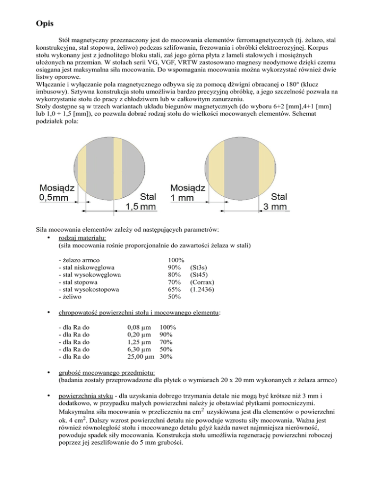 Opis Stół magnetyczny przeznaczony jest do mocowania elementów ferromagnetycznych (tj. żelazo, stal konstrukcyjna, stal stopowa, żeliwo) podczas szlifowania, frezowania i obróbki elektroerozyjnej. Korpus stołu wykonany jest z jednolitego bloku stali, zaś jego górna płyta z lameli stalowych i mosiężnych ułożonych na przemian. W stołach serii VG, VGF, VRTW zastosowano magnesy neodymowe dzięki czemu osiągana jest maksymalna siła mocowania. Do wspomagania mocowania można wykorzystać również dwie listwy oporowe. Włączanie i wyłączanie pola magnetycznego odbywa się za pomocą dźwigni obracanej o 180° (klucz imbusowy). Sztywna konstrukcja stołu umożliwia bardzo precyzyjną obróbkę, a jego szczelność pozwala na wykorzystanie stołu do pracy z chłodziwem lub w całkowitym zanurzeniu. Stoły dostępne są w trzech wariantach układu biegunów magnetycznych (do wyboru 6+2 [mm],4+1 [mm] lub 1,0 + 1,5 [mm]), co pozwala dobrać rodzaj stołu do wielkości mocowanych elementów. Schemat podziałek pola: Siła mocowania elementów zależy od następujących parametrów: • rodzaj materiału: (siła mocowania rośnie proporcjonalnie do zawartości żelaza w stali) - żelazo armco - stal niskowęglowa - stal wysokowęglowa - stal stopowa - stal wysokostopowa - żeliwo • 100% 90% 80% 70% 65% 50% (St3s) (St45) (Corrax) (1.2436) chropowatość powierzchni stołu i mocowanego elementu : - dla Ra do - dla Ra do - dla Ra do - dla Ra do - dla Ra do 0,08 µm 0,20 µm 1,25 µm 6,30 µm 25,00 µm 100% 90% 70% 50% 30% • grubość mocowanego przedmiotu: (badania zostały przeprowadzone dla płytek o wymiarach 20 x 20 mm wykonanych z żelaza armco) • powierzchnia styku - dla uzyskania dobrego trzymania detale nie mogą być krótsze niż 3 mm i dodatkowo, w przypadku małych powierzchni należy je obstawiać płytkami pomocniczymi. Maksymalna siła mocowania w przeliczeniu na cm2 uzyskiwana jest dla elementów o powierzchni ok. 4 cm2. Dalszy wzrost powierzchni detalu nie powoduje wzrostu siły mocowania. Ważna jest również równoległość stołu i mocowanego detalu gdyż każda nawet najmniejsza nierówność, powoduje spadek siły mocowania. Konstrukcja stołu umożliwia regenerację powierzchni roboczej poprzez jej zeszlifowanie do 5 mm grubości.