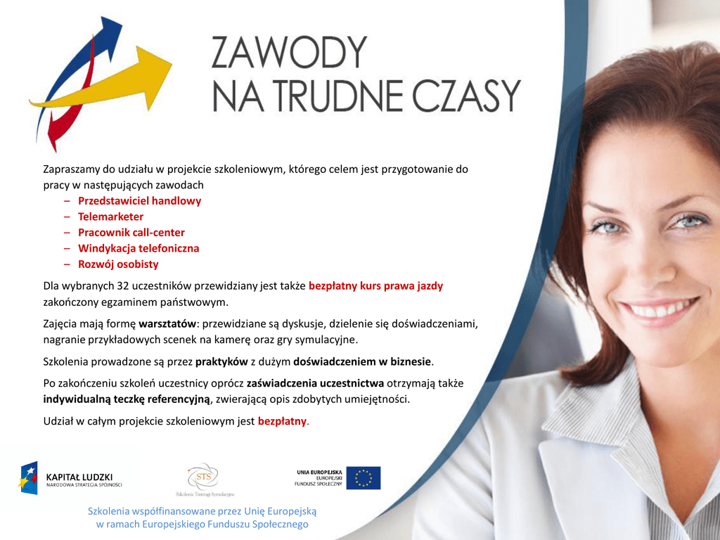 Zapraszamy do udziału w projekcie szkoleniowym, którego celem jest przygotowanie do pracy w następujących zawodach – Przedstawiciel handlowy – Telemarketer – Pracownik call-center – Windykacja telefoniczna – Rozwój osobisty Dla wybranych 32 uczestników przewidziany jest także bezpłatny kurs prawa jazdy zakooczony egzaminem paostwowym. Zajęcia mają formę warsztatów: przewidziane są dyskusje, dzielenie się doświadczeniami, nagranie przykładowych scenek na kamerę oraz gry symulacyjne. Szkolenia prowadzone są przez praktyków z dużym doświadczeniem w biznesie. Po zakooczeniu szkoleo uczestnicy oprócz zaświadczenia uczestnictwa otrzymają także indywidualną teczkę referencyjną, zwierającą opis zdobytych umiejętności. Udział w całym projekcie szkoleniowym jest bezpłatny. Szkolenia współfinansowane przez Unię Europejską w ramach Europejskiego Funduszu Społecznego Cykle szkoleniowe Przedstawiciel handlowy Wg rankingów zawód przedstawiciela handlowego jest jednym z 10 najbardziej poszukiwanych przez pracodawców w Polsce. Aby pojąd taką pracę można mieszkad w dowolnym miejscu Polski – najczęściej pracodawca zapewnia samochód służbowy, telefon, często także laptopa. Stwarza również możliwośd awansu w strukturze firmy. Program szkoleo uwzględnia przygotowanie do wizyty u klienta, prowadzenie spotkao z klientami, prowadzenie prezentacji handlowych, elementy matematyki handlowej, merchandising, negocjacje handlowe oraz wybrane programy komputerowe. Pracownik call-center Centrum telefonicznej obsługi klienta (call-center) służy załatwieniu różnych spraw klienta przez telefon (informacja, złożenie reklamacji, zlecenie usługi, itp.). Telemarketer Zawód telemarketera polega na prowadzeniu sprzedaży produktów lub usług przez telefon. Istnieje możliwośd pracy z domu lub w niepełnym wymiarze. Program cyklu szkoleo obejmuje nawiązywanie kontaktów telefonicznych z klientami, techniki sprzedaży, prowadzenie prezentacji handlowej przez telefon, sposoby radzenia sobie z wątpliwościami klienta oraz finalizowanie sprzedaży. Windykacja telefoniczna W dobie kryzysu wiele firm zleca odzyskiwanie należności firmom windykacyjnym. Nie chodzi jednak o stereotypowych „facetów z kijami bejsbolowymi”, lecz o prowadzenie negocjacji z dłużnikiem przez telefon w taki sposób, aby nie zamykad możliwości współpracy w przyszłości. W tej pracy świetnie mogą sprawdzid się zarówno mężczyźni, jak i kobiety. Program szkoleo uwzględnia rozpoznanie oczekiwao klienta, obsługę klienta dzwoniącego z reklamacją oraz elementy asertywności w sytuacjach trudnych. Program szkoleo obejmuje etapy prowadzenia rozmowy windykacyjnej, typologię dłużników, elementy psychologii dłużnika, diagnozę wymówek i gier, asertywne komunikaty, strategie ustępstw i sankcji, sposoby budowania porozumienia oraz prawne aspekty windykacji. Rozwój osobisty Kurs prawa jazdy Ten cykl szkoleniowy obejmuje warsztaty dotyczące sposobów pozyskiwania pracy, przygotowania dokumentów aplikacyjnych oraz autoprezentacji podczas rozmów rekrutacyjnych. Dla wybranych 32 uczestników przewidziany jest bezpłatny kurs prawa jazdy kategorii B zakooczony egzaminem paostwowym (teoretycznym i praktycznym). Szkolenia współfinansowane przez Unię Europejską w ramach Europejskiego Funduszu Społecznego Organizator i prowadzący zajęcia Kurs poprowadzą trenerzy Grupy STS, istniejącej na rynku od 2000 roku i specjalizującej się w szkoleniach dla biznesu. Prowadzący zajęcia posiadają duże własne doświadczenie handlowe. Pracowali jako przedstawiciele handlowi i kierownicy sprzedaży, prowadzą również własne firmy. Trenerzy STS posiadają także duże doświadczenie w szkoleniach dla biznesu. Dotychczas zespół STS prowadził szkolenia m.in. dla następujących firm: – – – – – – – Adidas Alima-Gerber Avon Big Star BP BRE Bank Castrol – – – – – – – Coca Cola Colgate-Palmolive Grupa ITI Irena Eris Jelfa Kolporter Kraft Foods – – – – – – – LU Polska Mars mBank PKN Orlen V&S Luksusowa Warner Bros Wirtualna Polska Więcej informacji na temat Grupy STS znajduje się na stronie internetowej www.sts-szkolenia.pl Szkolenia współfinansowane przez Unię Europejską w ramach Europejskiego Funduszu Społecznego Wsparcie indywidualne – Indywidualne konsultacje dla zainteresowanych – Przygotowanie do rozmowy z pracodawcą Warunki uczestnictwa Do udziału w projekcie zapraszamy osoby które: – Pomoc w przygotowaniu dokumentów aplikacyjnych (cv, list motywacyjny) – Mieszkają na terenie województwa mazowieckiego – Dostęp do aktualnych ofert pracy z regionu w zawodach związanych z projektem – Są bezrobotne lub nieaktywne zawodowo (np. studentów) – Na koniec projektu uczestnik otrzymuje imienną teczkę referencyjną zawierającą indywidualny opis nabytych umiejętności – Mają co najmniej średnie wykształcenie – Są w wieku od 18 do 65 lat Zapisy i dodatkowe informacje Grupa STS tel. 22 428 58 82 ul. Grójecka 186/617 www.zostanhandlowcem.pl 02-390 Warszawa [email protected] Szkolenia współfinansowane przez Unię Europejską w ramach Europejskiego Funduszu Społecznego