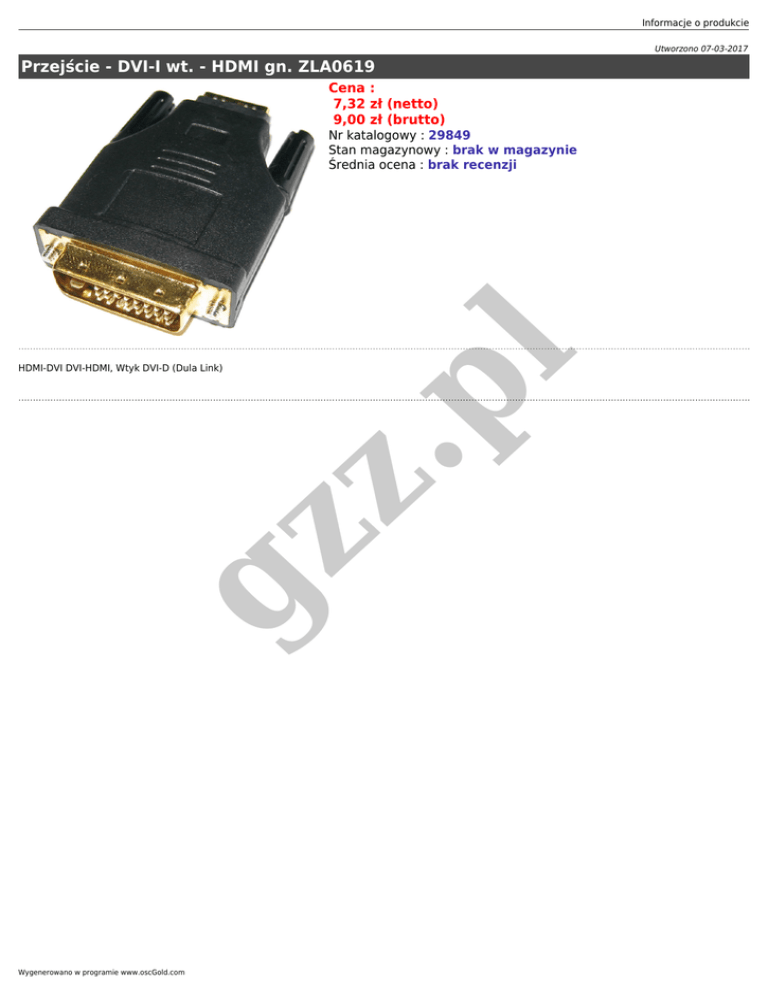 Informacje o produkcie Utworzono 07-03-2017 Przejście - DVI-I wt. - HDMI gn. ZLA0619 Cena : 7,32 zł (netto) 9,00 zł (brutto) gz z HDMI-DVI DVI-HDMI, Wtyk DVI-D (Dula Link) .p l Nr katalogowy : 29849 Stan magazynowy : brak w magazynie Średnia ocena : brak recenzji Wygenerowano w programie www.oscGold.com