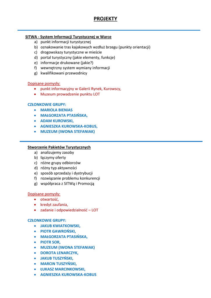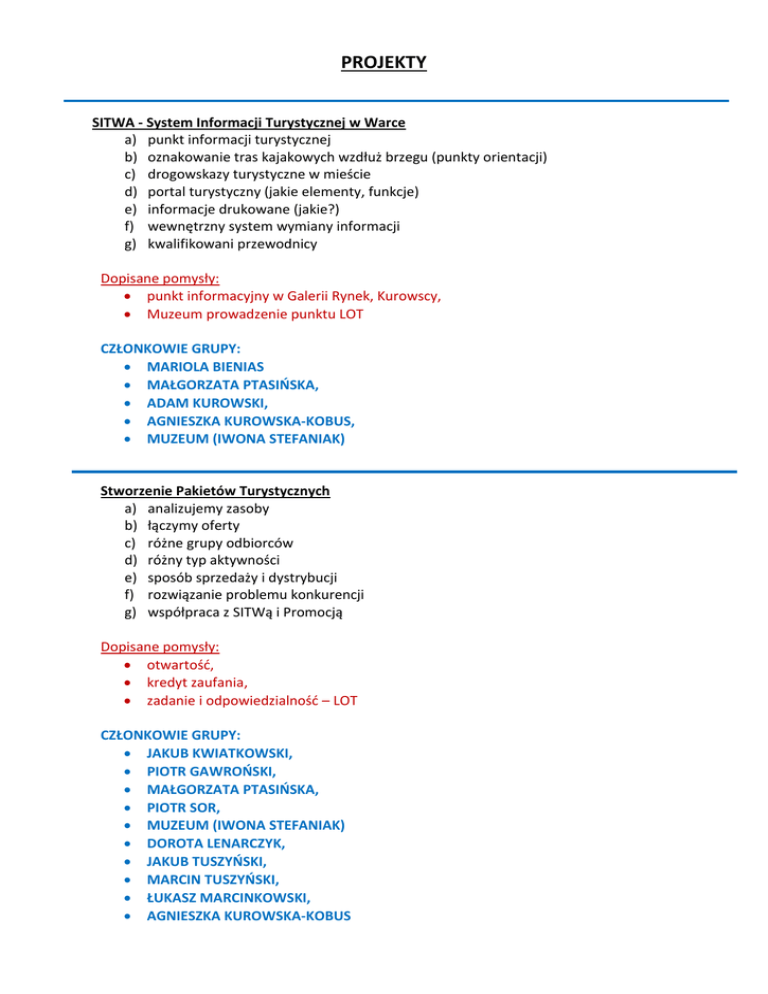 PROJEKTY SITWA - System Informacji Turystycznej w Warce a) punkt informacji turystycznej b) oznakowanie tras kajakowych wzdłuż brzegu (punkty orientacji) c) drogowskazy turystyczne w mieście d) portal turystyczny (jakie elementy, funkcje) e) informacje drukowane (jakie?) f) wewnętrzny system wymiany informacji g) kwalifikowani przewodnicy Dopisane pomysły: punkt informacyjny w Galerii Rynek, Kurowscy, Muzeum prowadzenie punktu LOT CZŁONKOWIE GRUPY: MARIOLA BIENIAS MAŁGORZATA PTASIŃSKA, ADAM KUROWSKI, AGNIESZKA KUROWSKA-KOBUS, MUZEUM (IWONA STEFANIAK) Stworzenie Pakietów Turystycznych a) analizujemy zasoby b) łączymy oferty c) różne grupy odbiorców d) różny typ aktywności e) sposób sprzedaży i dystrybucji f) rozwiązanie problemu konkurencji g) współpraca z SITWą i Promocją Dopisane pomysły: otwartość, kredyt zaufania, zadanie i odpowiedzialność – LOT CZŁONKOWIE GRUPY: JAKUB KWIATKOWSKI, PIOTR GAWROŃSKI, MAŁGORZATA PTASIŃSKA, PIOTR SOR, MUZEUM (IWONA STEFANIAK) DOROTA LENARCZYK, JAKUB TUSZYŃSKI, MARCIN TUSZYŃSKI, ŁUKASZ MARCINKOWSKI, AGNIESZKA KUROWSKA-KOBUS Zagospodarowanie Brzegów Pilicy a) plaża b) kąpielisko c) deptak, szlak rowerowy wzdłuż brzegu d) ławeczki e) wodowanie Dopisane pomysły: Plan zagospodarowania brzegów Pilicy(UM) Wyciąg nart wodnych off-road, 4x4, Warka-Team sport, rowery, dertpark, skimborading starostwo powiatowe, LOT kosze na śmieci aspekty prawne związane z utworzeniem kąpieliska koło wędkarskie w Warce policja, straż CeSiR – ratownicy koniecznie przedstawiciel najwyższych władz UM CZŁONKOWIE GRUPY: JANUSZ KRECZMAŃSKI ŁUKASZ MARCINKOWSKI, PIOTR GAWROŃSKI, JAKUB TUSZYŃSKI Analiza i rozwój a) nowe projekty (nowe grupy robocze) b) nowe inwestycje w turystykę c) kina, sceny teatralne, muszli koncertowej d) inspirowanie biznesu e) ściąganie inwestorów f) działania lobbystyczne g) wskazywanie niezagospodarowanych nisz Dopisane pomysły: urząd miasta! partnerzy zewnętrzni (MROT), Góra Kalwaria działanie u podstaw, starostwo powiatowe w Grójcu silne wsparcie LOT CZŁONKOWIE GRUPY: JAKUB KWIATKOWSKI, ŁUKASZ MARCINKOWSKI Kluczowa impreza promująca region a) dla kogo? b) z kim? c) kiedy? d) gdzie? e) pomysły f) partnerzy Dopisane pomysły: wareckie specjały, promocja produktów lokalnych(jabłka, sok jabłkowy, cydr, miody, świeże warzywa, targowisko, rękodzieło) święto Warki z festiwalem sztuk lokalnych tak jak jarmark dominikański, sandomierski, kazimierzowski gdzie każdy może przedstawić swoją ofertę np. festiwal powielenia w Warszawie na Powiślu CZŁONKOWIE GRUPY: KUBA TUSZYŃSKI MARCIN TUSZYŃSKI MACIEJ PTASIŃSKI MUZEUM (IWONA STEFANIAK) Wspólny kalendarz imprez a) kalendarz imprez zaplanowanych przez różne organizacje i firmy na najbliższy rok b) opracowanie metody aktualizacji kalendarza c) koordynacja ustalania terminów imprez Dopisane pomysły: Viralla dla LOT CZŁONKOWIE GRUPY: MACIEJ PTASIŃSKI MUZEUM (IWONA STEFANIAK) ŁUKASZ MARCINKOWSKI, . Promocja i reklama a) tworzenie marki b) zaplanowanie kampanii c) opracowanie ulotek, folderów d) realizacja oznakowania IT e) działania PR (prasa) Dopisane pomysły Marketing internetowy, social media obniżenie kosztów wybór skutecznych narzędzi współpraca z mediami, promocja produktów lokalnych – Wareckie Specjały gadżety CZŁONKOWIE GRUPY: ADAM KUROWSKI, PIOTR GAWROŃSKI Finansowanie projektów a) poszukiwanie źródeł finansowania zewnętrznego b) propozycje projektów c) wnioskowanie d) projekty partnerskie (współfinansowanie) Dopisane pomysły wciągnąć LGD fundusze dla rolników na agroturystyke(Manager Projekt) zagospodarowanie brzegów Pilicy wyposażenie: ławki, kosze, miejsca do wodowania finansowanie działań promocyjnych CZŁONKOWIE GRUPY: DOROTA LENARCZYK, ADAM KUROWSKI, JAKUB TUSZYŃSKI, JANUSZ KRECZMAŃSKI, ŁUKASZ MARCINKOWSKI
