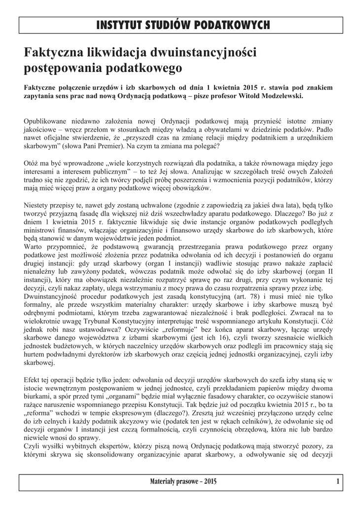INSTYTUT STUDIÓW PODATKOWYCH Faktyczna likwidacja dwuinstancyjności postępowania podatkowego Faktyczne połączenie urzędów i izb skarbowych od dnia 1 kwietnia 2015 r. stawia pod znakiem zapytania sens prac nad nową Ordynacją podatkową – pisze profesor Witold Modzelewski. Opublikowane niedawno założenia nowej Ordynacji podatkowej mają przynieść istotne zmiany jakościowe – wręcz przełom w stosunkach między władzą a obywatelami w dziedzinie podatków. Padło nawet oficjalne stwierdzenie, że „przyszedł czas na zmianę relacji między podatnikiem a urzędnikiem skarbowym” (słowa Pani Premier). Na czym ta zmiana ma polegać? Otóż ma być wprowadzone „wiele korzystnych rozwiązań dla podatnika, a także równowaga między jego interesami a interesem publicznym” – to też Jej słowa. Analizując w szczegółach treść owych Założeń trudno się nie zgodzić, że ich twórcy podjęli próbę poszerzenia i wzmocnienia pozycji podatników, którzy mają mieć więcej praw a organy podatkowe więcej obowiązków. Niestety przepisy te, nawet gdy zostaną uchwalone (zgodnie z zapowiedzią za jakieś dwa lata), będą tylko tworzyć przyjazną fasadę dla większej niż dziś wszechwładzy aparatu podatkowego. Dlaczego? Bo już z dniem 1 kwietnia 2015 r. faktycznie likwiduje się dwie instancje organów podatkowych podległych ministrowi finansów, włączając organizacyjnie i finansowo urzędy skarbowe do izb skarbowych, które będą stanowić w danym województwie jeden podmiot. Warto przypomnieć, że podstawową gwarancją przestrzegania prawa podatkowego przez organy podatkowe jest możliwość złożenia przez podatnika odwołania od ich decyzji i postanowień do organu drugiej instancji: gdy urząd skarbowy (organ I instancji) wadliwie stosując prawo nakaże zapłacić nienależny lub zawyżony podatek, wówczas podatnik może odwołać się do izby skarbowej (organ II instancji), który ma obowiązek niezależnie rozpatrzyć sprawę po raz drugi, przy czym wykonanie tej decyzji, czyli nakaz zapłaty, ulega wstrzymaniu z mocy prawa do czasu rozpatrzenia sprawy przez izbę. Dwuinstancyjność procedur podatkowych jest zasadą konstytucyjną (art. 78) i musi mieć nie tylko formalny, ale przede wszystkim materialny charakter: urzędy skarbowe i izby skarbowe muszą być odrębnymi podmiotami, którym trzeba zagwarantować niezależność i brak podległości. Zwracał na to wielokrotnie uwagę Trybunał Konstytucyjny interpretując treść wspomnianego artykułu Konstytucji. Cóż jednak robi nasz ustawodawca? Oczywiście „reformuje” bez końca aparat skarbowy, łącząc urzędy skarbowe danego województwa z izbami skarbowymi (jest ich 16), czyli tworzy szesnaście wielkich jednostek budżetowych, w których naczelnicy urzędów skarbowych oraz podlegli im pracownicy stają się hurtem podwładnymi dyrektorów izb skarbowych oraz częścią jednej jednostki organizacyjnej, czyli izby skarbowej. Efekt tej operacji będzie tylko jeden: odwołania od decyzji urzędów skarbowych do szefa izby staną się w istocie wewnętrznym postępowaniem w jednej jednostce, czyli przekładaniem papierów między dwoma biurkami, a spór przed tymi „organami” będzie miał wyłącznie fasadowy charakter, co oczywiście stanowi rażące naruszenie wspomnianego przepisu Konstytucji. Tak będzie już od początku kwietnia 2015 r., bo ta „reforma” wchodzi w tempie ekspresowym (dlaczego?). Zresztą już wcześniej przyłączono urzędy celne do izb celnych i każdy podatnik akcyzowy wie (podatek ten jest w rękach celników), że odwołanie się od decyzji organów I instancji jest czczą formalnością, czyli czynnością obrzędową, która nic lub bardzo niewiele wnosi do sprawy. Czyli wysiłki wybitnych ekspertów, którzy piszą nową Ordynację podatkową mają stworzyć pozory, za którymi skrywa się skonsolidowany organizacyjnie aparat skarbowy, a odwoływanie się od decyzji Materia³y prasowe – 2015 1 INSTYTUT STUDIÓW PODATKOWYCH urzędów do izb skarbowych nie będzie miało jakiegokolwiek sensu poza wypełnianiem biurokratycznych rytuałów. Żyjemy w świecie fałszywych fasad, za którymi kryje się proza realnego rządzenia. Ponoć m.in. za pomysł przyłączenia urzędów do izb skarbowych w związku z „informatyzacją aparatu skarbowego” zagraniczna firma doradcza wzięła kilkanaście milionów złotych: tego rodzaju informacje przed kilku laty były podawane przez media („Rzeczpospolita” z 16.09.11 wersja elektroniczna) i nikt im chyba nie zaprzeczył. W lutym tego roku zwróciłem się do Pana Prezydenta, aby nie podpisywał tej ustawy, bo jest sprzeczna z Konstytucją: widać, mojego listu nie dostarczono mu, bo naruszenie art. 78 jest w tym przypadku raczej bezsporne. Witold Modzelewski Profesor Uniwersytetu Warszawskiego Instytut Studiów Podatkowych http://ksiegowosc.infor.pl/wiadomosci/715057,Faktyczna-likwidacja-dwuinstancyjnosci-postepowania-podatkowego.html Materia³y prasowe – 2015 2
