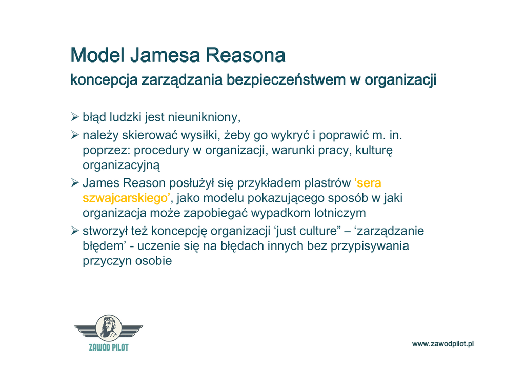Model Jamesa Reasona koncepcja zarządzania bezpieczeństwem w organizacji błąd ludzki jest nieunikniony, należy skierować wysiłki, żeby go wykryć i poprawić m. in. poprzez: procedury w organizacji, warunki pracy, kulturę organizacyjną James Reason posłużył się przykładem plastrów ‘sera szwajcarskiego’, szwajcarskiego’ jako modelu pokazującego sposób w jaki organizacja może zapobiegać wypadkom lotniczym stworzył też koncepcję organizacji ‘just culture” – ‘zarządzanie błędem’ - uczenie się na błędach innych bez przypisywania przyczyn osobie www.zawodpilot.pl Warunki zaistnienia ‘just ‘just culture’ culture’ Opisana i sformalizowana polityka bezpieczeństwa Zaufanie do organizacji – jednostka nie będzie karana za błąd niezamierzony, a jedynie za świadome działania wbrew procedurom i działania powodowane zaniedbaniami Organizacja informuje o zagrożeniach i ryzyku Definiowanie postaw i działań akceptowalnych i nieakceptowanych, nieakceptowanych (opisuje i stosuje sankcje za nieakceptowane zachowania) Edukacja i konstruktywna analiza działań niebezpiecznych w celu poprawy świadomości zagrożeń - szkolenia www.zawodpilot.pl