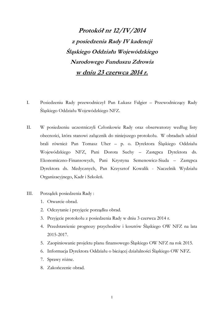 Protokół nr 12/IV/2014 z posiedzenia Rady IV kadencji Śląskiego Oddziału Wojewódzkiego Narodowego Funduszu Zdrowia w dniu 23 czerwca 2014 r. I. Posiedzeniu Rady przewodniczył Pan Łukasz Falgier – Przewodniczący Rady Śląskiego Oddziału Wojewódzkiego NFZ. II. W posiedzeniu uczestniczyli Członkowie Rady oraz obserwatorzy według listy obecności, która stanowi załącznik do niniejszego protokołu. W obradach udział brali również Pan Tomasz Uher – p. o. Dyrektora Śląskiego Oddziału Wojewódzkiego NFZ, Pani Dorota Suchy – Zastępca Dyrektora ds. Ekonomiczno-Finansowych, Pani Krystyna Semenowicz-Siuda – Zastępca Dyrektora ds. Medycznych, Pan Krzysztof Kowalik - Naczelnik Wydziału Organizacyjnego, Kadr i Szkoleń. III. Porządek posiedzenia Rady : 1. Otwarcie obrad. 2. Odczytanie i przyjęcie porządku obrad. 3. Przyjęcie protokołu z posiedzenia Rady w dniu 3 czerwca 2014 r. 4. Przedstawienie prognozy przychodów i kosztów Śląskiego OW NFZ na lata 2015-2017. 5. Zaopiniowanie projektu planu finansowego Śląskiego OW NFZ na rok 2015. 6. Informacja Dyrektora Oddziału o bieżącej działalności Śląskiego OW NFZ. 7. Sprawy różne. 8. Zakończenie obrad. 1 Ad.III.1-2 Przewodniczący Rady Oddziału Śląskiego OW NFZ Pan Łukasz Falgier po otwarciu obrad stwierdził, że na sali znajduje się siedmiu członków Rady, co wobec jej ustawowego składu wynoszącego dziewięć osób stanowi kworum niezbędne do podejmowania uchwał. Następnie odczytał porządek obrad, który wobec braku wniosków w sprawie ewentualnych zmian Rada Oddziału jednogłośnie przyjęła. Ad.III.3. Następnie Przewodniczący Łukasz Falgier poddał pod głosowanie przyjęcie protokołu z posiedzenia Rady w dniu 23 czerwca 2014 r. Członkowie Rady jednogłośnie opowiedzieli się za przyjęciem przedmiotowego protokołu stosunkiem głosów siedem „za” przy siedmiu obecnych na sali Członkach Rady. Ad.III.4-5 Pani Dyrektor Suchy przedstawiła zebranym prognozę przychodów i kosztów Śląskiego OW NFZ na najbliższe trzy lata. Pani Dyrektor podkreśliła, że w planie finansowym Śląskiego OW NFZ na 2015 r. zaplanowano środki finansowe w wysokości 7 834 612 tys. zł, czyli o więcej o 243 960 tys. zł niż w roku obecnym. W latach 2016 i 2017 kwota ta wynosić ma odpowiednio 8 250 382 tys. zł i 8 725 775 tys. zł. Dynamika wzrostu środków na świadczenia opieki zdrowotnej w porównaniu do 2014 r. to średnio 105,12% Śląski Oddział Wojewódzki NFZ pod względem wysokości przeznaczonych na te świadczenia środków znajduje się na 2 miejscu w kraju. W przeliczeniu na jednego ubezpieczonego Oddział będzie dysponował kwotą 1913 zł. Pani Dyrektor poinformowała, że Śląski Oddział NFZ znajduje się pośród sześciu oddziałów mających tzw. dodatnią różnicę migracyjną, czyli otrzymuje więcej upoważnień do zaciągania zobowiązań z tytułu migracji ubezpieczonych, niż ich udziela. W 2015 r. będzie ona wynosiła 155 696 tys. zł. W przygotowanej prezentacji nt. projektu planu finansowego na 2015 r. Pani Dorota Suchy przedstawiła zebranym dane dotyczące kosztów świadczeń opieki zdrowotnej oraz założenia Centrali NFZ i Śląskiego OW NFZ dot. realizacji poszczególnych zakresów tych świadczeń. Pani Dorota Suchy wyjaśniła, jakie kwoty 2 zaplanowano na poszczególne rodzaje i zakresy świadczeń, wymieniając w szczególności, że z całkowitej sumy na leczenie szpitalne przypada 3 525 315 tys. zł, podstawową opiekę zdrowotną 923 414 tys. zł, na refundację 951 482 tys. zł, zaś na koszty administracyjne 62 405 tys. zł. Pani Dorota Suchy poinformowała również, że jeśli chodzi o finansowanie świadczeń wykonanych ponad limit określony w umowie, to środki finansowe przeznaczone na ten cel wzrosną w 2015 r. o 243 mln zł., a po zakończeniu przedstawiania prezentacji poprosiła o zadawanie pytań dotyczących zreferowanego materiału. Pan Łukasz Falgier komentując przedstawione informacje zwrócił uwagę na wzrost kosztów przeznaczonych na finansowanie świadczeń opieki zdrowotnej w porównaniu do lat ubiegłych. Zwrócił się też z zapytaniem, czy planowanie środków na refundację w wysokości podobnej jak w latach ubiegłych jest uzasadnione, skoro to właśnie w tym rozdziale pozostają one nie do końca wykorzystane oraz czy można przeznaczyć część tej puli na inne świadczenia zdrowotne. Pani Dyrektor Suchy wyjaśniła, że „ustawa refundacyjna” mówi o całkowitym koszcie refundacji, nie tylko lekowej, ale również dotyczącej chemioterapii czy programów zdrowotnych. W przypadku 2015 r., jak określają przepisy, ma to być nie mniej niż koszty roku 2011. Jak zaznaczyła, Śląski OW NFZ na refundację leków przeznacza najmniejszą możliwą pulę środków, aby nie dopuścić do ich niewykorzystania, ponieważ nie można jej przesunąć na sfinansowanie zakupu innego rodzaju świadczeń. Po zakończeniu dyskusji Pan Przewodniczący zapoznał zebranych z projektem uchwały w sprawie zaopiniowania projektu planu finansowego na 2015 r. W wyniku prawidłowo przeprowadzonego głosowania Rada Śląskiego OW NFZ jednogłośnie przyjęła uchwałę w sprawie pozytywnego zaopiniowania projektu planu finansowego na 2015 r. Uchwała stanowi załącznik do niniejszego protokołu. Ad.III.6-7 Pełniący obowiązki Dyrektora Śląskiego OW NFZ Pan Tomasz Uher przedstawił Członkom Rady informację na temat bieżącej działalności Oddziału. Poinformował, że aktualnie w Oddziale trwa kontrola Najwyższej Izby Kontroli w zakresie „Opieki medycznej nad osobami w wieku podeszłym”. Następnie zapoznał Członków Rady 3 z problemem niezależnego od NFZ wygaśnięcia umowy NZOZ Bimed w Tarnowskich Górach na udzielanie świadczeń w rodzaju podstawowa opieka zdrowotna – nocna i świąteczna opieka zdrowotna na obszarze Tarnowskich Gór. Pan Tomasz Uher zapewnił, że zabezpieczony został dostęp pacjentów do tego 