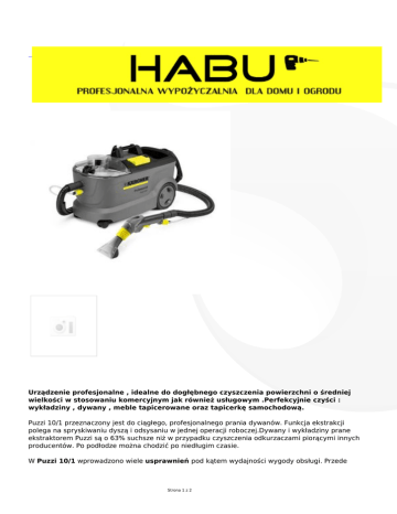 Urządzenie profesjonalne , idealne do dogłębnego czyszczenia powierzchni o średniej wielkości w stosowaniu komercyjnym jak również usługowym .Perfekcyjnie czyści : wykładziny , dywany , meble tapicerowane oraz tapicerkę samochodową. Puzzi 10/1 przeznaczony jest do ciągłego, profesjonalnego prania dywanów. Funkcja ekstrakcji polega na spryskiwaniu dyszą i odsysaniu w jednej operacji roboczej.Dywany i wykładziny prane ekstraktorem Puzzi są o 63% suchsze niż w przypadku czyszczenia odkurzaczami piorącymi innych producentów. Po podłodze można chodzić po niedługim czasie. W Puzzi 10/1 wprowadzono wiele usprawnień pod kątem wydajności wygody obsługi. Przede Strona 1 z 2 wszystkim zastosowano nową elastycznie zakończoną dyszę dywanową, która dopasowuje się do powierzchni i dzięki temu odsysa brudną wodę do 30% skuteczniej niż standardowe dysze ssące Strona 2 z 2