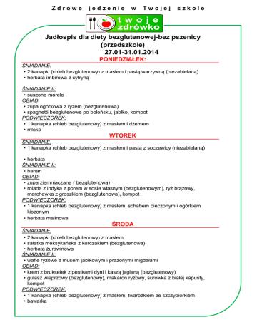 Zdrowe jedzenie w Twojej szkole Jadłospis dla diety bezglutenowej-bez pszenicy (przedszkole) 27.01-31.01.2014 PONIEDZIAŁEK: ŚNIADANIE: • 2 kanapki (chleb bezglutenowy) z masłem i pastą warzywną (niezabielaną) • herbata imbirowa z cytryną ŚNIADANIE II: • suszone morele OBIAD: • zupa ogórkowa z ryżem (bezglutenowa) • spaghetti bezglutenowe po bolońsku, jabłko, kompot PODWIECZOREK: • 1 kanapka (chleb bezglutenowy) z masłem i dżemem • mleko WTOREK ŚNIADANIE: • 1 kanapka (chleb bezglutenowy) z masłem i pastą z soczewicy (niezabielaną) • herbata ŚNIADANIE II: • banan OBIAD: • zupa ziemniaczana ( bezglutenowa) • rolada z indyka z porem w sosie własnym (bezglutenowym), ryż brązowy, marchewka z groszkiem (bezglutenowa), kompot PODWIECZOREK: • 1 kanapka (chleb bezglutenowy) z masłem, schabem pieczonym i ogórkiem kiszonym • herbata malinowa ŚRODA ŚNIADANIE: • 2 kanapki (chleb bezglutenowy) z masłem • sałatka meksykańska z kurczakiem (bezglutenowa) • herbata żurawinowa ŚNIADANIE II: • wafle ryżowe z musem jabłkowym i prażonymi migdałami OBIAD: • krem z brukselek z pestkami dyni i kaszą jaglaną (bezglutenowy) • gulasz wieprzowy (bezglutenowy), makaron ryżowy, surówka z białej kapusty, kompot PODWIECZOREK: • 1 kanapka (chleb bezglutenowy) z masłem, twarożkiem ze szczypiorkiem • bawarka Zdrowe jedzenie w Twojej szkole Jadłospis dla diety bezglutenowej-bez pszenicy (przedszkole) 27.01-31.01.2014 CZWARTEK ŚNIADANIE: • 1 kanapka (chleb bezglutenowy) z masłem, pieczenią drobiową i rukolą • płatki ryżowe z mlekiem • herbata ŚNIADANIE II: • mandarynka OBIAD: • zupa grochowa z ziemniakami (bezglutenowa) • strogonow warzywny z wołowiną (bezglutenowy), kasza gryczana, kompot PODWIECZOREK: • pancakes dietetyczne bezglutenowe z polewą z owoców leśnych • herbata PIĄTEK ŚNIADANIE: • 2 kanapki (chleb bezglutenowy) z masłem i pastą jajeczną (niezabielaną) z zieloną pietruszką • mleko ŚNIADANIE II: • kiwi OBIAD: • zupa brokułowa z makaronem (bezglutenowa) • ryba panierowana (bezglutenowa), ziemniaki, surówka z kiszonej kapusty, kompot PODWIECZOREK: • 1 kanapka (chleb bezglutenowy) z masłem, serem żółtym i pomidorem • herbata miętowa