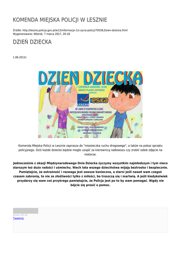 KOMENDA MIEJSKA POLICJI W LESZNIE Źródło: http://leszno.policja.gov.pl/w13/informacje-1/z-zycia-policji/70558,Dzien-dziecka.html Wygenerowano: Wtorek, 7 marca 2017, 20:18 DZIEŃ DZIECKA 1.06.2012r. Komenda Miejska Policji w Lesznie zaprasza do "miasteczka ruchu drogowego", a także na pokaz sprzętu policyjnego. Dziś każde dziecko będzie mogło usiąść za kierownicą radiowozu czy zrobić sobie zdjęcie na motorze. Jednocześnie z okazji Międzynarodowego Dnia Dziecka życzymy wszystkim najmłodszym i tym nieco starszym też dużo radości i uśmiechu. Niech lata wszego dzieciństwa mijają beztrosko i bezpiecznie. Pamiętajcie, że ostrożność i rozwaga jest zawsze konieczna, a starsi jeśli nawet wam czegoś czasem zabronią, to nie ze złośliwości tylko z miłości, bo troszczą się i martwią. A jeśli kiedykolwiek przydarzy się wam coś przykrego pamiętajcie, że Policja jest po to by wam pomagać. Nigdy nie bójcie się prosić o pomoc. Ocena: 0/5 (0) Tweetnij