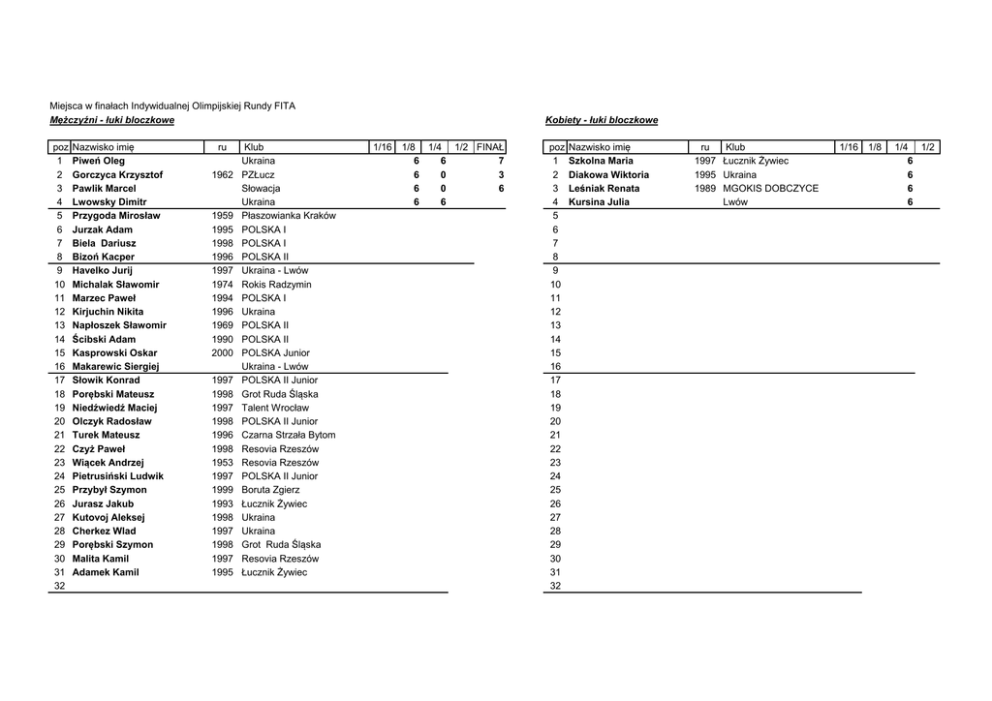 Miejsca w finałach Indywidualnej Olimpijskiej Rundy FITA Mężczyźni - łuki bloczkowe poz 1 2 3 4 5 6 7 8 9 10 11 12 13 14 15 16 17 18 19 20 21 22 23 24 25 26 27 28 29 30 31 32 Nazwisko imię Piweń Oleg Gorczyca Krzysztof Pawlik Marcel Lwowsky Dimitr Przygoda Mirosław Jurzak Adam Biela Dariusz Bizoń Kacper Havelko Jurij Michalak Sławomir Marzec Paweł Kirjuchin Nikita Napłoszek Sławomir Ścibski Adam Kasprowski Oskar Makarewic Siergiej Słowik Konrad Porębski Mateusz Niedźwiedź Maciej Olczyk Radosław Turek Mateusz Czyż Paweł Wiącek Andrzej Pietrusiński Ludwik Przybył Szymon Jurasz Jakub Kutovoj Aleksej Cherkez Wlad Porębski Szymon Malita Kamil Adamek Kamil ru 1962 1959 1995 1998 1996 1997 1974 1994 1996 1969 1990 2000 1997 1998 1997 1998 1996 1998 1953 1997 1999 1993 1998 1997 1998 1997 1995 Klub Ukraina PZŁucz Słowacja Ukraina Płaszowianka Kraków POLSKA I POLSKA I POLSKA II Ukraina - Lwów Rokis Radzymin POLSKA I Ukraina POLSKA II POLSKA II POLSKA Junior Ukraina - Lwów POLSKA II Junior Grot Ruda Śląska Talent Wrocław POLSKA II Junior Czarna Strzała Bytom Resovia Rzeszów Resovia Rzeszów POLSKA II Junior Boruta Zgierz Łucznik Żywiec Ukraina Ukraina Grot Ruda Śląska Resovia Rzeszów Łucznik Żywiec Kobiety - łuki bloczkowe 1/16 1/8 1/4 1/2 FINAŁ 6 6 7 6 0 3 6 0 6 6 6 poz 1 2 3 4 5 6 7 8 9 10 11 12 13 14 15 16 17 18 19 20 21 22 23 24 25 26 27 28 29 30 31 32 Nazwisko imię Szkolna Maria Diakowa Wiktoria Leśniak Renata Kursina Julia ru Klub 1997 Łucznik Żywiec 1995 Ukraina 1989 MGOKIS DOBCZYCE Lwów 1/16 1/8 1/4 1/2 6 6 6 6 FINAŁ 6 2 7 1