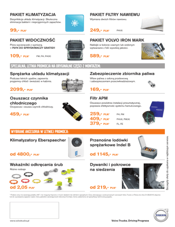 PAKIET KLIMATYZACJA PAKIET FILTRY NAWIEWU Dezynfekcja układu klimatyzacji. Skuteczna eliminacja bakterii i nieprzyjemnych zapachów. Wymiana dwóch filtrów nawiewu. 99,- PLN* 249,- PLN* PAKIET WIDOCZNOŚĆ PAKIET VOLVO IRON MARK Pióra wycieraczek z wymianą + PŁYN DO SPRYSKIWACZY GRATIS!!! Naklejki w kolorze czarnym lub srebrnym wytwarzane z folii wysokiej jakości. 109,- PLN* 589,- PLN* FM, FH, FH(4) FH(4) SPECJALNA, LETNIA PROMOCJA NA ORYGINALNE CZĘŚCI Z MONTAŻEM: Sprężarka układu klimatyzacji Zabezpieczenie zbiornika paliwa Podczas letnich upałów, zapewnia przyjemny chłód i świeżość w kabinie. Wlew paliwa z osłoną przelewową i zabezpieczeniem przeciwkradzieżowym. 2099,- PLN* 169,- PLN* Osuszacz czynnika chłodniczego Filtr APM Oczyszcza i osusza czynnik chłodniczy. 459,- PLN* Osuszacz powietrza instalacji pneumatycznej, poprawia efektywność systemu hamulcowego. 259,- PLN* 409,- PLN* 379,- PLN* FH, FM FH(4), FM(4) FL, FE Klimatyzatory Eberspaecher Przenośne lodówki sprężarkowe Indel B od 4800,- PLN* od 1145,- PLN* Wskaźniki odkręcania śrub Różne rodzaje Dywaniki i pokrowce na siedzenia od 2,05 PLN* od 219,- PLN* * Podane ceny nie zawierają podatku VAT i nie mogą być łączone z innymi rabatami lub ofertami specjalnymi. Ceny obowiązują w autoryzowanych serwisach Volvo Trucks w Polsce do dnia 31.08.2016 włącznie lub do wyczerpania zapasów części. Ceny pakietów zawierają koszt robocizny/montażu. Cena uzależniona od specyfikacji technicznej pojazdu. ww w.volvotrucks.pl Szczegóły oferty do uzyskania w najbliższym serwisie. wybrane akcesoria w letniej promocji: