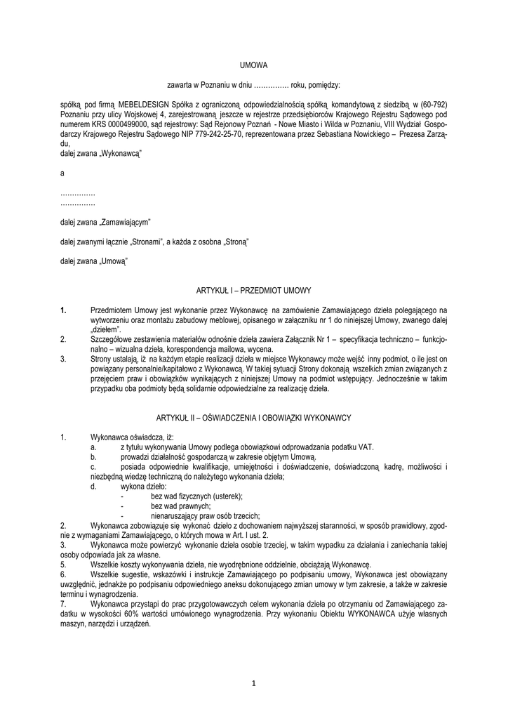 UMOWA zawarta w Poznaniu w dniu …………… roku, pomiędzy: spółką pod firmą MEBELDESIGN Spółka z ograniczoną odpowiedzialnością spółką komandytową z siedzibą w (60-792) Poznaniu przy ulicy Wojskowej 4, zarejestrowaną jeszcze w rejestrze przedsiębiorców Krajowego Rejestru Sądowego pod numerem KRS 0000499000, sąd rejestrowy: Sąd Rejonowy Poznań - Nowe Miasto i Wilda w Poznaniu, VIII Wydział Gospodarczy Krajowego Rejestru Sądowego NIP 779-242-25-70, reprezentowana przez Sebastiana Nowickiego – Prezesa Zarządu, dalej zwana „Wykonawcą” a …………… …………… dalej zwana „Zamawiającym” dalej zwanymi łącznie „Stronami”, a każda z osobna „Stroną” dalej zwana „Umową” ARTYKUŁ I – PRZEDMIOT UMOWY 1. 2. 3. Przedmiotem Umowy jest wykonanie przez Wykonawcę na zamówienie Zamawiającego dzieła polegającego na wytworzeniu oraz montażu zabudowy meblowej, opisanego w załączniku nr 1 do niniejszej Umowy, zwanego dalej „dziełem”. Szczegółowe zestawienia materiałów odnośnie dzieła zawiera Załącznik Nr 1 – specyfikacja techniczno – funkcjonalno – wizualna dzieła, korespondencja mailowa, wycena. Strony ustalają, iż na każdym etapie realizacji dzieła w miejsce Wykonawcy może wejść inny podmiot, o ile jest on powiązany personalnie/kapitałowo z Wykonawcą. W takiej sytuacji Strony dokonają wszelkich zmian związanych z przejęciem praw i obowiązków wynikających z niniejszej Umowy na podmiot wstępujący. Jednocześnie w takim przypadku oba podmioty będą solidarnie odpowiedzialne za realizację dzieła. ARTYKUŁ II – OŚWIADCZENIA I OBOWIĄZKI WYKONAWCY 1. Wykonawca oświadcza, iż: a. z tytułu wykonywania Umowy podlega obowiązkowi odprowadzania podatku VAT. b. prowadzi działalność gospodarczą w zakresie objętym Umową. c. posiada odpowiednie kwalifikacje, umiejętności i doświadczenie, doświadczoną kadrę, możliwości i niezbędną wiedzę techniczną do należytego wykonania dzieła; d. wykona dzieło: bez wad fizycznych (usterek); bez wad prawnych; nienarusząjący praw osób trzecich; 2. Wykonawca zobowiązuje się wykonać dzieło z dochowaniem najwyższej staranności, w sposób prawidłowy, zgodnie z wymaganiami Zamawiającego, o których mowa w Art. I ust. 2. 3. Wykonawca może powierzyć wykonanie dzieła osobie trzeciej, w takim wypadku za działania i zaniechania takiej osoby odpowiada jak za własne. 5. Wszelkie koszty wykonywania dzieła, nie wyodrębnione oddzielnie, obciążają Wykonawcę. 6. Wszelkie sugestie, wskazówki i instrukcje Zamawiającego po podpisaniu umowy, Wykonawca jest obowiązany uwzględnić, jednakże po podpisaniu odpowiedniego aneksu dokonującego zmian umowy w tym zakresie, a także w zakresie terminu i wynagrodzenia. 7. Wykonawca przystąpi do prac przygotowawczych celem wykonania dzieła po otrzymaniu od Zamawiającego zadatku w wysokości 60% wartości umówionego wynagrodzenia. Przy wykonaniu Obiektu WYKONAWCA użyje własnych maszyn, narzędzi i urządzeń. 1 ARTYKUŁ III – WYKONANIE DZIEŁA 1. 2. 3. 4. 5. 6. 7. 8. 9. 10. 11. 12. 13. 14. 15. Wykonawca wykona dzieło do dnia …………… roku, o ile nie zostaną zgłoszone przez Zamawiającego jakiekolwiek zmiany do dzieła i obiekt będzie w pełni przystosowany do zamontowania dzieła. Zamawiający dostarczy dzieło zgodnie z harmonogramem opisanym w załączniku nr 2 do niniejszej Umowy niezwłocznie po jego wykonaniu, nie później niż 3 dni po upływie daty wskazanej w ust. 1 powyżej, o ile nie zostaną zgłoszone przez Zamawiającego jakiekolwiek zmiany do dzieła. W przypadku, gdy Zamawiający nie jest gotowy do przyjęcia dzieła, wszelkie konsekwencje tego zdarzenia obciążają Zamawiającego, a tym także wskutek zmian wprowadzonych przez Zamawiającego do projektu dzieła, przesunięcia o czas opóźnienia w zapłacie przez Zamawiającego części wynagrodzenia, braku możliwości dokonania stosownych pomiarów, braku zakończenia prac budowlanych (murowanie, szpachlowanie, instalacje elektryczne, konstrukcyjne i inne) i przygotowawczych leżących po stronie Zamawiającego, uniemożliwiających pomiar i montaż. Jeśli Zamawiający nie wskaże Wykonawcy, że dostarczone dzieło ma usterki, Strony uznają że dzieło jest zaakceptowane przez Zamawiającego i Zamawiający przyjmuje dzieło w otrzymanej formie. Przyjęcie dzieła nie wyłącza odpowiedzialności Wykonawcy za usterki ukryte dzieła. Przez „usterkę” (wadę fizyczną) rozumie się w szczególności sytuację, w której: a. dzieło ma wadę zmniejszającą jego wartość lub użyteczność ze względu na cel w umowie oznaczony albo wynikający z okoliczności lub z przeznaczenia dzieła; b. dzieło zostało wydane Zamawiającemu w stanie niezupełnym; c. dzieło zostało wykonane niezgodnie z Załącznikiem Nr 1 lub instrukcjami, sugestiami lub wskazówkami Zamawiającego złożonymi Wykonawcy pisemnie i zawartym w tym zakresie aneksem do umowy; Jeśli dzieło ma Usterkę lub wadę prawną, Zamawiający może: a. wezwać Wykonawcę do usunięcia Usterki lub wady prawnej w wyznaczonym terminie – nie krótszym niż 14 dni; b. obniżyć wynagrodzenie o koszt usunięcia Usterki lub wady prawnej. Powyższe uprawnienia przysługują Zamawiającemu odpowiednio w sytuacjach, gdy Wykonawca nie dostarczył dzieła w przewidzianym terminie. Odbiór wykonanego dzieła nastąpi bezpośrednio po zakończeniu montażu dzieła. Zamawiający zobowiązany jest przystąpić do czynności odbioru dzieła w terminie wskazanym w ust. 1. Odbiór dzieła stwierdzony zostanie protokołem odbioru sporządzonym przez upoważnionych przedstawicieli obu Stron. W razie gdy w toku czynności odbioru ujawnione zostaną wady wykonanego dzieła, odbiór nie zostaje dokonany, zaś Wykonawca zobowiązany jest do usunięcia wad określonych w protokole z odbioru. Za wady nie uważa się uszkodzeń mechanicznych dzieła powstałych niezależnie od 