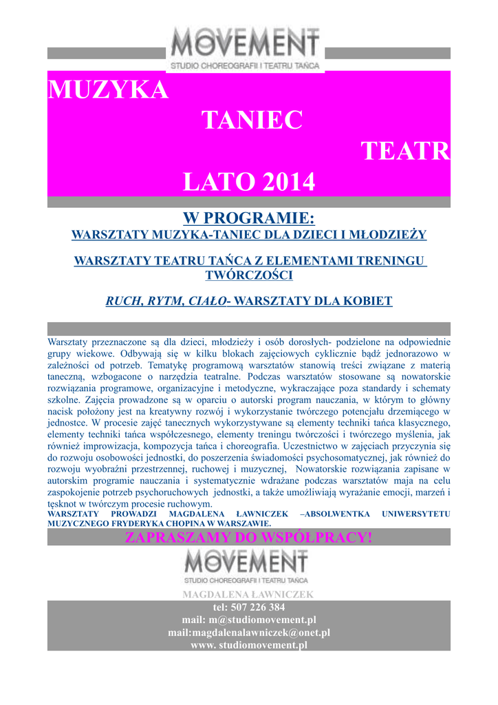 MUZYKA TANIEC TEATR LATO 2014 W PROGRAMIE: WARSZTATY MUZYKA-TANIEC DLA DZIECI I MŁODZIEŻY WARSZTATY TEATRU TAŃCA Z ELEMENTAMI TRENINGU TWÓRCZOŚCI RUCH, RYTM, CIAŁO- WARSZTATY DLA KOBIET Warsztaty przeznaczone są dla dzieci, młodzieży i osób dorosłych- podzielone na odpowiednie grupy wiekowe. Odbywają się w kilku blokach zajęciowych cyklicznie bądź jednorazowo w zależności od potrzeb. Tematykę programową warsztatów stanowią treści związane z materią taneczną, wzbogacone o narzędzia teatralne. Podczas warsztatów stosowane są nowatorskie rozwiązania programowe, organizacyjne i metodyczne, wykraczające poza standardy i schematy szkolne. Zajęcia prowadzone są w oparciu o autorski program nauczania, w którym to główny nacisk położony jest na kreatywny rozwój i wykorzystanie twórczego potencjału drzemiącego w jednostce. W procesie zajęć tanecznych wykorzystywane są elementy techniki tańca klasycznego, elementy techniki tańca współczesnego, elementy treningu twórczości i twórczego myślenia, jak również improwizacja, kompozycja tańca i choreografia. Uczestnictwo w zajęciach przyczynia się do rozwoju osobowości jednostki, do poszerzenia świadomości psychosomatycznej, jak również do rozwoju wyobraźni przestrzennej, ruchowej i muzycznej, Nowatorskie rozwiązania zapisane w autorskim programie nauczania i systematycznie wdrażane podczas warsztatów maja na celu zaspokojenie potrzeb psychoruchowych jednostki, a także umożliwiają wyrażanie emocji, marzeń i tęsknot w twórczym procesie ruchowym. WARSZTATY PROWADZI MAGDALENA ŁAWNICZEK MUZYCZNEGO FRYDERYKA CHOPINA W WARSZAWIE. –ABSOLWENTKA UNIWERSYTETU ZAPRASZAMY DO WSPÓŁPRACY! MAGDALENA ŁAWNICZEKTEL: tel: 507 226 384 mail: [email protected] mail:[email protected] www. studiomovement.pl 507 226 384