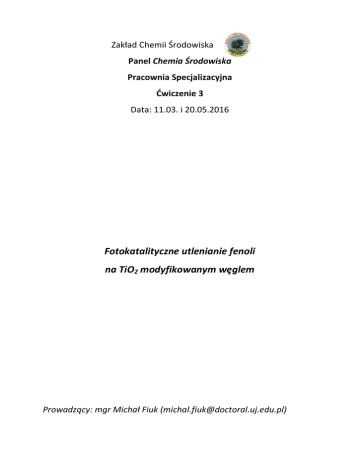 Zakład Chemii Środowiska Panel Chemia Środowiska Pracownia Specjalizacyjna Ćwiczenie 3 Data: 11.03. i 20.05.2016 Fotokatalityczne utlenianie fenoli na TiO2 modyfikowanym węglem Prowadzący: mgr Michał Fiuk ([email protected]) 1. Wprowadzenie Fotokataliza, według IUPAC [1] polega na wzroście szybkości reakcji lub jej inicjacji, pod wpływem promieniowania elektromagnetycznego z zakresu UV/Vis/(IR), w obecności substancji absorbującej promieniowanie nazywanej fotokatalizatorem. Na szczególną uwagę zasługuje fotokataliza heterogeniczna, w której jako fotokatalizatorów najczęściej używa się takich półprzewodników tlenkowych, jak np. TiO2. Tlenek tytanu(IV) znalazł wiele zastosowań fotokatalitycznych, takich jak: samoczyszczące pigmenty oraz pokrycia szkieł odpornych na zaparowywanie, oczyszczanie wody z zanieczyszczeń organicznych i mikrobiologicznych, powietrza z lotnych związków organicznych (LZO), usuwanie nieprzyjemnych zapachów czy też w produkcji materiałów samodezynfekujących się. Pomimo wysokiej aktywności katalitycznej wielu materiałów opartych na czystym TiO2, ze względu na dużą szerokość pasma wzbronionego (Eg = 3,2 eV dla anatazu i 3,02 eV dla rutylu [2]), możliwości ich wykorzystania w obecności światła widzialnego są stosunkowo niewielkie. Jedynie 2-3% promieniowania światła słonecznego z zakresu UV jest absorbowanych przez tlenek tytanu(IV) [3]. Z tego względu TiO2 poddaje się różnym modyfikacjom, m.in. poprzez fotosensybilizację związkami organicznymi czy też zaszczepianie na jego powierzchni chlorowcopochodnych metali przejściowych, co poprawia zdolności absorpcyjne tlenku tytanu(IV) w zakresie światła widzialnego. Inną z metod umożliwiających przesunięcie maksimum absorpcji promieniowania przez TiO2 powyżej 450 nm jest jego modyfikacja węglem. W trakcie reakcji katalitycznej dochodzi do aktywacji na powierzchni TiO2 tlenu molekularnego i generowania tzw. reaktywnych form tlenu (ROS, ang. Reactive Oxygen Species). Są to m.in. tlen singletowy i powierzchniowe formy ponadtlenkowe, które ze względu na wysoką reaktywność pozwalają na całkowite utlenienie wielu związków organicznych. W przypadku badanego układu C-TiO2, reakcja całkowitego utleniania 4-chlorofenolu jako modelowego zanieczyszczenia wody (1), jest inicjowana w wyniku generowania na powierzchni tlenku tytanu(IV) w obecności światła dziennego par elektron - dziura, które są pułapkowane i separowane w postaci powierzchniowych centrów redukujących i utleniających es- i hs+, odpowiednio. +13𝑂2 → 12𝐶𝑂2 + 2𝐻𝐶𝑙 + 4𝐻2 𝑂 (1) Transfer elektronu z powierzchni półprzewodnika TiO2 do molekularnego tlenu powoduje generowanie reaktywnych form tlenu, m.in. rodnika ponadtlenkowego O2- (2), rodnika hydroksylowego OH (3-4) i rodnika wodoronadtlenkowego HO2 (5) [4]. 𝑂2 + 𝑒𝑠− → 𝑂2− (2) 𝑂2− + 𝑒𝑠− + 2𝐻 + → 𝐻2 𝑂2 (3) 𝐻2 𝑂2 + 𝑒𝑠− → 𝑂𝐻 + 𝑂𝐻 − (4) 𝑂2− + 𝐻 + → 𝐻𝑂2 (5) Przy udziale reaktywnych form tlenu, m.in. 𝑂𝐻, dochodzi do całkowitego utlenienia 4 chlorofenolu (Rys. 1.) i obniżenia pH roztworu w wyniku oderwania cząsteczek HCl, w pełni zdysocjowanych w roztworze wodnym (1). 4-chlorofenol 4-chlorokatechol hydrochinon benzochinon dalsze niestabilne produkty utlenienia, w tym formy alifatyczne Rys 1. Schemat ilustrujący możliwe ścieżki degradacji 4-chlorofenolu w obecności rodnika wodorotlenowego - generowanego fotochemicznie na powierzchni TiO2, oraz główne produkty pośrednie fotodegradacji (na podstawie [5]). 2. Literatura [1] IUPAC. Compendium of Chemical Terminology, 2nd ed. (the "Gold Book"), pod red. A.D. McNaught and A. Wilkinson, Blackwell Scientific Publications 1997. [2] O. Carp et al., Prog. Solid State Chem.32(2004)33. [3] S. Sakthivel, H. Kisch, Angew. Chem. Int. Ed. 42(2003)4908. [4] Photocatalysis and Water Purification: From Fundamentals to Recent Applications, 1st ed. P. Pichat, Wiley-VCH 2013. [5] A. Mills, J. Wang, J. Photochem. Photobiol. A 118(1998)53. Pozycje literaturowe obejmujące wymagane na zajęciach zagadnienia: [6] Glosariusz terminologii fotochemicznej, przekład J. Najbar, A.M. Turek, Wyd. UJ 2014. [7] Wybrane metody spektroskopii i spektrometrii molekularnej w analizie strukturalnej, pod red. K. Małek i L. M. Proniewicza, Wyd. UJ 2005, rozdz. 1. [8] Podstawy Chemii Nieorganicznej, A. Bielański, PWN 2002, rozdz. 29.4 Karta charakterystyki 4-chlorofenolu dostępna pod adresem: [9] https://fagron.com/sites/default/files/document/msds_coa/106-48-9_(PL).pdf 3. Aparatura i stosowane odczynniki Odczynniki: wodny roztwór 4-chlorofenolu (2,5·10-4 mol/dm3), roztwór TiCl4 w n-butanolu (0,25 ml/dm3), wodny roztwór wodorotlenku tetrabutyloamoniowego TBAH (0,25 mol/dm3), KBr, ciekły azot, hel, wcześniej przygotowana próbka czystego anatazu a-TiO2. Sprzęt: spektrometr FT-IR Tensor 27 firmy Bruker™ z przystawką DRIFT firmy Specac, spektrometr UV-VIS Spectroquant Pharo 300 ((Merck Millipore), pH-metr Elmetron Cp401, mieszadło magnetyczne zaopatrzone w termoparę, piec muflowy SP-2002 firmy Czylok, suszarka laboratoryjna 4. Cel ćwiczenia Celem ćwiczenia jest synteza oraz zbadanie aktywności fotokatalitycznej próbek tlenku tytanu(IV) modyfikowanego węglem C-TiO2 w reakcji utleniania fenoli jako typowych zanieczyszczeń wód, na przykładzie 4-chlorofenolu. 5. Wykonanie ćwiczenia Zajęcia I: Synteza tlenku tytanu modyfikowanego węglem TiO2/C 1. Do zlewki ustawionej na mieszadle magnetycznym, zawierającej 50 ml 0,25 - molowego roztworu TiCl4 w butanolu, wkraplać powoli roztwór wodorotlenku tetrabutyloamoniowego o stężeniu 0,25 mol/dm3, aż do uzyskania pH 5,5. 2. Roztwór poddać starzeniu przez godzinę w temperaturze 40 oC. 3. Osad przesączyć, a następnie wysuszyć w temperaturze 70 oC. 4. Otrzymany wysuszony osad rozetrzeć w moździerzu, zważyć i podzielić na dwie równe czę