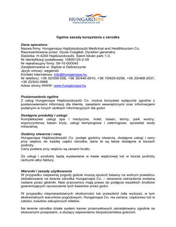 Ogólne zasady korzystania z ośrodka Dane operatora: Nazwa firmy: Hungarospa Hajdúszoboszló Medicinal and Healthtourism Co. Reprezentowana przez: Gyula Czeglédi, Dyrektor generalny Siedziba: H-4200 Hajdúszoboszló, Szent István park 1-3. Nr identyfikacji podatkowej: 10605125-2-09 Nr rejestracyjny firmy: 09-10-000045 Zarejestrowana w: Sądzie w Debreczynie Język umowy: węgierski Kontakt internetowy: [email protected] Nr telefonu: +36 52/558-558, +36 30/445-5910, +36 70/625-6256, +36 20/468-2537, +36 20/542-5888 Adres strony WWW: www.hungarospa.hu Postanowienia ogólne Z usług Hungarospa Hajdúszoboszló Co. można korzystać wyłącznie zgodnie z postanowieniami informacji dla klienta, zasadami wewnętrznymi oraz informacjami podanymi w innych ulotkach informacyjnych dla gości. Dostępne produkty i usługi: Kompleksowe usługi spa i medyczne, hotel, basen, termy, park wodny, wypoczynkowy basen kryty, usługi kempingowe i cateringowe, sprzedaż wody mineralnej. Godziny otwarcia i ceny Hungarospa Hajdúszoboszló Co. podaje godziny otwarcia, dostępne usługi i ceny przy wejściu do każdej części ośrodka; dane te są także dostępne w biurach podróży. Ceny podane przy wejściu są cenami brutto. Za usługi i produkty będą wystawiane w kasie wejściowej lub w biurze podróży rachunki albo faktury. Warunki i zasady użytkowania W przypadku niepewnej pogody goście muszą opuścić baseny na wolnym powietrzu zlokalizowane na terenie ośrodka Hungarospa Co. – stosowne ostrzeżenia zostaną nadane przez głośniki. Nasi pracownicy mają prawo do podjęcia wszelkich środków gwarantujących opuszczenie tych basenów przez gości. W przypadku nieprzewidzianych okoliczności lub przeszkód (siła wyższa), w tym ekstremalnych warunków pogodowych, Hungarospa Co. nie zwraca, częściowo lub w całości, kosztów zakupionych biletów. Na terenie ośrodka działa system kamer przemysłowych zainstalowany zgodnie ze stosownymi przepisami, a służący zapewnieniu bezpieczeństwa gościom. W celu ułatwienia transportu osób niepełnosprawnych, basen termalny jest czyszczony, a dla takich osób przewidziano specjalną przebieralnię, toaletę i prysznic. W uzasadnionych wypadkach Hungarospa Co może w godzinach pracy ośrodka zamknąć częściowo lub w całości wybrane obszary (np. z powodów technicznych lub imprez zamkniętych) i nie będzie się to wiązać ze zwrotem kosztów dla gości. Firma zastrzega sobie prawo do decydowania według własnego uznania, czy w przypadku ograniczenia usług ze względu na usterkę techniczną, dokona zwrotu kosztów biletów. Hungarospa Co. zapewnia usługi spa dostosowane do natężenia ruchu gości. Gwarancje i zobowiązania: Firma zobowiązuje się do świadczenia klientom dostępnych usług oraz sprzedaży dostępnych produktów o jakości zgodnej z oczekiwaną. Zarządzanie danymi Dane klientów pozyskane przez operatora będą przetwarzane pod nadzorem i zachowaniem poufności. Obsługa klienta i rozpatrywanie reklamacji Hungarospa Co. posiada przyjazny dla klienta system obsługi oraz rozpatrywania reklamacji dotyczących wszystkich aspektów jej działalności. Przy każdym wejściu na teren ośrodka klienci mogą uzyskać informację na temat warunków korzystania z ośrodka, zasad wewnętrznych oraz dostępności organów nadzorczych w przypadku ubiegania się o zadośćuczynienie. Dyrektor generalny firmy przyjmuje petentów co tydzień w wyznaczonych godzinach Można umówić się telefonicznie na spotkanie osobiste celem przekazania dyrektorowi swoich obserwacji lub skarg. Po zbadaniu sprawy klient otrzyma odpowiedź na piśmie. Klienci mogą wpisywać swoje uwagi i zastrzeżenie w Księdze gości umieszczonej przy wejściu. Uwagi można także zgłaszać pocztą (tradycyjną lub elektroniczną). Firma odpowiada pisemnie w ciągu 15 dni. Goście mogą także zgłosić zastrzeżenia każdemu pracownikowi ośrodka. Pracownik taki wedle własnego uznania kontaktuje się z kierownikiem działu albo samodzielnie rozwiązuje problem. Reklamacje międzynarodowe: W przypadku gdy Hungarospa Co. odrzuci reklamację klienta spoza Węgier, zamieszkującego jeden z krajów członkowskich Unii Europejskiej lub Islandię czy Norwegię klient taki może złożyć skargę w Europejskim Centrum konsumenckim w swoim kraju w celu osiągnięcia porozumienia z firmą Hungarospa Co. Zakres działania Europejskiego Centrum Konsumenckiego w swoim kraju można sprawdzić na europejskiej stronie organizacji: http://ec.europa.eu/consumers/ecc/index_en.htm. Życzymy przyjemnego pobytu, zdrowia i świetnej zabawy w wodzie! Listopad 2013 r.