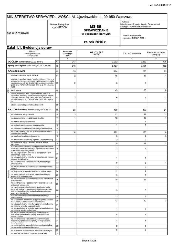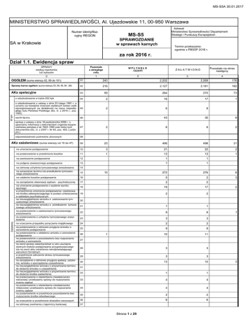 MS-S5A 30.01.2017 MINISTERSTWO SPRAWIEDLIWOŚCI, Al. Ujazdowskie 11, 00-950 Warszawa Numer identyfikacyjny REGON Adresat Ministerstwo Sprawiedliwości Departament Strategii i Funduszy Europejskich MS-S5 SPRAWOZDANIE w sprawach karnych SA w Krakowie Termin przekazania: zgodnie z PBSSP 2016 r. za rok 2016 r. Dział 1.1. Ewidencja spraw SPRAWY według repertoriów lub wykazów 0 Pozostało z ubiegłego roku WPŁYNĘŁO 1 2 4 01 243 Sprawy karne ogółem (suma wierszy 03, 09, 48, 84 , 88) 02 AKa apelacyjne W tym OGÓŁEM (suma wierszy 02, 99 do 101) 3 4 2.202 2.269 176 216 2.127 2.181 162 03 59 284 270 73 o odszkodowanie w trybie 552 kpk 04 2 16 17 1 o odszkodowania z ustawy z dnia 23 lutego 1991 r. o uznaniu za nieważne orzeczeń wydanych wobec osób represjonowanych za działalność na rzecz niepodległego bytu Państwa Polskiego (Dz. U. z 2015 r., poz. 1583) 05 2 6 8 wyrok łączny 06 43 35 8 sprawy z ustawy z dnia 18 października 2006 r. o ujawnianiu informacji o dokumentach organów bezpieczeństwa państwa z lat 1944-1990 oraz treści tych dokumentów (Dz. U. z 2007 r. Nr 63, poz. 425, z późn. zm.) 07 2 6 6 2 odpowiedzialność podmiotów zbiorowych 08 AKz zażaleniowe (suma wierszy od 10 do 47) 09 23 496 498 21 na umorzenie postępowania 10 3 21 22 2 na postanowienie w przedmiocie kosztów 11 1 13 13 1 na zawieszenie postępowania 12 1 1 na podjęcie zawieszonego postępowania 13 1 1 na odmowę uchylenia tymczasowego aresztowania 14 na oznaczenie terminu lub przedłużenie tymczasowego aresztowania 15 272 276 6 na ustalenie kosztów postępowania 16 5 2 3 na zarządzenie obserwacji sądowo- psychiatrycznej 17 2 2 18 19 17 19 2 2 21 1 1 22 9 8 23 3 3 24 2 2 na umorzenie postępowania o wydanie wyroku łącznego w przedmiocie umorzenia postępowania i zastosowania środka zabezpieczającego w postaci umieszczenia w zakładzie psychiatrycznym na nieuwzględnienie wniosku o zastosowanie tymczasowego aresztowania na nieuwzględnienia wniosku o przedłużenie tymczasowego aresztowania na postanowienie o zastosowaniu tymczasowego aresztowania na postanowienie o uchyleniu tymczasowego aresztowania Zażalenie Pozostało na okres następny ZAŁATW IONO razem na orzeczenie przepadku poręczenia majątkowego na postanowienie o odmowie przyjęcia wniosku o wznowienie postępowania na postanowienie o oddaleniu wniosku o wznowienie postępowania na postanowienie o pozostawieniu bez rozpoznania wniosku o wznowienie na zwrot sprawy oskarżycielowi w celu usunięcia istotnych braków postępowania przygotowawczego lub na zwrot aktu oskarżenia nieodpowiadającego warunkom formalnym w przedmiocie zaliczenia okresu tymczasowego aresztowania na zarządzenie o odmowie przyjęcia apelacji, zażalenia, wniosku o sporządzenie uzasadnienia na nieuwzględnienie wniosku o przywrócenie terminu do złożenia wniosku o uzasadnienie na nieuwzględnienie wniosku o przywrócenie terminu do złożenia środka zaskarżenia na postanowienie o stwierdzeniu niewłaściwości rzeczowej i przekazaniu sprawy do rozpoznania innemu sądowi na postanowienie o stwierdzeniu niewłaściwości miejscowej i przekazaniu sprawy do rozpoznania innemu sądowi na postanowienie w przedmiocie pozostawienia bez rozpoznania środka odwoławczego 10 2 20 25 26 1 9 9 10 11 3 3 1 27 28 29 3 3 30 13 10 32 1 1 33 4 4 34 4 4 35 2 2 na orzeczenie w przedmiocie dowodów rzeczowych 36 6 6 na odmowę zwolnienia z tajemnicy bankowej 37 31 Strona 1 z 25 3 MS-S5A 30.01.2017 Dział 1.1. Ewidencja spraw (c.d.) Pozostało z ubiegłego roku SPRAWY według repertoriów lub wykazów Zażalenie (dok.) 0 WPŁYNĘŁO razem ZAŁATW IONO 2 4 3 1 Pozostało na okres następny 4 na sprostowanie oczywistej omyłki pisarskiej w przedmiocie zabezpieczenia majątkowego na postanowienie o zwolnieniu z obowiązku zachowywania tajemnicy zawodowej na postanowienie o zwolnieniu z obowiązku zachowywania tajemnicy związanej z pełnioną funkcją 38 39 1 13 1 13 40 1 8 9 na postanowienie o ukaraniu karą porządkową 42 1 1 2 45 46 47 5 5 4 59 5 4 61 3 48 95 1.201 1.252 44 udzielenie warunkowego zwolnienia odmowę udzielenia warunkowego zwolnienia odwołanie warunkowego zwolnienia odmowę odwołania warunkowego zwolnienia umorzenie postępowania wykonawczego odmowę umorzenia postępowania wykonawczego 49 50 51 52 53 54 2 37 10 13 518 75 15 543 81 12 4 1 1 zawieszenie postępowania wykonawczego odmowę zawieszenia postępowania wykonawczego umorzenie należności sądowych odmowę umorzenia należności sądowych 55 56 57 58 35 5 1 5 34 5 1 4 udzielenie przerwy w odbywaniu kary 59 odmowę udzielenia przerwy w odbywaniu kary odroczenie wykonania kary 60 61 19 62 6 5 1 246 1 29 9 odmowę odroczenia wykonania kary zarządzenie wykonania zastępczej kary pozbawienia wolności lub pracy społecznie użytecznej odmowę wykonania zastępczej kary pozbawienia wolności lub pracy społecznie użytecznej zarządzenie wykonania kary pozbawienia wolności odmowę wykonania kary pozbawienia wolności odwołanie odroczenia lub rozłożenia na raty kary grzywny odmowę odwołania odroczenia lub rozłożenia na raty kary grzywny odroczenie spłaty lub rozłożenie na raty należności sądowych odmowę odroczenia spłaty lub rozłożenia na raty należności sądowych 5 1 236 1 24 63 2 14 13 3 9 1 8 1 1 7 7 1 2 rozstrzygnięcie wątpliwości co do obliczenia kary 71 1 1 72 1 1 11 15 1 sprzeczności interesów w obronie Zażalenie w przedmiocie zasądzenia świadkowi zwrotu kosztów podróży i odszkodowania za utracony zarobek przyznania wynagrodzenia biegłemu ENA Inne Zażalenie na AKzw zażaleniowe w postępowaniu wykonawczym (suma wierszy od 49 do 83) odmowę rozstrzygnięcia wątpliwości co do obliczenia kary ustanowienie, rozszerzenie lub zmianę obowiązków przy karze z warunkowym zawieszeniem wykonania, przy warunkowym zwolnieniu lub warunkowym umorzeniu postępowania odmowę ustanowienia, rozszerzenia lub zmiany obowiązków przy karze z warunkowym zawieszeniem wykonania, prz