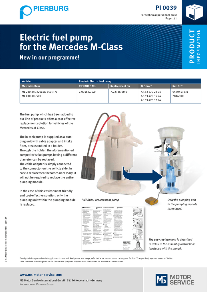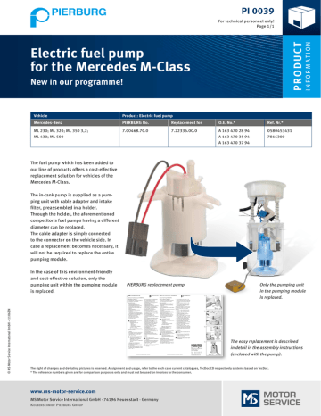 PI 0039 ProduCt I n f o r m at i o n For technical personnel only! Page 1/1 Electric fuel pump for the Mercedes M-Class New in our programme! Vehicle Product: Electric fuel pump Mercedes-Benz PIERBURG No. Replacement for O.E. No.* Ref. Nr.* ML 230; ML 320; ML 350 3,7; ML 430; ML 500 7.00468.70.0 7.22336.00.0 A 163 470 28 94 A 163 470 35 94 A 163 470 37 94 0580453431 7816300 The fuel pump which has been added to our line of products offers a cost-effective replacement solution for vehicles of the Mercedes M-Class. The in-tank pump is supplied as a pumping unit with cable adapter and intake filter, preassembled in a holder. Through the holder, the aforementioned competitor’s fuel pumps having a different diameter can be replaced. The cable adapter is simply connected to the connector on the vehicle side. In case a replacement becomes necessary, it will not be required to replace the entire pumping module. In the case of this environment-friendly and cost-effective solution, only the pumping unit within the pumping module is replaced. PIERBURG replacement pump Only the pumping unit in the pumping module © MS Motor Service International GmbH – 1106 EN is replaced. The easy replacement is described in detail in the assembly instructions (enclosed with the pump). The right of changes and deviating pictures is reserved. Assignment and usage, refer to the each case current catalogues, TecDoc CD respectively systems based on TecDoc. * The reference numbers given are for comparison purposes only and must not be used on invoices to the consumer. www.ms-motor-service.com MS Motor Service International GmbH · 74196 Neuenstadt · Germany Kolbenschmidt Pierburg Group