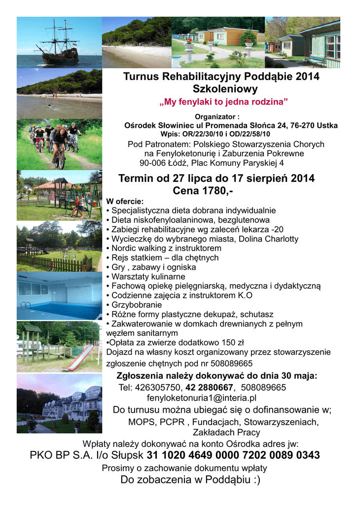 Turnus Rehabilitacyjny Poddąbie 2014 Szkoleniowy „My fenylaki to jedna rodzina” Organizator : Ośrodek Słowiniec ul Promenada Słońca 24, 76-270 Ustka Wpis: OR/22/30/10 i OD/22/58/10 Pod Patronatem: Polskiego Stowarzyszenia Chorych na Fenyloketonurię i Zaburzenia Pokrewne 90-006 Łódź, Plac Komuny Paryskiej 4 Termin od 27 lipca do 17 sierpień 2014 Cena 1780,W ofercie: Specjalistyczna dieta dobrana indywidualnie Dieta niskofenyloalaninowa, bezglutenowa ● Zabiegi rehabilitacyjne wg zaleceń lekarza -20 ● Wycieczkę do wybranego miasta, Dolina Charlotty ● Nordic walking z instruktorem ● Rejs statkiem – dla chętnych ● Gry , zabawy i ogniska ● Warsztaty kulinarne ● Fachową opiekę pielęgniarską, medyczna i dydaktyczną ● Codzienne zajęcia z instruktorem K.O ● Grzybobranie ● Różne formy plastyczne dekupaż, schutasz ● Zakwaterowanie w domkach drewnianych z pełnym węzłem sanitarnym ●Opłata za zwierze dodatkowo 150 zł Dojazd na własny koszt organizowany przez stowarzyszenie zgłoszenie chętnych pod nr 508089665 ● ● Zgłoszenia należy dokonywać do dnia 30 maja: Tel: 426305750, 42 2880667, 508089665 [email protected] Do turnusu można ubiegać się o dofinansowanie w; MOPS, PCPR , Fundacjach, Stowarzyszeniach, Zakładach Pracy Wpłaty należy dokonywać na konto Ośrodka adres jw: PKO BP S.A. I/o Słupsk 31 1020 4649 0000 7202 0089 0343 Prosimy o zachowanie dokumentu wpłaty Do zobaczenia w Poddąbiu :)