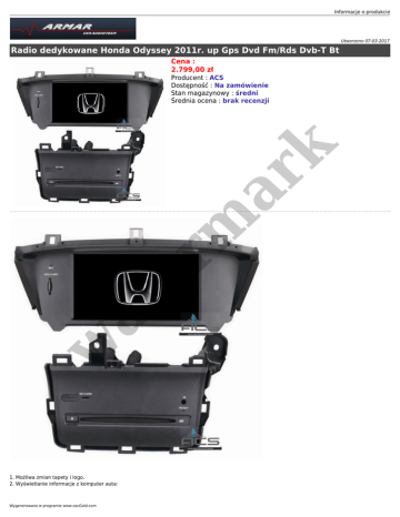 Radio dedykowane Honda Odyssey 2011r. up Gps Dvd Fm/Rds Dvb