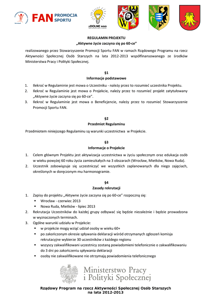 REGULAMIN PROJEKTU „Aktywne życie zaczyna się po 60-ce” realizowanego przez Stowarzyszenie Promocji Sportu FAN w ramach Rządowego Programu na rzecz Aktywności Społecznej Osób Starszych na lata 2012-2013 współfinansowanego ze środków Ministerstwa Pracy i Polityki Społecznej. §1 Informacje podstawowe 1. 2. 3. Ilekroć w Regulaminie jest mowa o Uczestniku - należy przez to rozumieć uczestnika Projektu. Ilekroć w Regulaminie jest mowa o Projekcie, należy przez to rozumieć projekt zatytułowany „Aktywne życie zaczyna się po 60-ce”. Ilekroć w Regulaminie jest mowa o Beneficjencie, należy przez to rozumieć Stowarzyszenie Promocji Sportu FAN. §2 Przedmiot Regulaminu Przedmiotem niniejszego Regulaminu są warunki uczestnictwa w Projekcie. §3 Informacje o Projekcie 1. 2. Celem głównym Projektu jest aktywizacja uczestnictwa w życiu społecznym oraz edukacja osób w wieku powyżej 60 roku życia zamieszkałych na 3 obszarach (Wrocław, Mietków, Nowa Ruda). Uczestnik zobowiązuje się uczestniczyć we wszystkich zaplanowanych dla niego zajęciach, określonych w doręczonym mu harmonogramie. §4 Zasady rekrutacji 1. 2. 3. Zapisy do projektu „Aktywne życie zaczyna się po 60-ce” rozpoczną się: Wrocław - czerwiec 2013 Nowa Ruda, Mietków - lipiec 2013 Rekrutacja Uczestników do każdej grupy odbywać się będzie niezależnie i będzie prowadzona w wyznaczonych terminach. Ogólne warunki udziału w Projekcie: w projekcie mogą wziąć udział osoby w wieku 60+ po zakończonym okresie spływania deklaracji wśród otrzymanych zgłoszeń komisja rekrutacyjne wybierze 30 uczestników z każdego regionu wszyscy zakwalifikowani uczestnicy zostaną powiadomieni telefonicznie o zakwalifikowaniu do 3 dni po zakończeniu spływania deklaracji osoby nie zakwalifikowane nie otrzymają powiadomienia telefonicznego 4. Każdy Uczestnik musi przejść kolejne etapy rekrutacji: REJESTRACJA - zapisać się na szkolenie można na dwa sposoby o W przypadku nie posiadania adresu e-mail (elektronicznej skrzynki pocztowej) należy pobrać ze strony FORMULARZ REJESTRACJA - ZGŁOSZENIE, wydrukować, wypełnić oraz wysłać na podany numer faksu lub złożyć do danego biura regionalnego o W przypadku posiadania adresu e-mail należy udać się do biura regionalnego, gdzie dostępne będą deklaracje należy pobrać ze strony FORMULARZ REJESTRACJA ZGŁOSZENIE, wydrukować, wypełnić oraz wysłać na podany numer faksu lub złożyć do danego biura regionalnego Osoby zakwalifikowane otrzymają potwierdzenie telefoniczne do 3 dni roboczych po ukończeniu procesu spływania deklaracji. WYKREŚLENIE Z LISTY PODSTAWOWEJ o W przypadku braku kontaktu z osobą zakwalifikowaną zostaje ona automatycznie skreślona z listy uczestników. Na jej miejsce przyjmowana jest osoba z listy rezerwowej. §5 Obowiązki Uczestnika Projektu 1. 2. 3. 4. 5. Uczestnicy Projektu mają obowiązek udziału w 80% szkoleń w pełnym wymiarze czasowym przewidzianym dla określonego szkolenia/kursu Obecność na szkoleniu dokumentowana jest własnoręcznym podpisem Uczestnika, oddzielnie dla każdego dnia szkolenia. Obiór materiałów szkoleniowych jest potwierdzany pierwszego dnia szkolenia. Uczestnicy mają obowiązek współpracy z beneficjentem w pełnym zakresie wynikającym z udziału w projekcie, a w szczególności w zakresie badań rezultatów Projektu w czasie trwania Projektu i po jego zakończeniu. Uczestnicy mają obowiązek bieżącego informowania Beneficjenta o wszystkich zdarzeniach mogących zakłócić ich dalszy udział w Projekcie. Uczestnik może zostać skreślony z listy uczestników Projektu w przypadku naruszenia postanowień niniejszego Regulaminu. Decyzję o skreśleniu z listy Uczestników podejmuje Koordynator Projektu. §6 Postanowienia końcowe 1. 2. 3. Regulamin wchodzi w życie z dniem zatwierdzenia. Regulamin obowiązuje do dnia zakończenia projektu, tj. 31.12.2013 r. Beneficjent zastrzega sobie prawo do zmiany regulaminu w przypadku zaistnienia okoliczności to uzasadniających, w szczególności w przypadku zmiany zapisów Projektu.