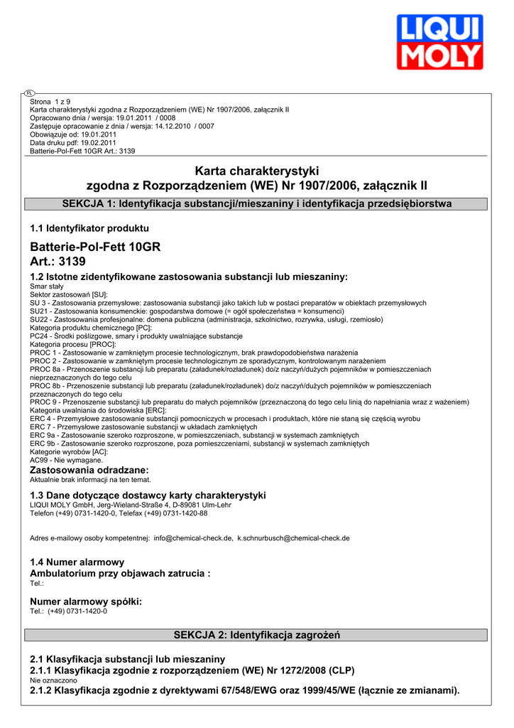 Strona 1 z 9 Karta charakterystyki zgodna z Rozporządzeniem (WE) Nr 1907/2006, załącznik II Opracowano dnia / wersja: 19.01.2011 / 0008 Zastępuje opracowanie z dnia / wersja: 14.12.2010 / 0007 Obowiązuje od: 19.01.2011 Data druku pdf: 19.02.2011 Batterie-Pol-Fett 10GR Art.: 3139 Karta charakterystyki zgodna z Rozporządzeniem (WE) Nr 1907/2006, załącznik II SEKCJA 1: Identyfikacja substancji/mieszaniny i identyfikacja przedsiębiorstwa 1.1 Identyfikator produktu Batterie-Pol-Fett 10GR Art.: 3139 1.2 Istotne zidentyfikowane zastosowania substancji lub mieszaniny: Smar stały Sektor zastosowań [SU]: SU 3 - Zastosowania przemysłowe: zastosowania substancji jako takich lub w postaci preparatów w obiektach przemysłowych SU21 - Zastosowania konsumenckie: gospodarstwa domowe (= ogół społeczeństwa = konsumenci) SU22 - Zastosowania profesjonalne: domena publiczna (administracja, szkolnictwo, rozrywka, usługi, rzemiosło) Kategoria produktu chemicznego [PC]: PC24 - Środki poślizgowe, smary i produkty uwalniające substancje Kategoria procesu [PROC]: PROC 1 - Zastosowanie w zamkniętym procesie technologicznym, brak prawdopodobieństwa narażenia PROC 2 - Zastosowanie w zamkniętym procesie technologicznym ze sporadycznym, kontrolowanym narażeniem PROC 8a - Przenoszenie substancji lub preparatu (załadunek/rozładunek) do/z naczyń/dużych pojemników w pomieszczeniach nieprzeznaczonych do tego celu PROC 8b - Przenoszenie substancji lub preparatu (załadunek/rozładunek) do/z naczyń/dużych pojemników w pomieszczeniach przeznaczonych do tego celu PROC 9 - Przenoszenie substancji lub preparatu do małych pojemników (przeznaczoną do tego celu linią do napełniania wraz z ważeniem) Kategoria uwalniania do środowiska [ERC]: ERC 4 - Przemysłowe zastosowanie substancji pomocniczych w procesach i produktach, które nie staną się częścią wyrobu ERC 7 - Przemysłowe zastosowanie substancji w układach zamkniętych ERC 9a - Zastosowanie szeroko rozproszone, w pomieszczeniach, substancji w systemach zamkniętych ERC 9b - Zastosowanie szeroko rozproszone, poza pomieszczeniami, substancji w systemach zamkniętych Kategorie wyrobów [AC]: AC99 - Nie wymagane. Zastosowania odradzane: Aktualnie brak informacji na ten temat. 1.3 Dane dotyczące dostawcy karty charakterystyki LIQUI MOLY GmbH, Jerg-Wieland-Straße 4, D-89081 Ulm-Lehr Telefon (+49) 0731-1420-0, Telefax (+49) 0731-1420-88 Adres e-mailowy osoby kompetentnej: [email protected], [email protected] 1.4 Numer alarmowy Ambulatorium przy objawach zatrucia : Tel.: Numer alarmowy spółki: Tel.: (+49) 0731-1420-0 SEKCJA 2: Identyfikacja zagrożeń 2.1 Klasyfikacja substancji lub mieszaniny 2.1.1 Klasyfikacja zgodnie z rozporządzeniem (WE) Nr 1272/2008 (CLP) Nie oznaczono 2.1.2 Klasyfikacja zgodnie z dyrektywami 67/548/EWG oraz 1999/45/WE (łącznie ze zmianami). Strona 2 z 9 Karta charakterystyki zgodna z Rozporządzeniem (WE) Nr 1907/2006, załącznik II Opracowano dnia / wersja: 19.01.2011 / 0008 Zastępuje opracowanie z dnia / wersja: 14.12.2010 / 0007 Obowiązuje od: 19.01.2011 Data druku pdf: 19.02.2011 Batterie-Pol-Fett 10GR Art.: 3139 Zgodnie z dyrektywą 1999/45/WE mieszanina nie została sklasyfikowana jako niebezpieczna. 2.2 Elementy oznakowania 2.2.1 Oznakowanie zgodnie z rozporządzeniem (WE) Nr 1272/2008 (CLP) Nie oznaczono 2.2.2 Oznakowanie według Dyrektyw 67/548/EWG oraz 1999/45/WE (z dalszymi zmianami). Symbol ostrzegawczy: Odpada Określenia niebezpieczeństwa: --Określenia zagrożeń (R): Określenia dotyczące prawidłowego postępowania (S): Dodatki: n.s. 2.3 Inne zagrożenia Mieszanina nie zawiera substancji vPvB (vPvB = very persistent, very bioaccumulative). Mieszanina nie zawiera substancji PBT (PBT = persistent, bioaccumulative, toxic) SEKCJA 3: Skład/informacja o składnikach 3.1 Substancja n.s. 3.2 Mieszanina -Numer rejestracji (ECHA) Index EINECS, ELINCS CAS Stęż.% Symbol ostrze-gawczy Zwroty R Kategorie klasyfikacji / wskazania zagrożeń Klasa zagrożenia/Kategoria zagrożenia --- --Zwrot okreolający zagrożenie --- SEKCJA 4: Środki pierwszej pomocy 4.1 Opis środków pierwszej pomocy Drogi oddechowe Osobę usunąć z zagrożonej strefy. Osobie zapewnić dopływ świeżego powietrza, w zależności od objawów skonsultować się z lekarzem. Kontakt ze skórą Resztki produktu zebrać ostrożnie miękką, suchą ścierką. Zanieczyszczone, nasączone ubranie należy niezwłocznie zdjąć, dokładnie wyprać w wodzie z mydłem, w razie podrażnienia skóry (zaczerwienienie itd.), zasięgnać porady lekarskiej. Kontakt z oczami Usunąć szkła kontaktowe. Przez kilka minut dokładnie spłukać dużą ilością wody, jeżeli potrzeba, udać się do lekarza. Drogi pokarmowe Jamę ustną dokładnie przepłukać wodą. Nie wywoływać wymiotów, natychmiast udać się do lekarza. 4.2 Najważniejsze ostre i opóźnione objawy oraz skutki narażenia Patrz także sekcja 11. i/lub 4.1. Mogą wystąpić: Strona 3 z 9 Karta charakterystyki zgodna z Rozporządzeniem (WE) Nr 1907/2006, załącznik II Opracowano dnia / wersja: 19.01.2011 / 0008 Zastępuje opracowanie z dnia / wersja: 14.12.2010 / 0007 Obowiązuje od: 19.01.2011 Data druku pdf: 19.02.2011 Batterie-Pol-Fett 10GR Art.: 3139 Wysuszenie skóry. Dermatitis (zapalenie skóry) 4.3 Wskazania dotyczące wszelkiej natychmiastowej pomocy lekarskiej i szczególnego postępowania z poszkodowanym n.b. SEKCJA 5: Postępowanie w przypadku pożaru 5.1 Środki gaśnicze Odpowiednie środki gaśnicze Dwutlenek wegla (CO2). Piana. Suchy środek gaśniczy. Niewłaściwe środki gaśnicze Woda. 5.2 Szczególne zagrożenia związane z substancją lub mieszaniną W przypadku pożaru mogą powstać: Tlenki węgla Tlenki siarki Toksyczne produkty rozkładu termicznego. 5.3 Informacje dla straży pożarnej Nie wdychać dymów powstających w wyniku pożaru lub wybuchu. Sprzęt ochrony dróg oddechowych niezależny od powietrza otoczenia. Według wielkości pożaru W raz