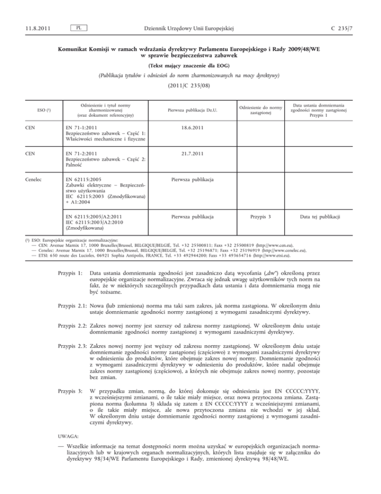 11.8.2011 PL Dziennik Urzędowy Unii Europejskiej C 235/7 Komunikat Komisji w ramach wdrażania dyrektywy Parlamentu Europejskiego i Rady 2009/48/WE w sprawie bezpieczeństwa zabawek (Tekst mający znaczenie dla EOG) (Publikacja tytułów i odniesień do norm zharmonizowanych na mocy dyrektywy) (2011/C 235/08) ESO (1) Odniesienie i tytuł normy zharmonizowanej (oraz dokument referencyjny) Pierwsza publikacja Dz.U. CEN EN 71-1:2011 Bezpieczeństwo zabawek – Część 1: Właściwości mechaniczne i fizyczne 18.6.2011 CEN EN 71-2:2011 Bezpieczeństwo zabawek – Część 2: Palność 21.7.2011 Cenelec EN 62115:2005 Zabawki elektryczne – Bezpieczeń stwo użytkowania IEC 62115:2003 (Zmodyfikowana) + A1:2004 Pierwsza publikacja EN 62115:2005/A2:2011 IEC 62115:2003/A2:2010 (Zmodyfikowana) Pierwsza publikacja Odniesienie do normy zastąpionej Data ustania domniemania zgodności normy zastąpionej Przypis 1 Przypis 3 Data tej publikacji (1) ESO: Europejskie organizacje normalizacyjne: — CEN: Avenue Marnix 17, 1000 Bruxelles/Brussel, BELGIQUE/BELGIË, Tel. +32 25500811; Faxs +32 25500819 (http://www.cen.eu), — Cenelec: Avenue Marnix 17, 1000 Bruxelles/Brussel, BELGIQUE/BELGIË, Tel. +32 25196871; Faxs +32 25196919 (http://www.cenelec.eu), — ETSI: 650 route des Lucioles, 06921 Sophia Antipolis, FRANCE, Tel. +33 492944200; Faxs +33 493654716 (http://www.etsi.eu). Przypis 1: Data ustania domniemania zgodności jest zasadniczo datą wycofania („dw”) określoną przez europejskie organizacje normalizacyjne. Zwraca się jednak uwagę użytkowników tych norm na fakt, że w niektórych szczególnych przypadkach data ustania i data domniemania mogą nie być tożsame. Przypis 2.1: Nowa (lub zmieniona) norma ma taki sam zakres, jak norma zastąpiona. W określonym dniu ustaje domniemanie zgodności normy zastąpionej z wymogami zasadniczymi dyrektywy. Przypis 2.2: Zakres nowej normy jest szerszy od zakresu normy zastąpionej. W określonym dniu ustaje domniemanie zgodności normy zastąpionej z wymogami zasadniczymi dyrektywy. Przypis 2.3: Zakres nowej normy jest węższy od zakresu normy zastąpionej. W określonym dniu ustaje domniemanie zgodności normy zastąpionej (częściowo) z wymogami zasadniczymi dyrektywy w odniesieniu do produktów, które obejmuje zakres nowej normy. Domniemanie zgodności z wymogami zasadniczymi dyrektywy w odniesieniu do produktów, które nadal obejmuje zakres normy zastąpionej (częściowo), a których nie obejmuje zakres nowej normy, pozostaje bez zmian. Przypis 3: W przypadku zmian, normą, do której dokonuje się odniesienia jest EN CCCCC:YYYY, z wcześniejszymi zmianami, o ile takie miały miejsce, oraz nowa przytoczona zmiana. Zastą piona norma (kolumna 3) składa się zatem z EN CCCCC:YYYY z wcześniejszymi zmianami, o ile takie miały miejsce, ale nowa przytoczona zmiana nie wchodzi w jej skład. W określonym dniu ustaje domniemanie zgodności normy zastąpionej z wymogami zasadni czymi dyrektywy. UWAGA: — Wszelkie informacje na temat dostępności norm można uzyskać w europejskich organizacjach norma lizacyjnych lub w krajowych organach normalizacyjnych, których lista znajduje się w załączniku do dyrektywy 98/34/WE Parlamentu Europejskiego i Rady, zmienionej dyrektywą 98/48/WE. C 235/8 PL Dziennik Urzędowy Unii Europejskiej — Europejskie organizacje normalizacyjne przyjmują zharmonizowane normy w języku angielskim (CEN i Cenelec publikują je również w języku francuskim i niemieckim). Następnie krajowe organy norma lizacyjne tłumaczą tytuły zharmonizowanych norm na wszystkie pozostałe wymagane języki urzędowe Unii Europejskiej. Komisja Europejska nie ponosi odpowiedzialności za poprawność tytułów zgłoszo nych do publikacji w Dzienniku Urzędowym. — Publikacja odniesień w Dzienniku Urzędowym Unii Europejskiej nie oznacza, że normy są dostępne we wszystkich językach Wspólnoty. — Lista ta zastępuje wszystkie poprzednie listy opublikowane w Dzienniku Urzędowym Unii Europejskiej. Komisja czuwa nad uaktualnianiem listy. — Więcej informacji na temat zharmonizowanych norm można uzyskać pod następującym adresem: http://ec.europa.eu/enterprise/policies/european-standards/harmonised-standards/index_en.htm DECYZJA O ZAMKNIĘCIU FORMALNEGO POSTĘPOWANIA WYJAŚNIAJĄCEGO WSKUTEK WYCOFANIA ZGŁOSZENIA PRZEZ PAŃSTWO CZŁONKOWSKIE Pomoc państwa – Estonia (Artykuły 107–109 Traktatu o funkcjonowaniu Unii Europejskiej) Zawiadomienie Komisji zgodnie z art. 108 ust. 2 TFUE – wycofanie zgłoszenia Pomoc państwa C SA.30531 (11/C) (ex N 78/10) – Pomoc w formie płatności za moc przeznaczoną do produkcji energii elektrycznej z łupków bitumicznych (Tekst mający znaczenie dla EOG) (2011/C 235/09) Komisja podjęła decyzję o zamknięciu formalnego postępowania wyjaśniającego na mocy art. 108 ust. 2 TFUE, wszczętego dnia 23 marca 2011 r. w odniesieniu do powyższego środka pomocy, ponieważ Estonia wycofała swoje zgłoszenie dnia 23 maja 2011 r. 11.8.2011