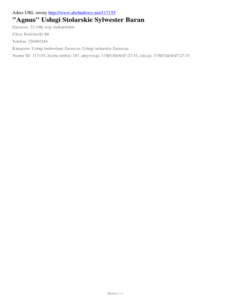 Adres URL strony http://www.abcbudowy.net/117155 "Agnus" Usługi Stolarskie Sylwester Baran Zarzecze, 32-340, woj. małopolskie Ulica: Kościuszki 80 Telefon: 326465244 Kategorie: Usługi budowlane Zarzecze, Usługi stolarskie Zarzecze Numer ID: 117155, liczba odsłon: 187, aktywacja: 17/05/2010 07:27:53, edycja: 17/05/2010 07:27:53 Strona 1 / 1