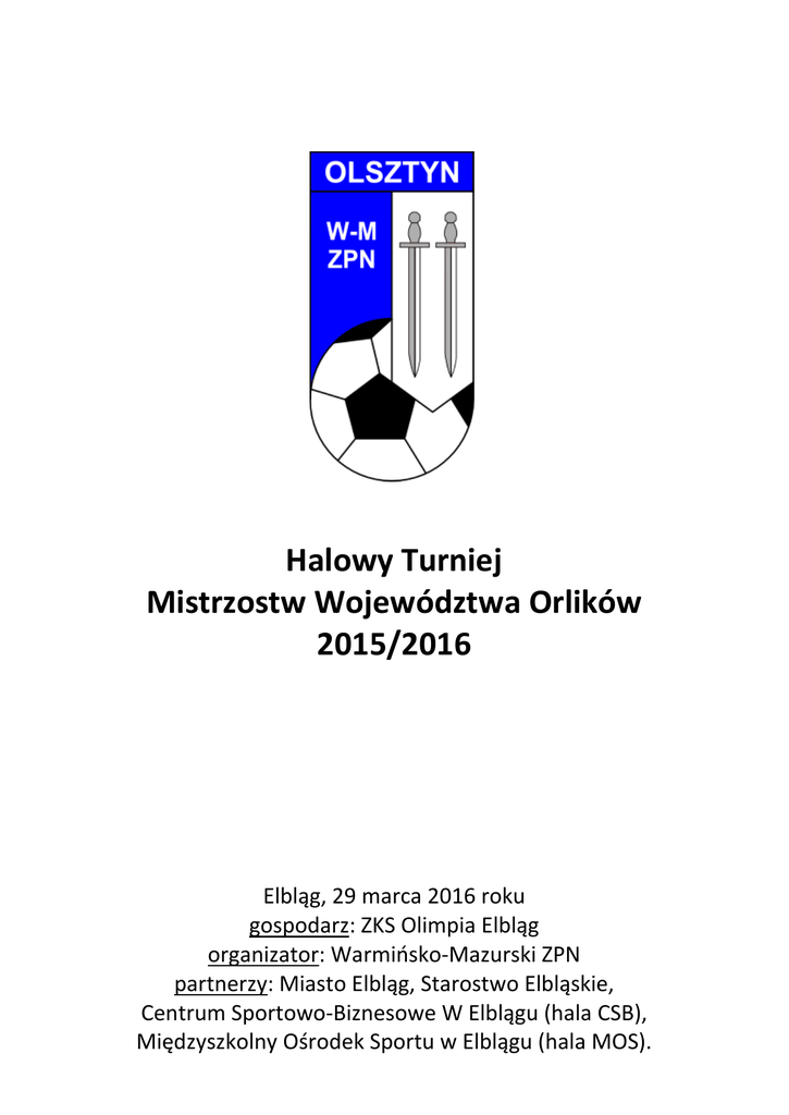 Halowy Turniej Mistrzostw Województwa Orlików 2015/2016 Elbląg, 29 marca 2016 roku gospodarz: ZKS Olimpia Elbląg organizator: Warmińsko-Mazurski ZPN partnerzy: Miasto Elbląg, Starostwo Elbląskie, Centrum Sportowo-Biznesowe W Elblągu (hala CSB), Międzyszkolny Ośrodek Sportu w Elblągu (hala MOS). Uczestnicy Halowych Mistrzostw: GKS LZS Wikielec AP Stomil I Olsztyn AP Stomil II Olsztyn KKS Granica Kętrzyn KS Constract I Lubawa KS Polonia I Pasłęk LKS Agat Jegłownik MKS Huragan I Morąg MKS Mrągowia I Mrągowo MKS Mrągowia II Mrągowo MMKS Concordia I Elbląg OKS Sokół I Ostróda OKS Sokół II Ostróda RKS Orlęta Rema I Reszel SMP Żuri II Olsztyn UKS Jedynka I Nidzica UKS Naki I Olsztyn UKS Naki II Olsztyn ZKS Olimpia IV Elbląg ZKS Olimpia I Elbląg Miejsce rozgrywania meczów Hala A – Hala Widowiskowo-Sportowa CSB (al. Grunwaldzka 135, Elbląg) Hala B – Hala Widowiskowo-Sportowa MOS (ul. Kościuszki 77A, Elbląg) Ważne informacje i zasady gry Zawodnicy o o o o chłopcy i dziewczęta z roczników 2005, 2006, 2007 buty: z płaską i jasną podeszwą, ochraniacze goleni: obowiązkowe obowiązkowo dokument tożsamości ze zdjęciem (np. legitymacja szkolna) obowiązkowo karta zdrowia (ewentualnie lista zbiorcza na dany turniej) Zasady gry o ilość zawodników 5 (4+1), rezerw. max 5 (w sumie max 10), zmiany powrotne o odległość muru: 5 m o kary czasowe: żółta kartka – 1 min., czerwona kartka – 2 min i zakaz gry do końca meczu o czas gry: 1 x 8min. bez przerwy (dogrywka - karne po 3) Harmonogram 9:30 – Rejestracja drużyn 10:00-13:20 – Mecze grup eliminacyjnych (Hala A i B) 12:30-15:30 – Otwarta stołówka obiadowa 13:30-15:00 – Mecze grup mistrzowskich (Hala A i B) 15:30-16:20 – Mecze ćwierćfinałowe 16:20 – Pierwszy półfinał 16:40 – Drugi półfinał 17:00 – Mecz o 3. miejsce 17:20 – Finał 17:40 – Zakończenie Turnieju UWAGA: obiad dla uczestników będzie wydawany w Restauracji ARENA na hali CSB w godzinach od 13.00 do 15.30 za okazaniem TALONU otrzymanego przy rejestracji. GRUPY ELIMINACYJNE LP GRUPA A GRUPA B GRUPA C GRUPA D 1 2 3 4 5 A1 A2 A3 A4 A5 B1 B2 B3 B4 B5 C1 C2 C3 C4 C5 D1 D2 D3 D4 D5 MECZE GRUP ELMINACYJNYCH HALA A HALA B LP drużyna1 drużyna2 godzina drużyna1 drużyna2 1 2 3 4 5 6 7 8 9 10 11 12 13 14 15 16 17 18 19 20 A1 B1 A3 B3 A5 B5 A2 B2 A4 B4 A1 B1 A2 B2 A1 B1 A3 B3 A2 B2 A2 B2 A4 B4 A1 B1 A3 B3 A5 B5 A3 B3 A5 B5 A4 B4 A5 B5 A4 B4 10:00 10:10 10:20 10:30 10:40 10:50 11:00 11:10 11:20 11:30 11:40 11:50 12:00 12:10 12:20 12:30 12:40 12:50 13:00 13:10 C1 D1 C3 D3 C5 D5 C2 D2 C4 D4 C1 D1 C2 D2 C1 D1 C3 D3 C2 D2 C2 D2 C4 D4 C1 D1 C3 D3 C5 D5 C3 D3 C5 D5 C4 D4 C5 D5 C4 D4 GRUPY MISTRZOWSKIE LP GRUPA E GRUPA F 1 2 3 4 5 6 1. miejsce GR A 2. miejsce GR A 3. miejsce GR A 1. miejsce GR B 2. miejsce GR B 3. miejsce GR B 1. miejsce GR C 2. miejsce GR C 3. miejsce GR C 1. miejsce GR D 2. miejsce GR D 3. miejsce GR D MECZE GRUP MISTRZOWSKICH HALA A HALA B LP drużyna1 drużyna2 godzina drużyna1 drużyna2 21 22 23 24 25 26 27 28 29 1. miejsce GR A 2. miejsce GR A 3. miejsce GR A 1. miejsce GR A 2. miejsce GR A 3. miejsce GR A 1. miejsce GR A 2. miejsce GR A 3. miejsce GR A 1. miejsce GR B 2. miejsce GR B 3. miejsce GR B 2. miejsce GR B 3. miejsce GR B 1. miejsce GR B 3. miejsce GR B 1. miejsce GR B 2. miejsce GR B 13:30 13:40 13:50 14:00 14:10 14:20 14:30 14:40 14:50 1. miejsce GR C 2. miejsce GR C 3. miejsce GR C 1. miejsce GR C 2. miejsce GR C 3. miejsce GR C 1. miejsce GR C 2. miejsce GR C 3. miejsce GR C 1. miejsce GR D 2. miejsce GR D 3. miejsce GR D 2. miejsce GR D 3. miejsce GR D 1. miejsce GR D 3. miejsce GR D 1. miejsce GR D 2. miejsce GR D MECZE FINAŁOWE HALA A LP drużyna1 drużyna2 godzina 30 31 32 33 34 35 36 37 4. miejsce GR E 3. miejsce GR E 2. miejsce GR E 1. miejsce GR E zwycięzca meczu 30 zwycięzca meczu 31 przegrany meczu 34 zwycięzca meczu 34 1. miejsce GR F 2. miejsce GR F 3. miejsce GR F 4. miejsce GR F zwycięzca meczu 32 zwycięzca meczu 34 przegrany meczu 35 zwycięzca meczu 35 15:30 15:40 15:50 16:00 16:20 16:40 17:00 17:20 mecz o ćwierćfinały półfinały III miejsce I miejsce