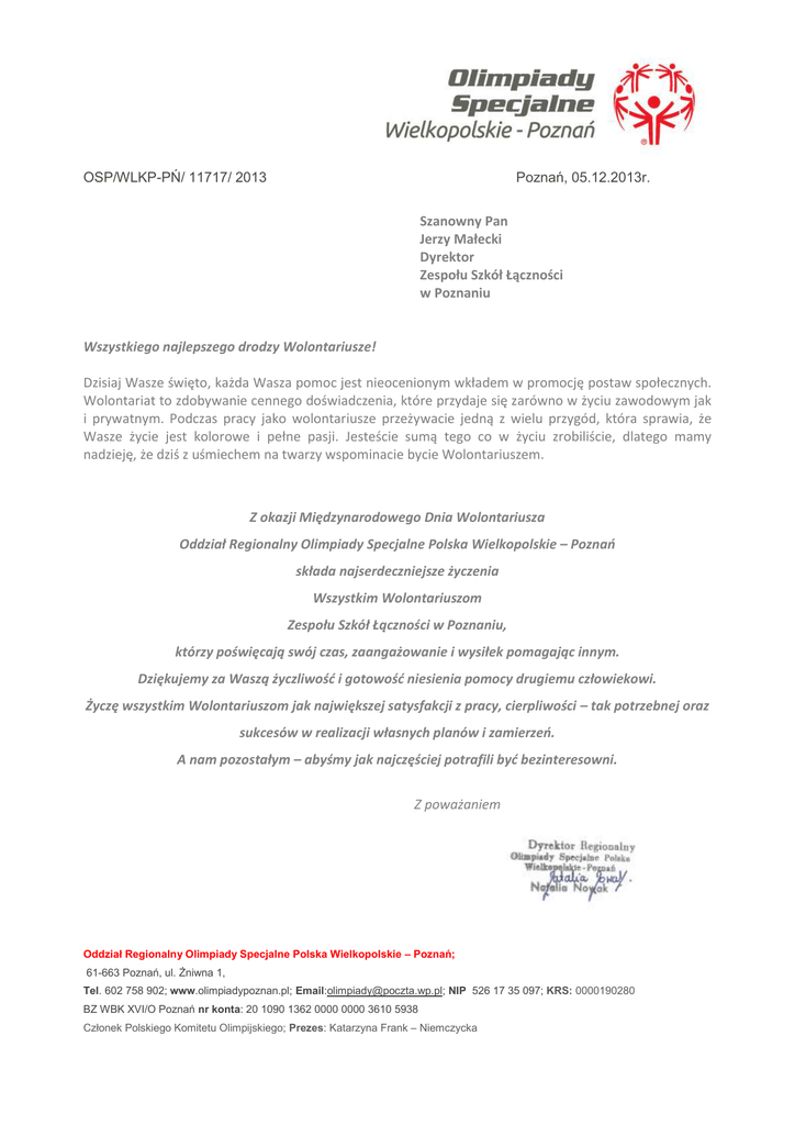 Poznań, 05.12.2013r. OSP/WLKP-PŃ/ 11717/ 2013 Szanowny Pan Jerzy Małecki Dyrektor Zespołu Szkół Łączności w Poznaniu Wszystkiego najlepszego drodzy Wolontariusze! Dzisiaj Wasze święto, każda Wasza pomoc jest nieocenionym wkładem w promocję postaw społecznych. Wolontariat to zdobywanie cennego doświadczenia, które przydaje się zarówno w życiu zawodowym jak i prywatnym. Podczas pracy jako wolontariusze przeżywacie jedną z wielu przygód, która sprawia, że Wasze życie jest kolorowe i pełne pasji. Jesteście sumą tego co w życiu zrobiliście, dlatego mamy nadzieję, że dziś z uśmiechem na twarzy wspominacie bycie Wolontariuszem. Z okazji Międzynarodowego Dnia Wolontariusza Oddział Regionalny Olimpiady Specjalne Polska Wielkopolskie – Poznań składa najserdeczniejsze życzenia Wszystkim Wolontariuszom Zespołu Szkół Łączności w Poznaniu, którzy poświęcają swój czas, zaangażowanie i wysiłek pomagając innym. Dziękujemy za Waszą życzliwość i gotowość niesienia pomocy drugiemu człowiekowi. Życzę wszystkim Wolontariuszom jak największej satysfakcji z pracy, cierpliwości – tak potrzebnej oraz sukcesów w realizacji własnych planów i zamierzeń. A nam pozostałym – abyśmy jak najczęściej potrafili być bezinteresowni. Z poważaniem Oddział Regionalny Olimpiady Specjalne Polska Wielkopolskie – Poznań; 61-663 Poznań, ul. Żniwna 1, Tel. 602 758 902; www.olimpiadypoznan.pl; Email:[email protected]; NIP 526 17 35 097; KRS: 0000190280 BZ WBK XVI/O Poznań nr konta: 20 1090 1362 0000 0000 3610 5938 Członek Polskiego Komitetu Olimpijskiego; Prezes: Katarzyna Frank – Niemczycka