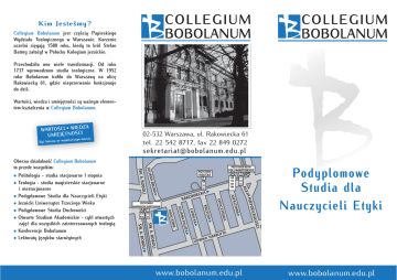 Kim Jesteśmy? Collegium Bobolanum jest częścią Papieskiego Wydziału Teologicznego w Warszawie. Korzenie uczelni sięgają 1580 roku, kiedy to król Stefan Batory założył w Połocku Kolegium jezuickie. Przechodziło ono wiele transformacji. Od roku 1737 wprowadzono studia teologiczne. W 1952 roku Bobolanum trafiło do Warszawy na ulicę Rakowiecką 61, gdzie nieprzerwanie funkcjonuje do dziś. Wartości, wiedza i umiejętności są ważnym elementem kształcenia w Collegium Bobolanum. DZA WARTOŚCI • WIE I ŚC O UMIEJĘTN e ółczesnym świeci Być liderem we wsp 02-532 Warszawa, ul. Rakowiecka 61 tel. 22 542 8717, fax 22 849 0272 [email protected] KIELECKA T I SK A ► OŚCI LEGŁ POD CZYŃ ECKA Podyplomowe Studia dla Nauczycieli Etyki I BOBOL A BUTT NAR I► BOBOL LU KA DWI A► LTOW OP O KIEL CKA► A JOW ŚW. A. ŚW. A. A► AŁAT NA F I ŁOW T AKAC A 119 17 N36 41 JULIA PRZYSTANEK RAKOWIECKA SANKTUARIUM ► M IE JA N ECKA WI RAKO T 17 33 41 ALE 17 33 41 A 168 174 195 700 ASFA ► RUNA NA B JULIA PRZYSTANEK METRO POLE MOKOTOWSKIE PRZYSTANEK BOBOL • Politologia - studia stacjonarne I stopnia • Teologia - studia magisterskie stacjonarne i niestacjonarne • Podyplomowe Studia dla Nauczycieli Etyki • Jezuicki Uniwersytet Trzeciego Wieku • Podyplomowe Studia Duchowości • Otwarte Studium Akademickie - cykl otwartych zajęć dla wszystkich zainteresowanych teologią • Konferencje Bobolanum • Lektoraty języków starożytnych ŚW. A. Obecna działalność Collegium Bobolanum to przede wszystkim: www.bobolanum.edu.pl www.bobolanum.edu.pl