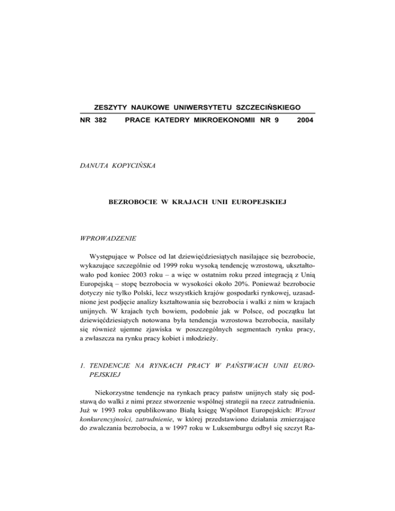 ZESZYTY NAUKOWE UNIWERSYTETU SZCZECIŃSKIEGO NR 382 PRACE KATEDRY MIKROEKONOMII NR 9 2004 DANUTA KOPYCIŃSKA BEZROBOCIE W KRAJACH UNII EUROPEJSKIEJ WPROWADZENIE Występujące w Polsce od lat dziewięćdziesiątych nasilające się bezrobocie, wykazujące szczególnie od 1999 roku wysoką tendencję wzrostową, ukształtowało pod koniec 2003 roku – a więc w ostatnim roku przed integracją z Unią Europejską – stopę bezrobocia w wysokości około 20%. Ponieważ bezrobocie dotyczy nie tylko Polski, lecz wszystkich krajów gospodarki rynkowej, uzasadnione jest podjęcie analizy kształtowania się bezrobocia i walki z nim w krajach unijnych. W krajach tych bowiem, podobnie jak w Polsce, od początku lat dziewięćdziesiątych notowana była tendencja wzrostowa bezrobocia, nasilały się również ujemne zjawiska w poszczególnych segmentach rynku pracy, a zwłaszcza na rynku pracy kobiet i młodzieży. 1. TENDENCJE NA RYNKACH PRACY W PAŃSTWACH UNII EUROPEJSKIEJ Niekorzystne tendencje na rynkach pracy państw unijnych stały się podstawą do walki z nimi przez stworzenie wspólnej strategii na rzecz zatrudnienia. Już w 1993 roku opublikowano Białą księgę Wspólnot Europejskich: Wzrost konkurencyjności, zatrudnienie, w której przedstawiono działania zmierzające do zwalczania bezrobocia, a w 1997 roku w Luksemburgu odbył się szczyt Ra- 174 Danuta Kopycińska dy Europejskiej poświęcony problemom zatrudnienia. Od tego czasu rozpoczęła się realizacja kompleksowej strategii Unii Europejskiej, zakładającej koordynację polityki zatrudnieniowej państw Wspólnoty na podstawie odpowiednich wytycznych, opracowywanych przez Komisję Europejską, i narodowych planów działania ustalanych przez poszczególne kraje. Europejska strategia zatrudnienia została oparta na czterech filarach1. Filar pierwszy – zdolność do uzyskania zatrudnienia. Cel ten odnosi się do bezrobocia długoterminowego, głównie strukturalnego i bezrobocia wśród młodzieży. W ramach realizacji tego celu państwa Wspólnoty zobowiązały się osiągnąć do 2005 roku zdolność do umożliwienia tak zwanego nowego startu wszystkim młodym ludziom poszukującym pracy przed upływem sześciu miesięcy poszukiwania pracy, a w przypadku osób dorosłych – przed upływem roku. Filar drugi – przedsiębiorczość. Zakłada się, że drogą do zwalczania bezrobocia jest pobudzenie przedsiębiorczości i promowanie samozatrudnienia przez różnego rodzaje ułatwienia stosowane przez państwo. Filar trzeci – zdolność adaptacyjna. Realizacja tego celu zakłada wypracowanie różnorodnych form przystosowawczych do potrzeb rynku pracy zarówno pracowników jak i pracodawców. Filar czwarty – równość szans, zakładający: – likwidację nierównych szans i warunków pracy w przekroju płci, – tworzenie warunków do godzenia życia rodzinnego z zawodowym, – tworzenie warunków do ponownego wejścia na rynek pracy po okresie przerwy, – tworzenie możliwości i odpowiednich warunków do pracy kobiet i mężczyzn. Czy wprowadzona Europejska strategia zatrudnienia przyniosła pozytywne efekty w walce z bezrobociem w poszczególnych krajach Unii Europejskiej? Aby odpowiedzieć na to pytanie, w artykule przeprowadzono analizę zmian w kształtowaniu się bezrobocia w ostatnim roku badawczym, czyli w 2003, w stosunku do roku wprowadzenia strategii, czyli 1997 roku, w ujęciu: – stopy bezrobocia ogółem, – stopy bezrobocia mężczyzn i kobiet, – i stopy bezrobocia młodzieży (do 25. roku życia). 1 Zob. szerzej Przeciwdziałanie bezrobociu w Unii Europejskiej. Urząd Komitetu Integracji Europejskiej, Warszawa 2003. Bezrobocie w krajach Unii Europejskiej 175 Aby możliwe były szersze porównania, przedstawione dane obejmują lata 1992–2003. Ze względu na analizowane wielkości jako kryterium oceny przyjęto wysokość stopy bezrobocia, dlatego dla celów dalszej analizy porównawczej ustalono następujące grupy państw zróżnicowane według tego kryterium2: a) grupa I – obejmuje kraje o niskiej stopie bezrobocia, wynoszącej około 5%, a więc zbliżonej do tak zwanej naturalnej stopy bezrobocia; b) grupa II – kraje o umiarkowanej stopie bezrobocia, wynoszącej od około 6 do około 10%; c) grupa III – obejmuje państwa o dość wysokiej stopie bezrobocia, wynoszącej od około 11 do około 15%; d) grupa IV – państwa charakteryzujące się wysoką stopą bezrobocia, wynoszącą od około 16 do około 20%; e) grupa V – kraje o bardzo wysokiej stopie bezrobocia, wynoszącej powyżej 21%. 2. BEZROBOCIE OGÓŁEM W UNII EUROPEJSKIEJ Kształtowanie się w badanym okresie bezrobocia ogółem w krajach Unii Europejskiej przedstawiono w tabeli 1. Bezrobocie ogółem w Unii Europejskiej w 1997 roku, a więc w roku przyjęcia strategii zatrudnieniowej. Z danych zawartych w tabeli 1 wynika, że stopa bezrobocia ogółem była mocno zróżnicowana i wynosiła od 2,7% Luksemburg do 17% w Hiszpanii. Biorąc pod uwagę ustalone dla celów analizy porównawczej grupy państw, w 1997 roku wszystkie państwa unijne można podzielić na 4 grupy: a) grupa I – do której należały 4 kraje (Luksemburg, Holandia, Austria i Dania) stanowiące 26,7% ogółu państw unijnych ze stopą bezrobocia od 2,7 do 5,2%, a więc zbliżonej do stopy bezrobocia naturalnego; b) grupa II – skupiająca 7 państw unijnych (czyli około 47% ogółu Unii): Belgię, Niemcy, Grecję, Irlandię, Portugalię, Szwecję i Wielką Brytanię, o umiarkowanej stopie bezrobocia, wynoszącej od 6,8 do 9,9%; 2 Przyjęty tu podział na grupy państw ze względu na wysokość stopy bezrobocia jest umowny i służy jedynie do analizy porównawczej. 176 Danuta Kopycińska c) grupa III obejmuje 3 państwa: Francję, Włochy i Finlandię (około 20% ogółu), o dość wysokiej stopie procentowej kształtującej się od 11,8 do 12,7%; d) grupa IV – skupiająca jedno państwo: Hiszpanię (6,7% ogółu), o wysokiej stopie bezrobocia, wyno