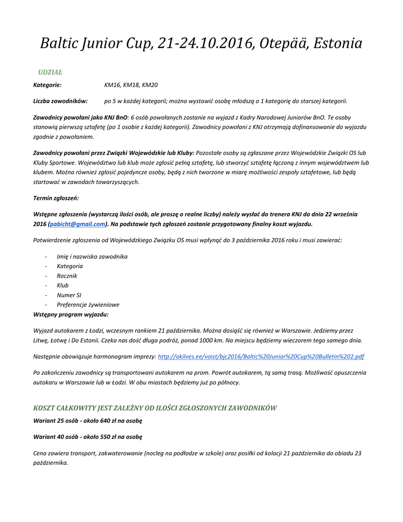 Baltic Junior Cup, 21-24.10.2016, Otepää, Estonia UDZIAŁ Kategorie: KM16, KM18, KM20 Liczba zawodników: po 5 w każdej kategorii; można wystawić osobę młodszą o 1 kategorię do starszej kategorii. Zawodnicy powołani jako KNJ BnO: 6 osób powołanych zostanie na wyjazd z Kadry Narodowej Juniorów BnO. Te osoby stanowią pierwszą sztafetę (po 1 osobie z każdej kategorii). Zawodnicy powołani z KNJ otrzymają dofinansowanie do wyjazdu zgodnie z powołaniem. Zawodnicy powołani przez Związki Wojewódzkie lub Kluby: Pozostałe osoby są zgłaszane przez Wojewódzkie Związki OS lub Kluby Sportowe. Województwo lub klub może zgłosić pełną sztafetę, lub stworzyć sztafetę łączoną z innym województwem lub klubem. Można również zgłosić pojedyncze osoby, będą z nich tworzone w miarę możliwości zespoły sztafetowe, lub będą startować w zawodach towarzyszących. Termin zgłoszeń: Wstępne zgłoszenia (wystarczą ilości osób, ale proszę o realne liczby) należy wysłać do trenera KNJ do dnia 22 września 2016 ([email protected]). Na podstawie tych zgłoszeń zostanie przygotowany finalny koszt wyjazdu. Potwierdzenie zgłoszenia od Wojewódzkiego Związku OS musi wpłynąć do 3 października 2016 roku i musi zawierać: Imię i nazwisko zawodnika Kategoria Rocznik Klub Numer SI Preferencje żywieniowe Wstępny program wyjazdu: Wyjazd autokarem z Łodzi, wczesnym rankiem 21 października. Można dosiąść się również w Warszawie. Jedziemy przez Litwę, Łotwę i Do Estonii. Czeka nas dość długa podróż, ponad 1000 km. Na miejscu będziemy wieczorem tego samego dnia. Następnie obowiązuje harmonogram imprezy: http://okilves.ee/voist/bjc2016/Baltic%20Junior%20Cup%20Bulletin%202.pdf Po zakończeniu zawodnicy są transportowani autokarem na prom. Powrót autokarem, tą samą trasą. Możliwość opuszczenia autokaru w Warszawie lub w Łodzi. W obu miastach będziemy już po północy. KOSZT CAŁKOWITY JEST ZALEŻNY OD ILOŚCI ZGŁOSZONYCH ZAWODNIKÓW Wariant 25 osób - około 640 zł na osobę Wariant 40 osób - około 550 zł na osobę Cena zawiera transport, zakwaterowanie (nocleg na podłodze w szkole) oraz posiłki od kolacji 21 października do obiadu 23 października.